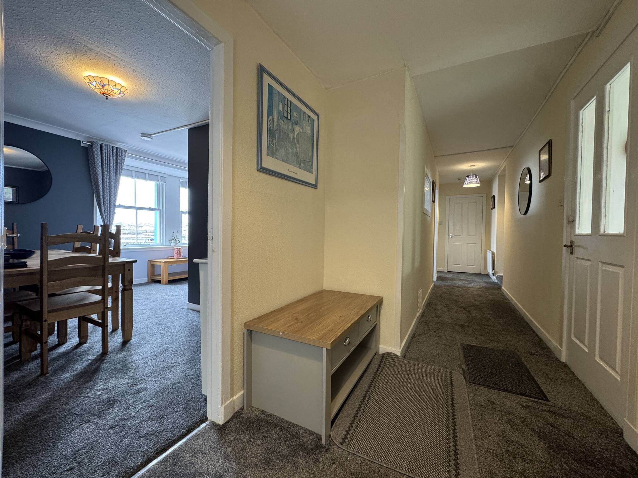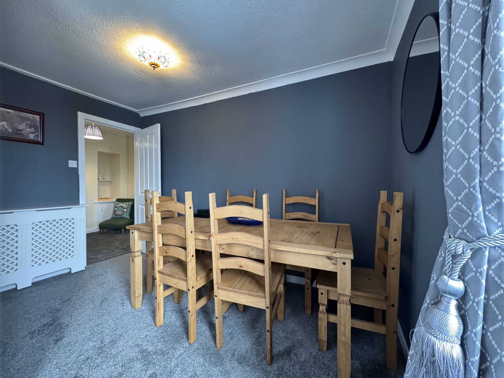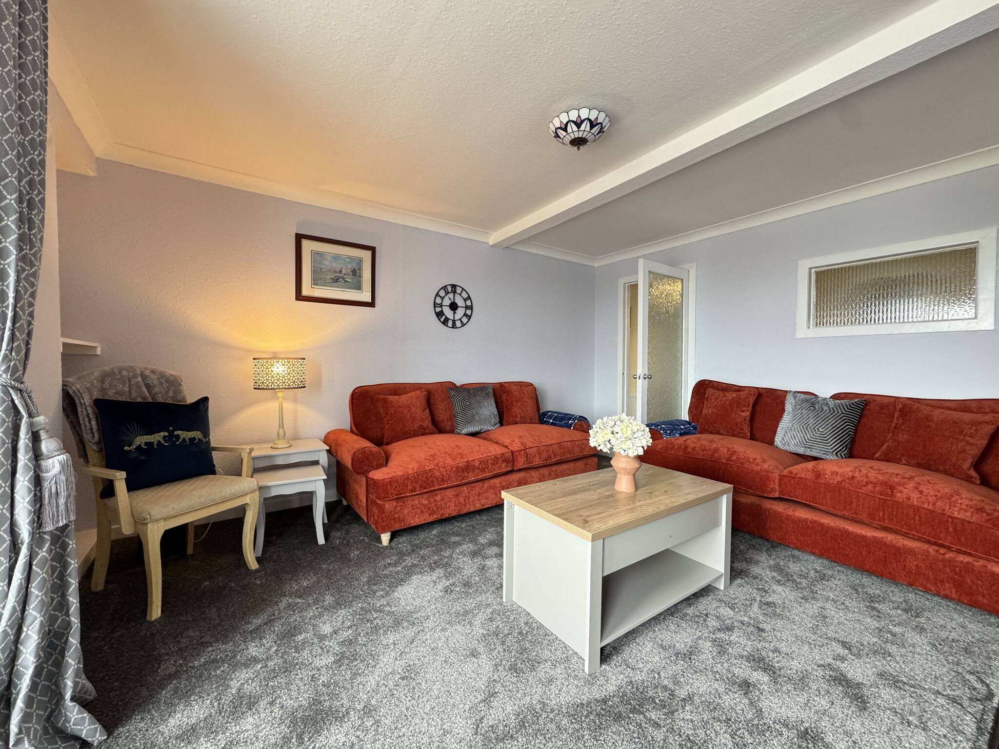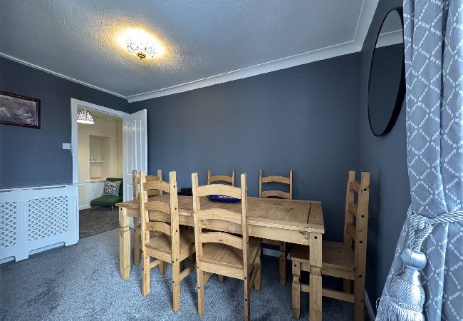 The bright, fully equipped kitchen invites you to cook up hearty breakfasts or fresh seafood dinners sourced from the local fishmongers. Open-plan living and dining areas provide plenty of space to unwind, with cosy seating and a large TV perfect for movie nights after a day spent exploring. We particularly love the tasteful coastal touches in the décor — from soft blues to maritime prints — which bring the magic of the seaside indoors.