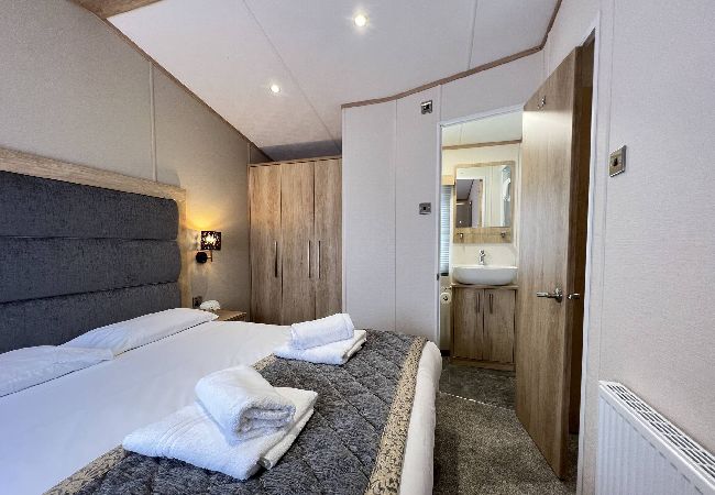 The lodge comprises two ensuite bedrooms and comfortably sleeps 4 guests. The master bedroom is furnished with a double bed and features an en-suite shower. The second bedroom offers two single beds. The family bathroom is equipped with a walk-in shower, a wash hand basin, and a toilet.