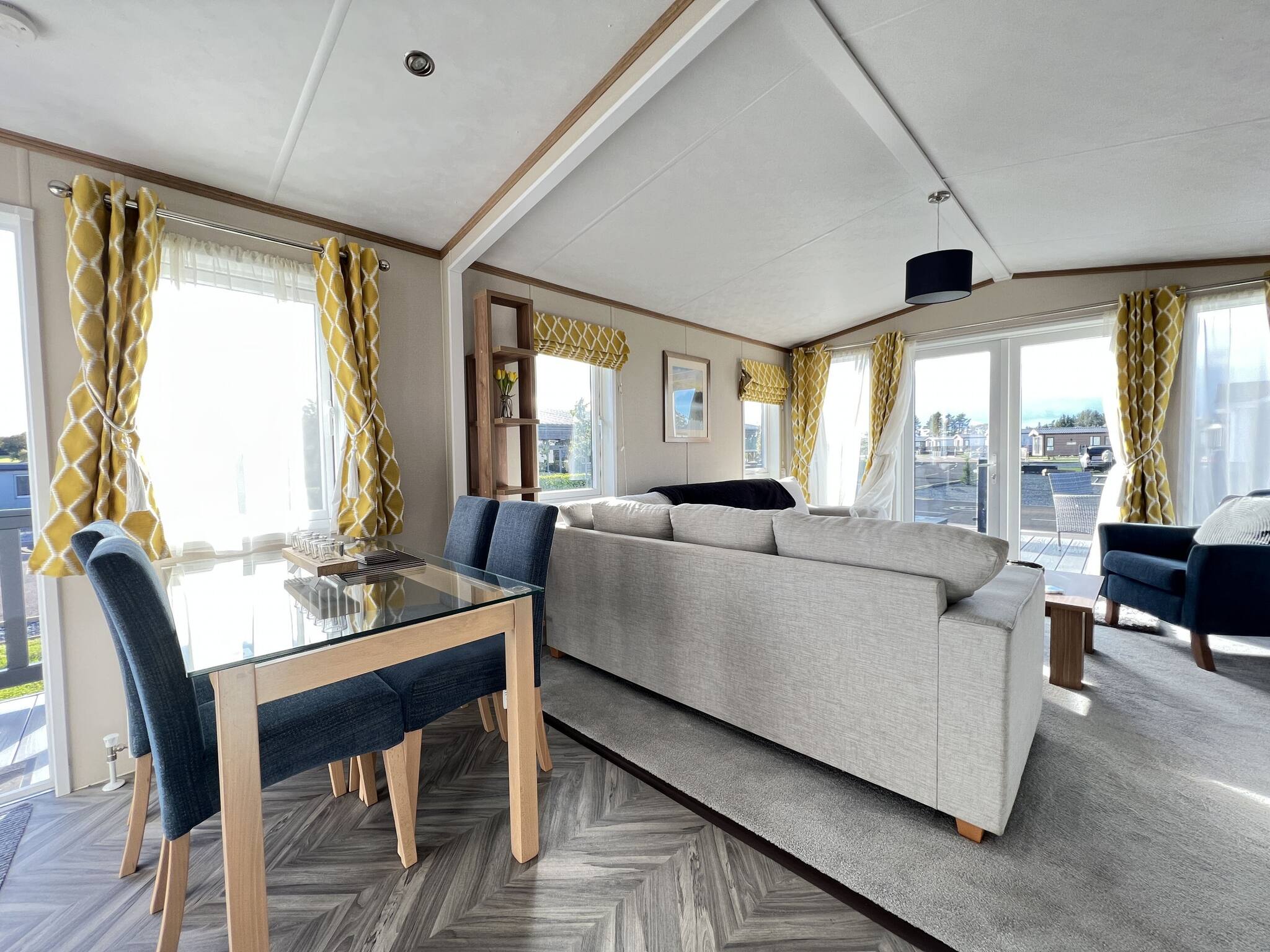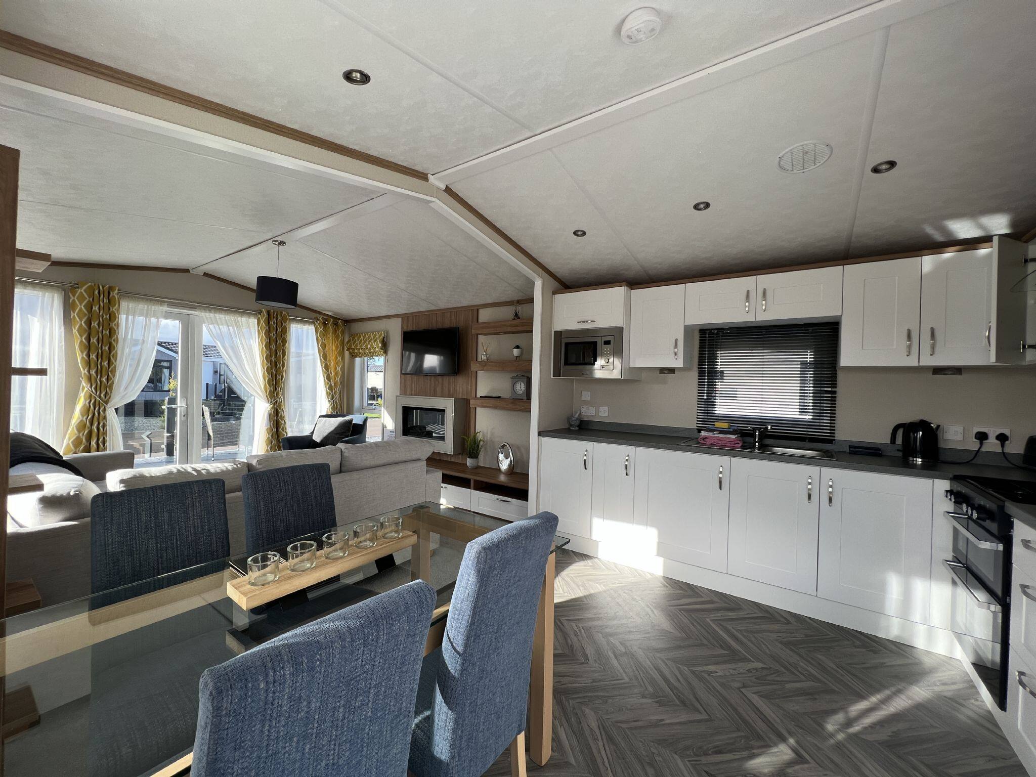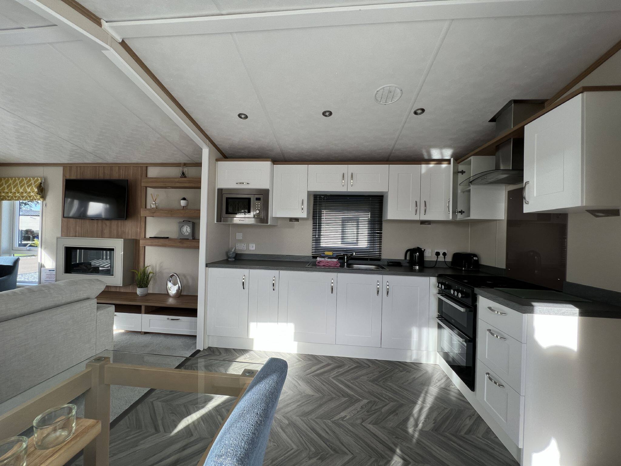 As a self-catering lodge, you'll find everything you need for a perfect stay. The kitchen is very modern and includes an island as well as a freestanding American-style fridge freezer, the perfect home-from-home!