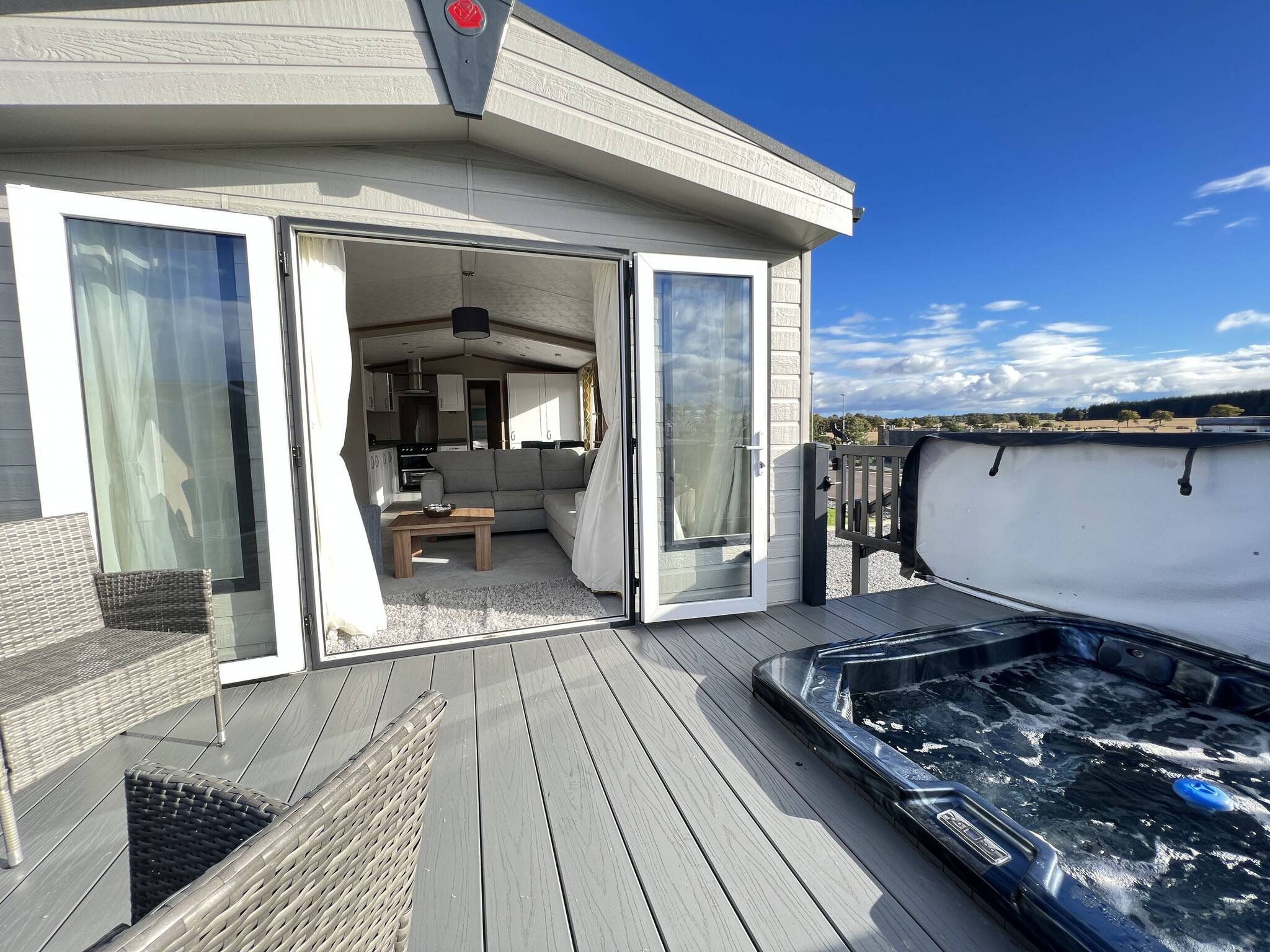 Lodge 1 at Stewarts Resort offers a contemporary and well-equipped kitchen featuring a fridge-freezer, hob, oven, kettle, toaster, microwave, iron, and ironing board. The open-plan kitchen seamlessly connects to the dining and lounge area, which includes a dining table with chairs, a comfortable corner sofa, and a television. Adjacent to the lounge, the patio doors lead to a private and fully enclosed deck area with outdoor furniture and a hot tub integrated into the decking, featuring jet controls and underwater lights.