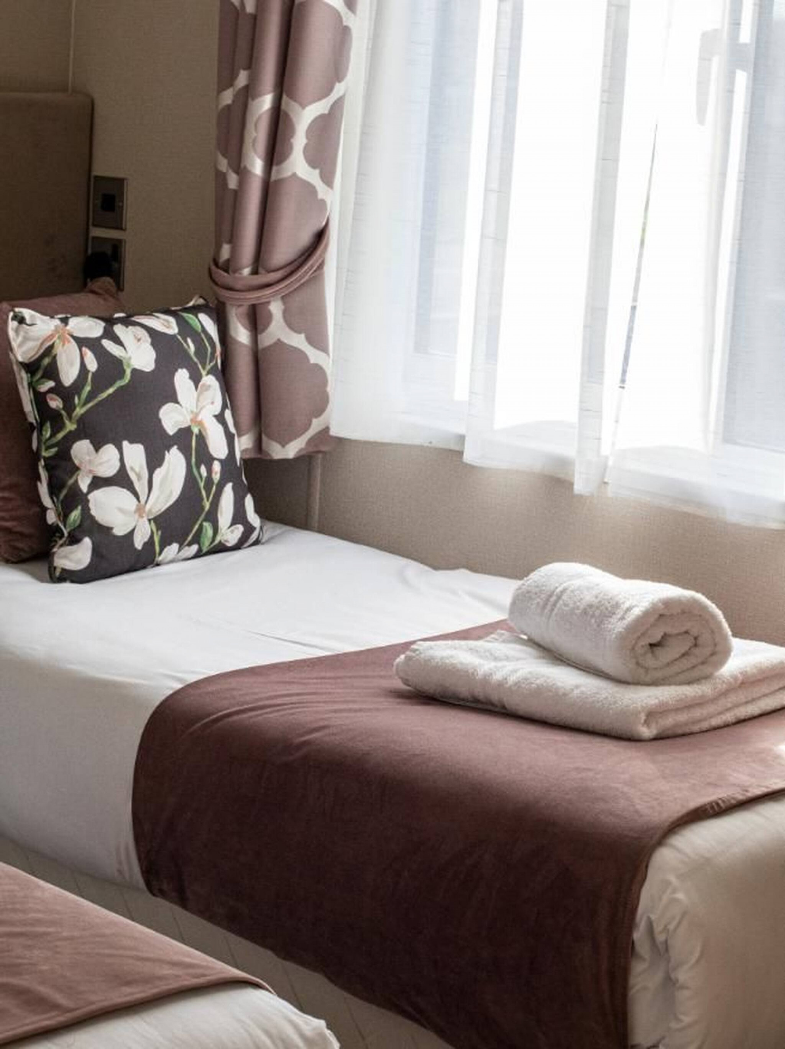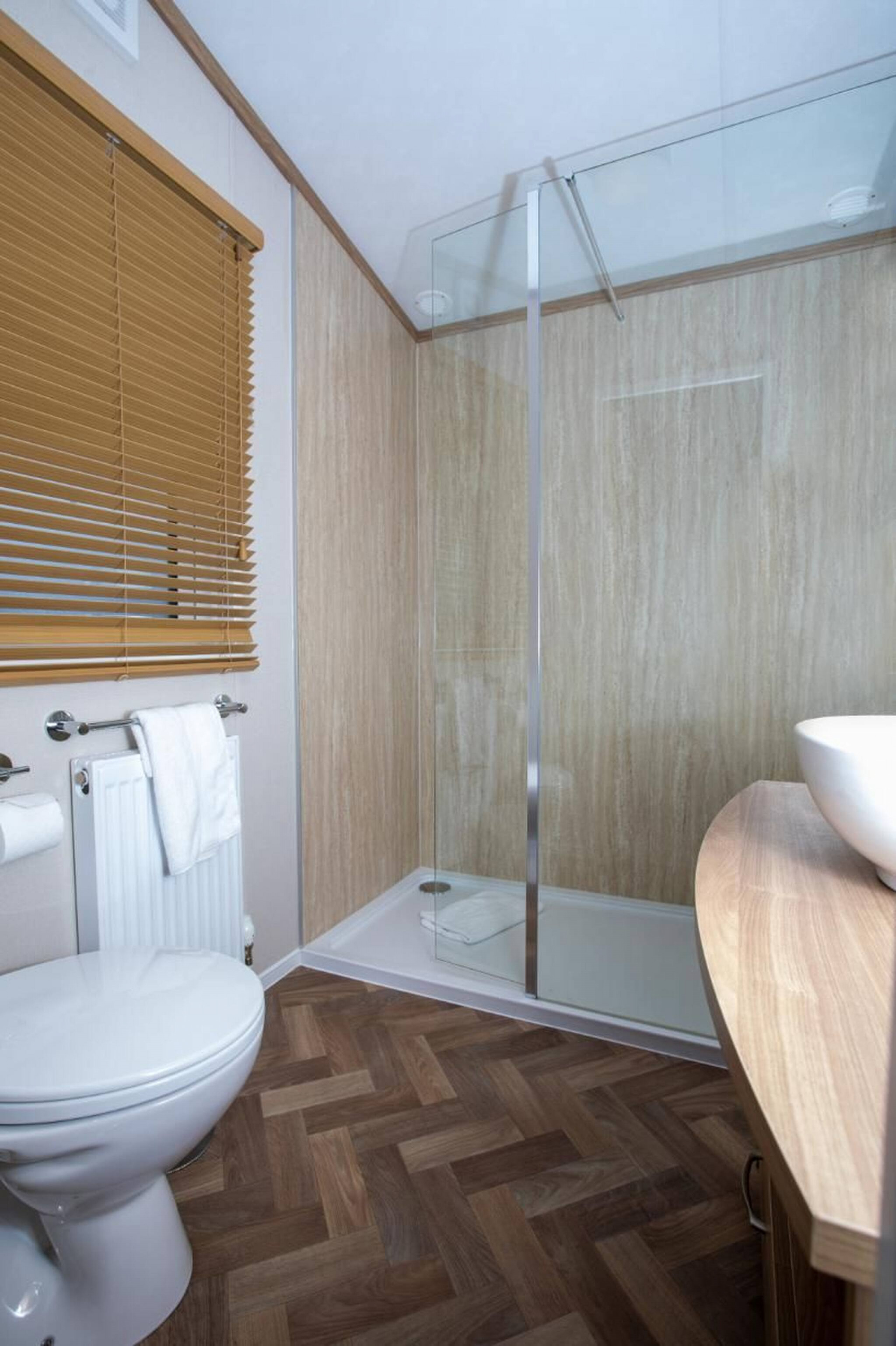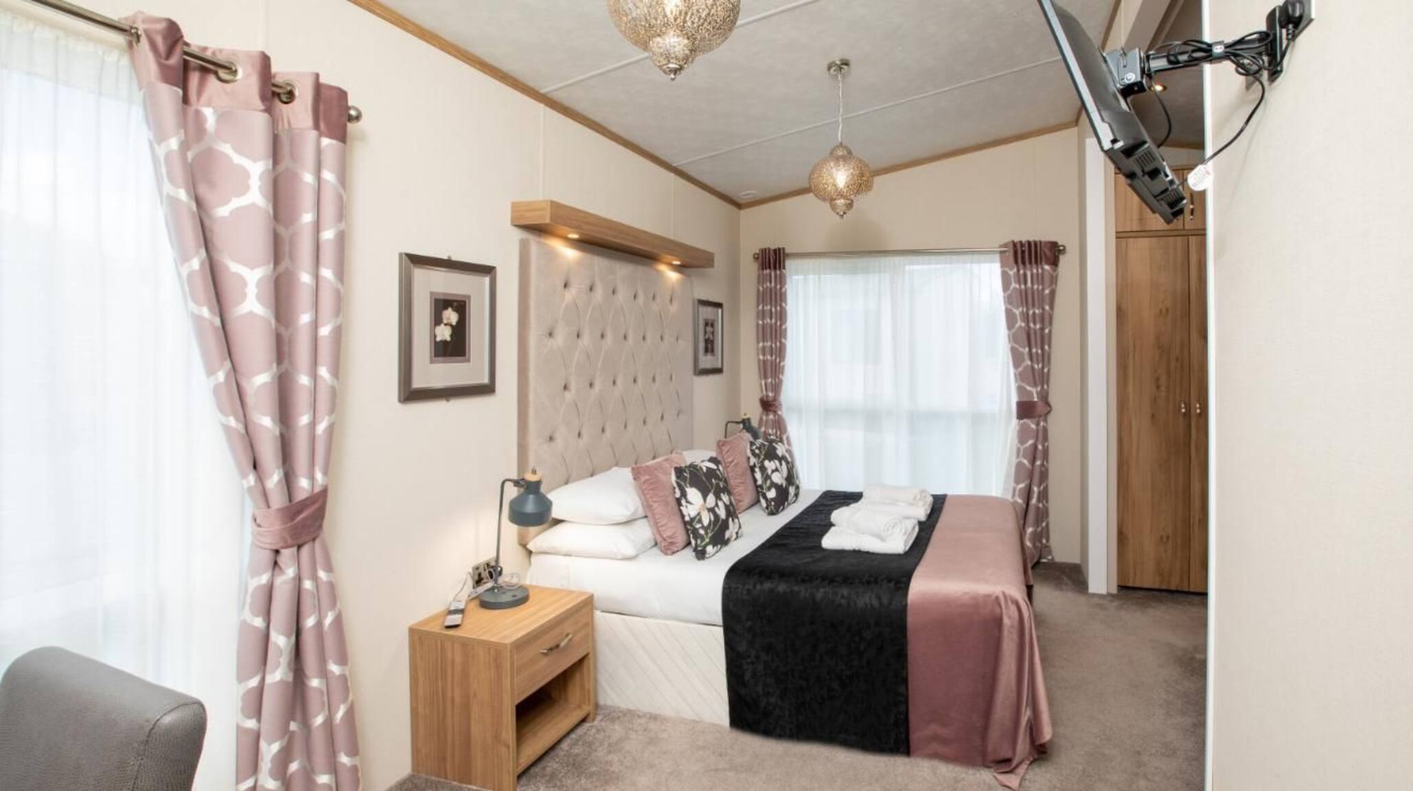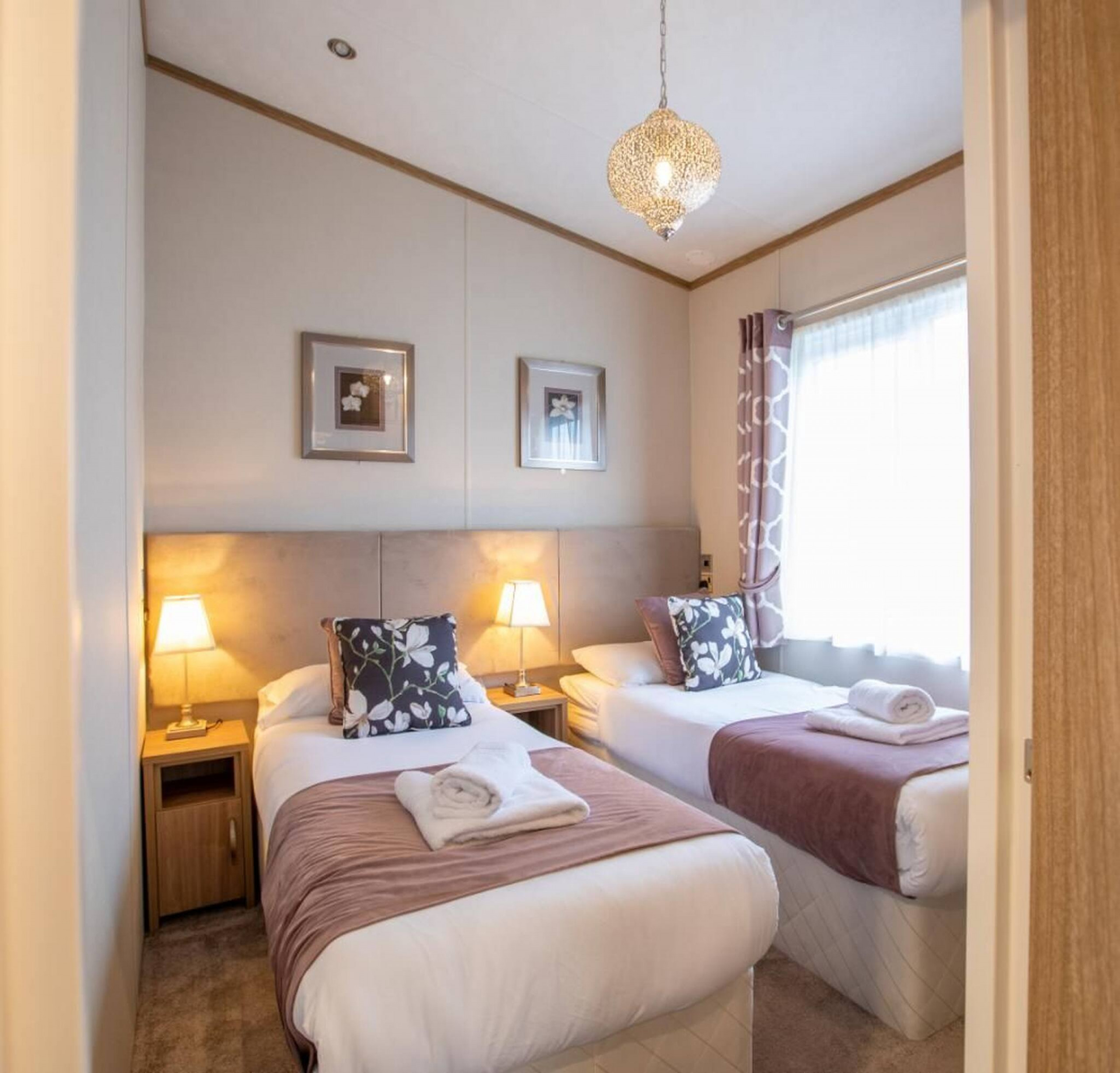 Lodge 19 can comfortably sleep up to six guests. The master bedroom (kingsize bed) includes an en-suite bathroom with a walk-in shower. The second bedroom comprises two single beds that can be arranged into a double bed. There is also a three-piece family bathroom with an overhead shower accessible from the hallway.