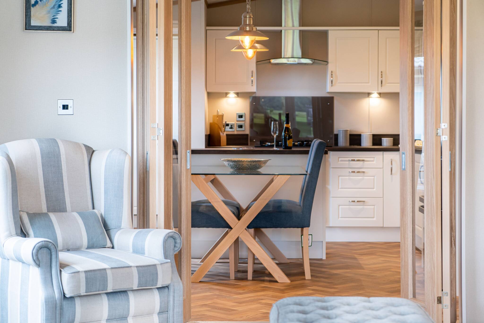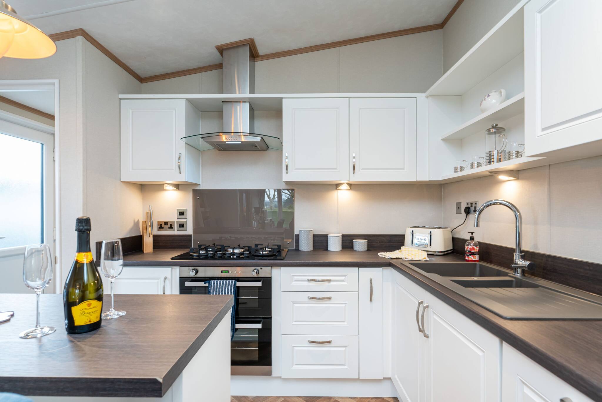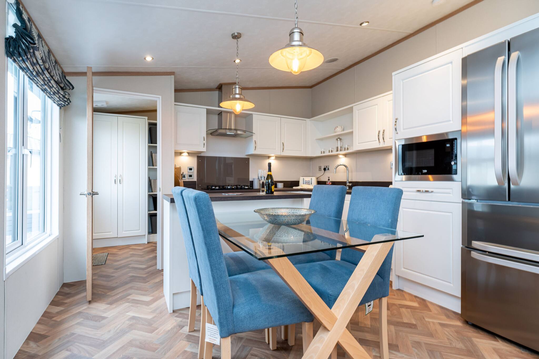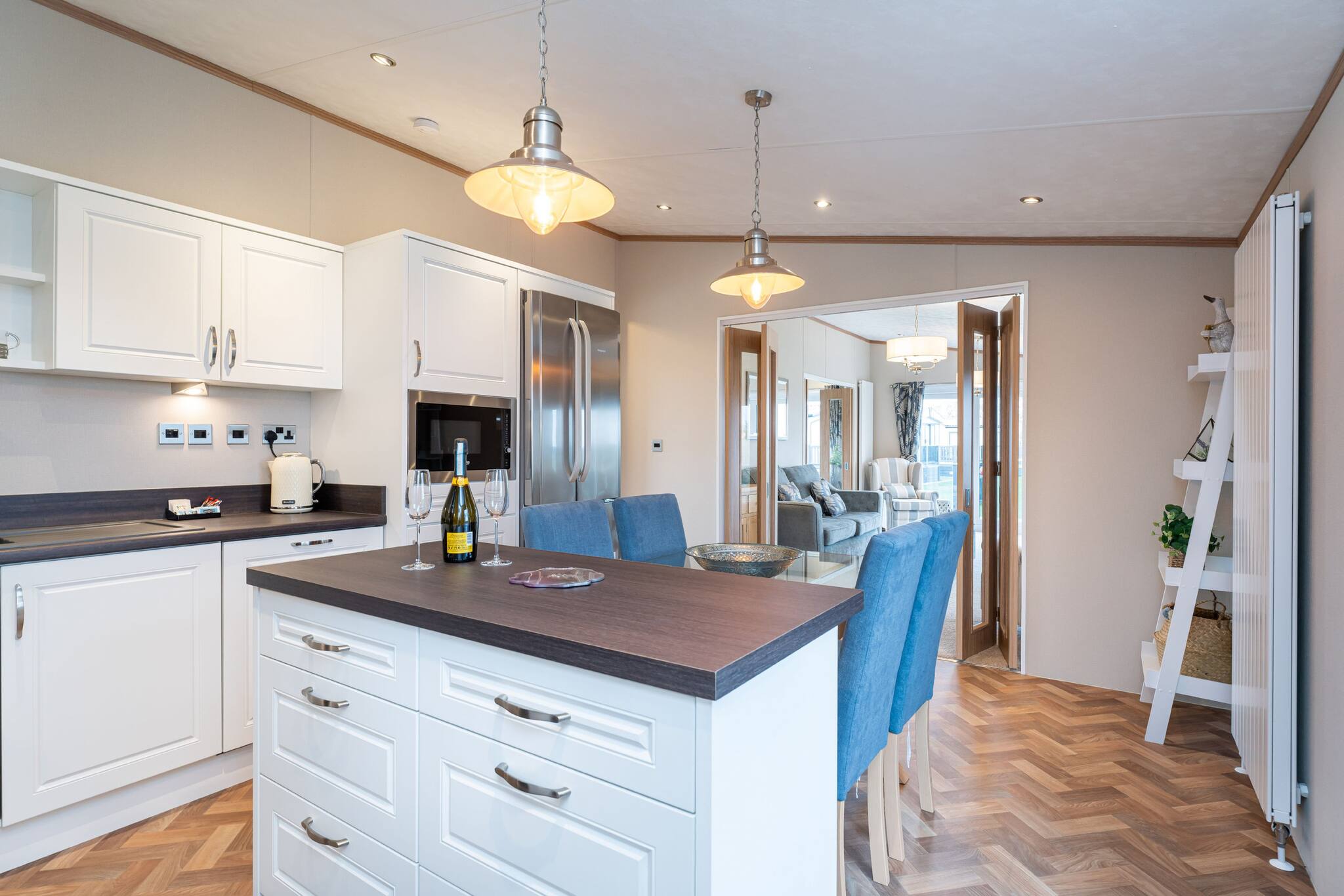 As a self-catering lodge, you'll find everything you need for a perfect stay. The kitchen is very modern and includes an island as well as a freestanding American-style fridge freezer, the perfect home-from-home!