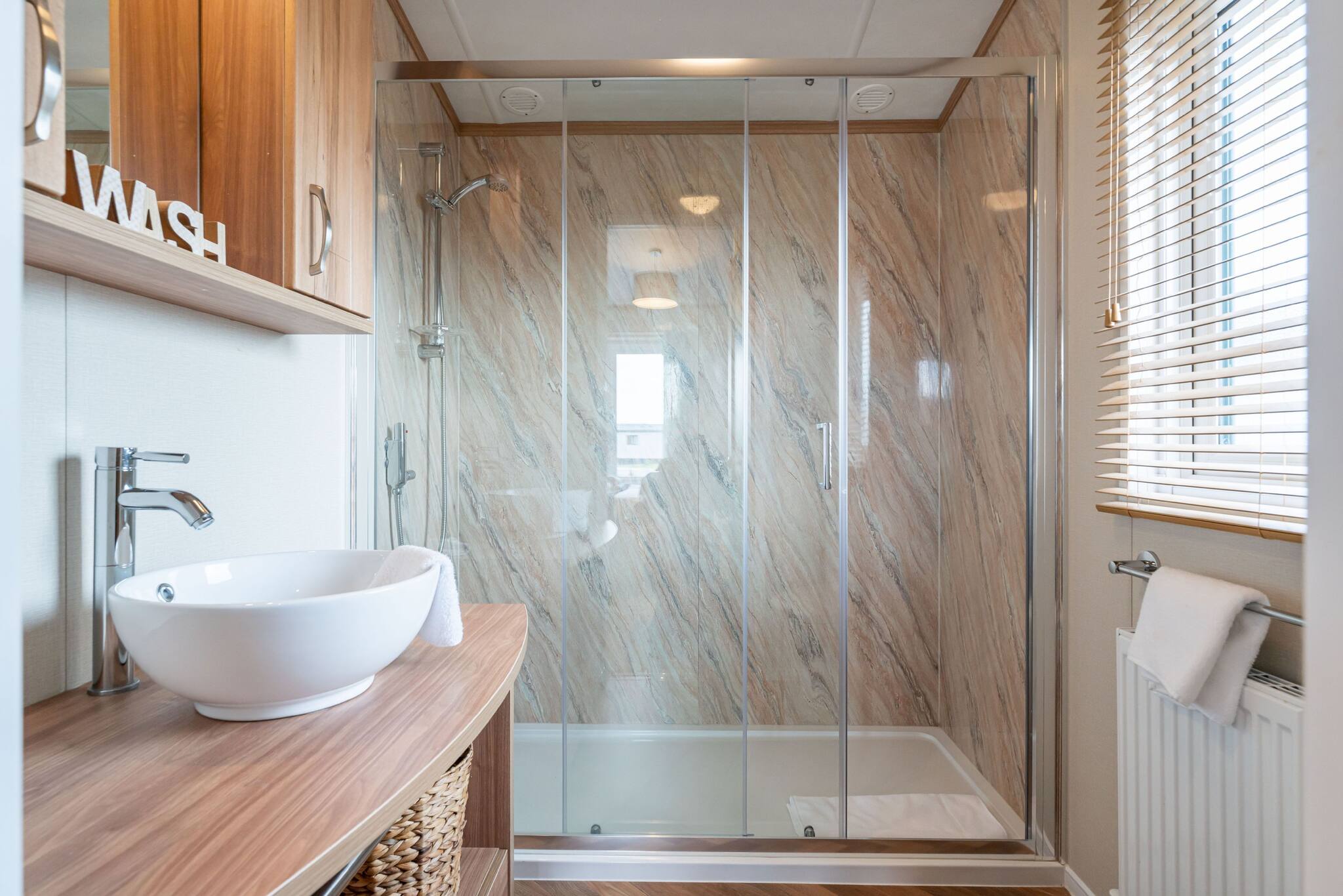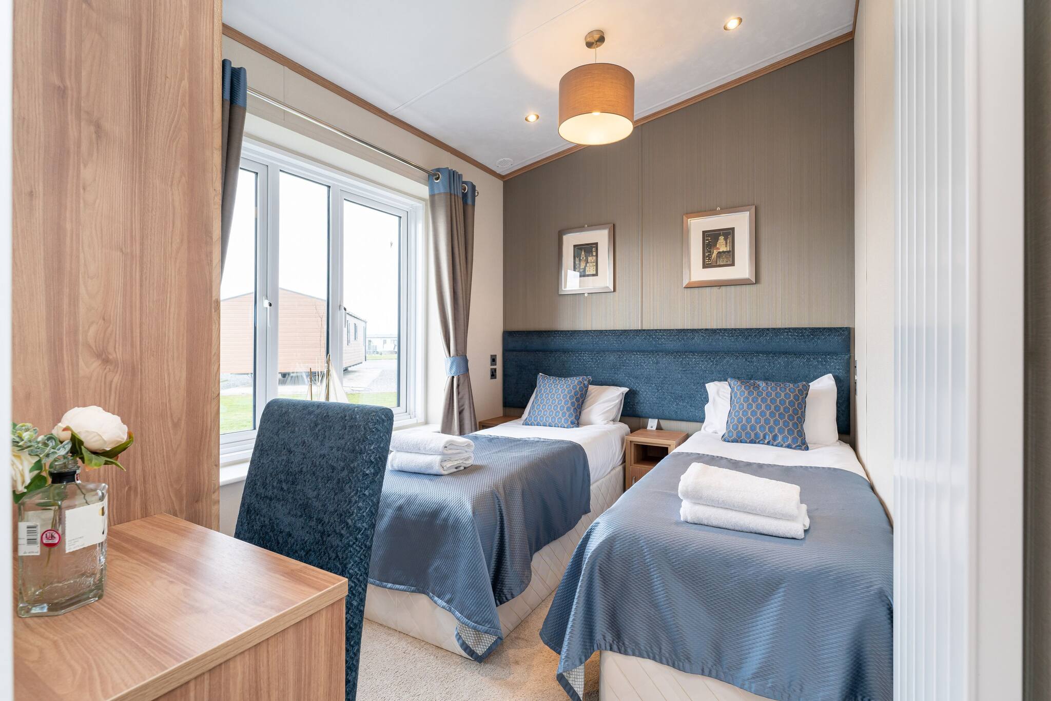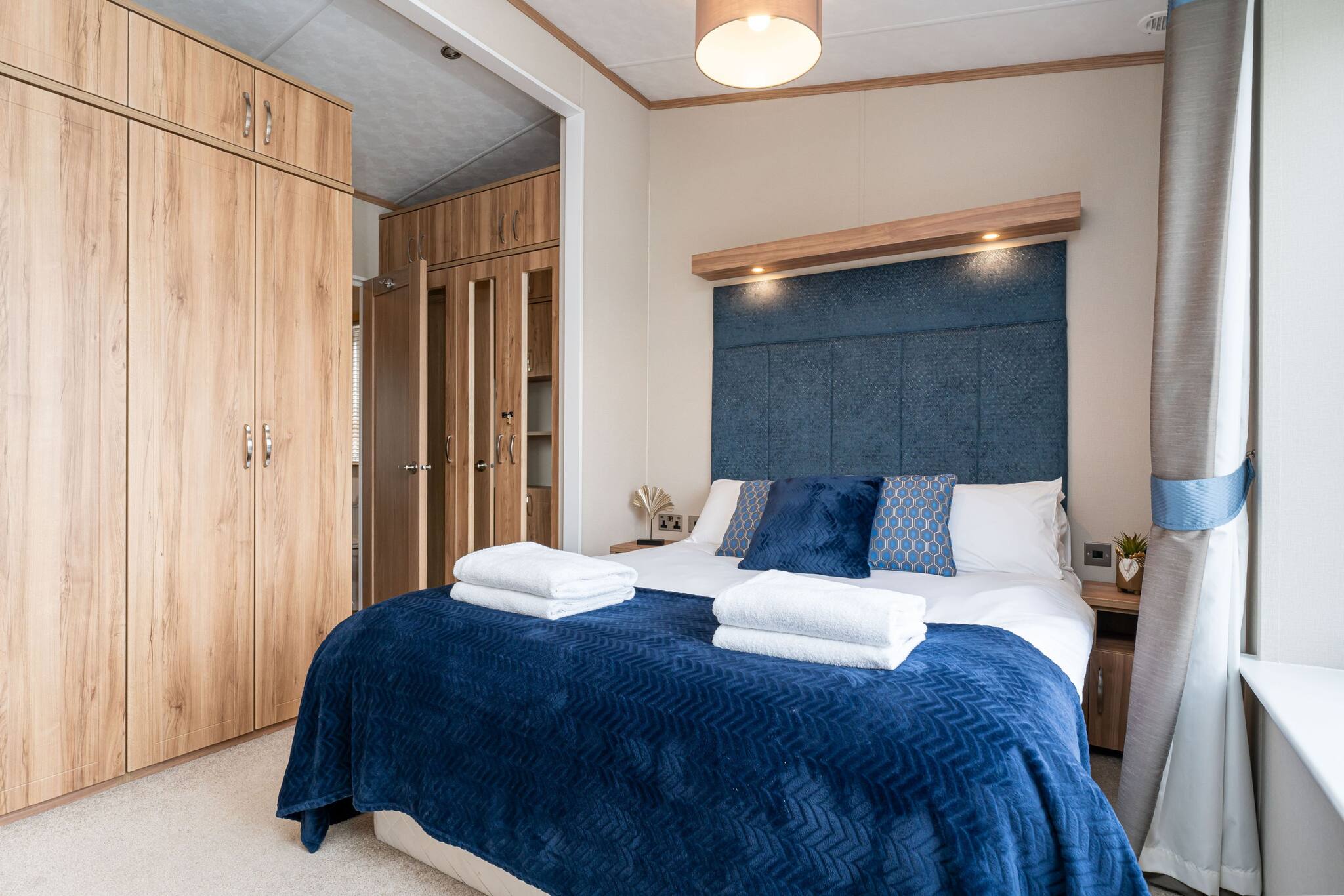 Lodge 19 can comfortably sleep up to six guests. The master bedroom (kingsize bed) includes an en-suite bathroom with a walk-in shower. The second bedroom comprises two single beds that can be arranged into a double bed. There is also a three-piece family bathroom with an overhead shower accessible from the hallway.