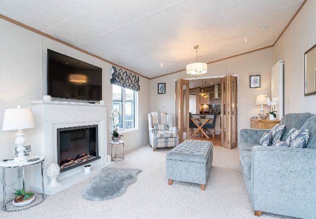This exquisite lodge is impeccably finished with high standards and quality fixtures and fittings. It features a private, non-enclosed decking area, complete with a sunken hot tub, outdoor furniture, and convenient parking. Inside, you'll find a beautiful holiday home with a generous living space, perfect for entertaining, relaxing by the fireplace, and enjoying your St. Andrews escapes. The well-proportioned open-plan kitchen and dining area are stylishly designed, while the lodge also includes a versatile snug room that can be closed off from the lounge. This room can serve as an office, a kids' room, or an additional bedroom if needed.