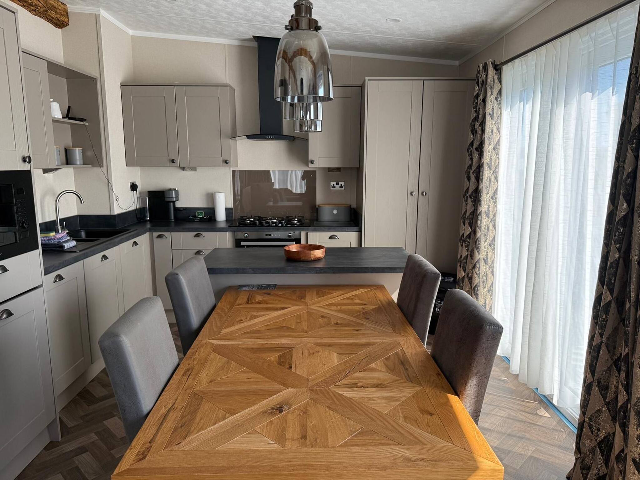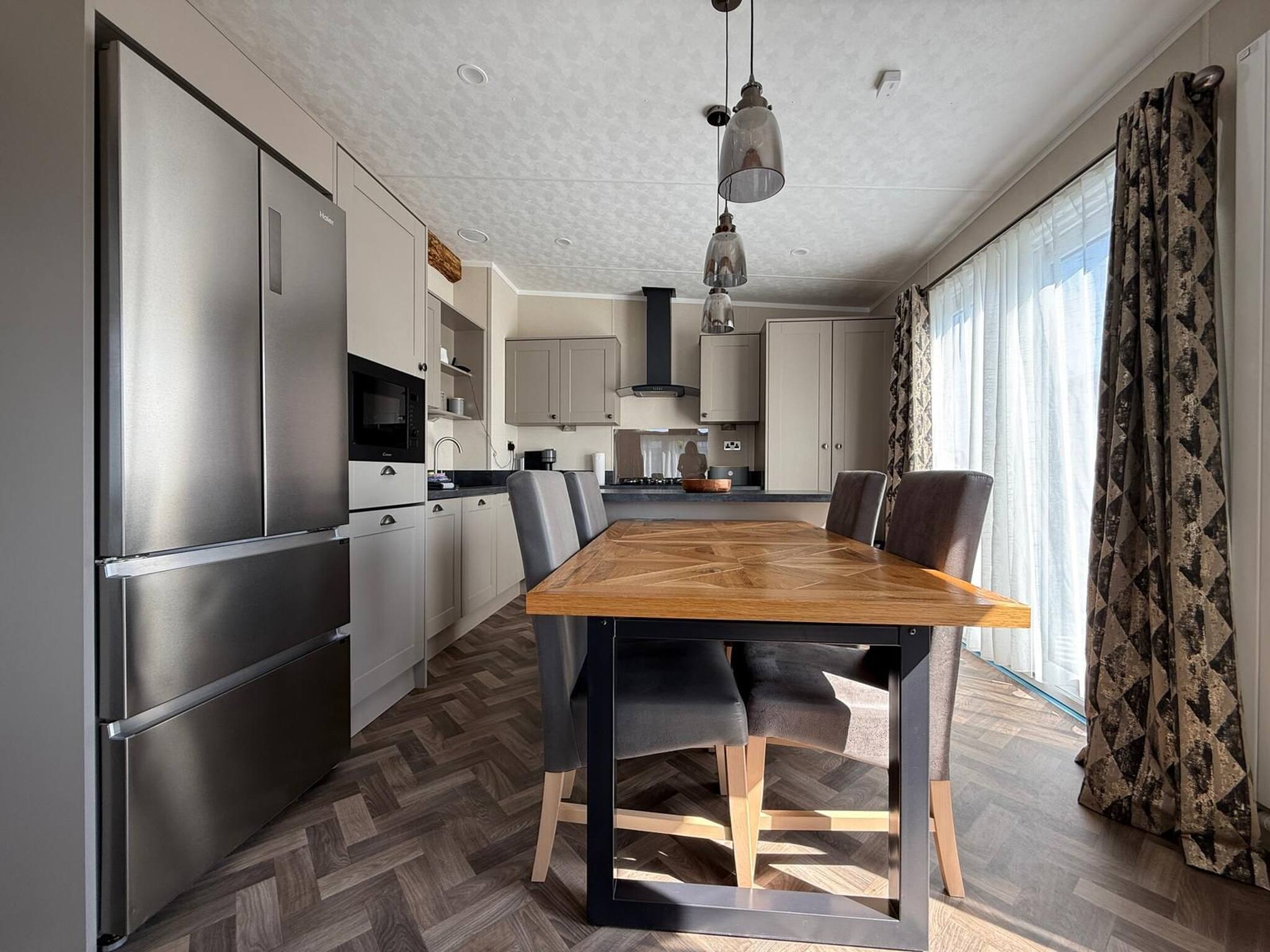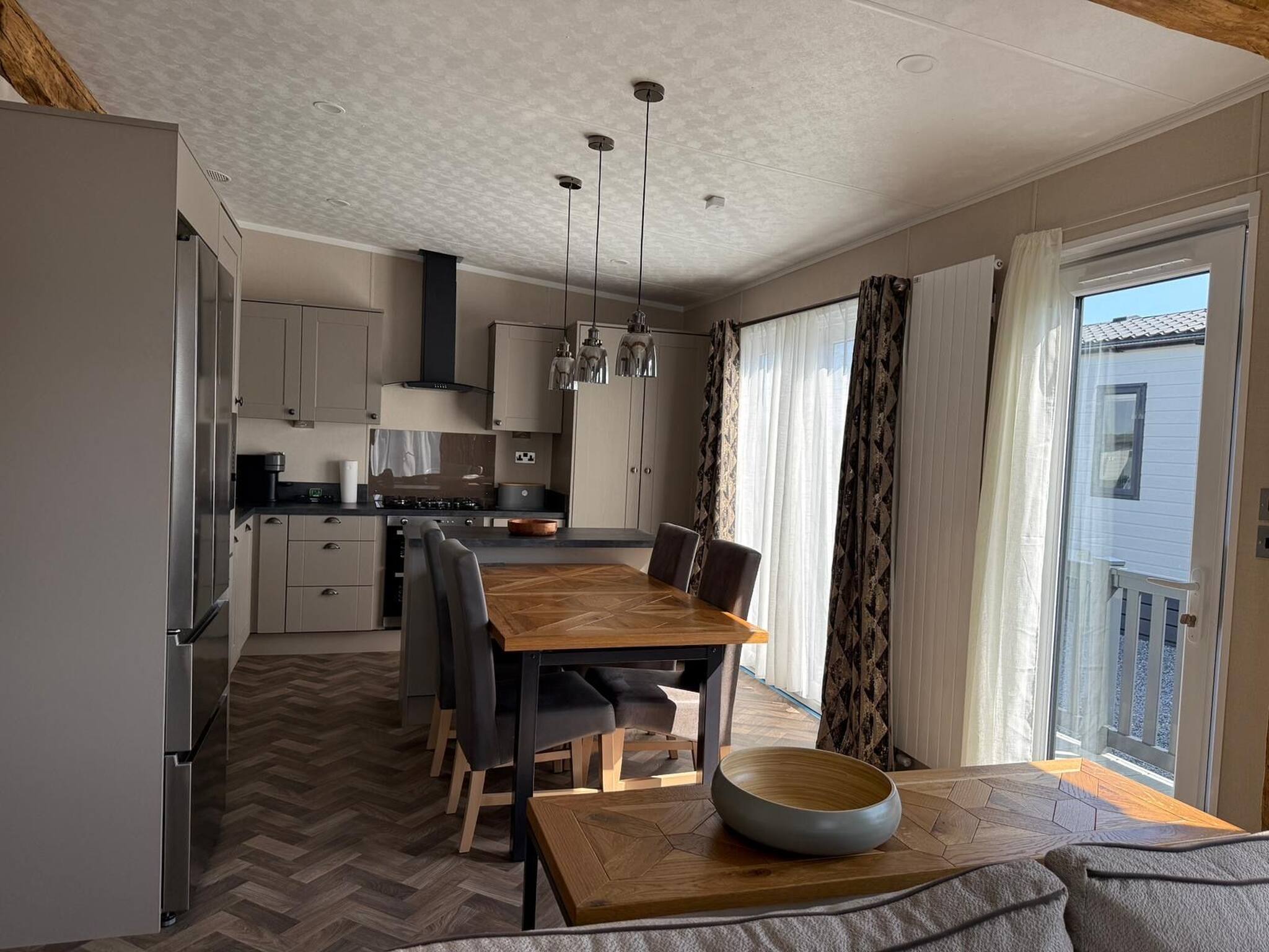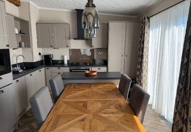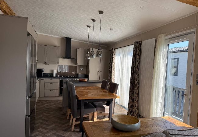 As a self-catering lodge, you'll find everything you need for a perfect stay. The kitchen is very modern and includes an island as well as a freestanding American-style fridge freezer, the perfect home-from-home!