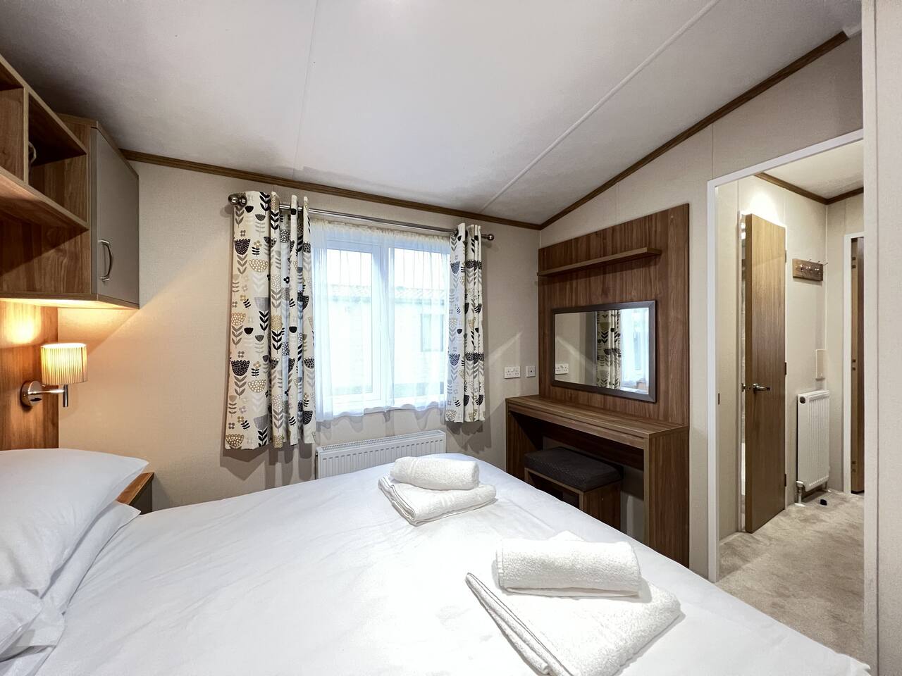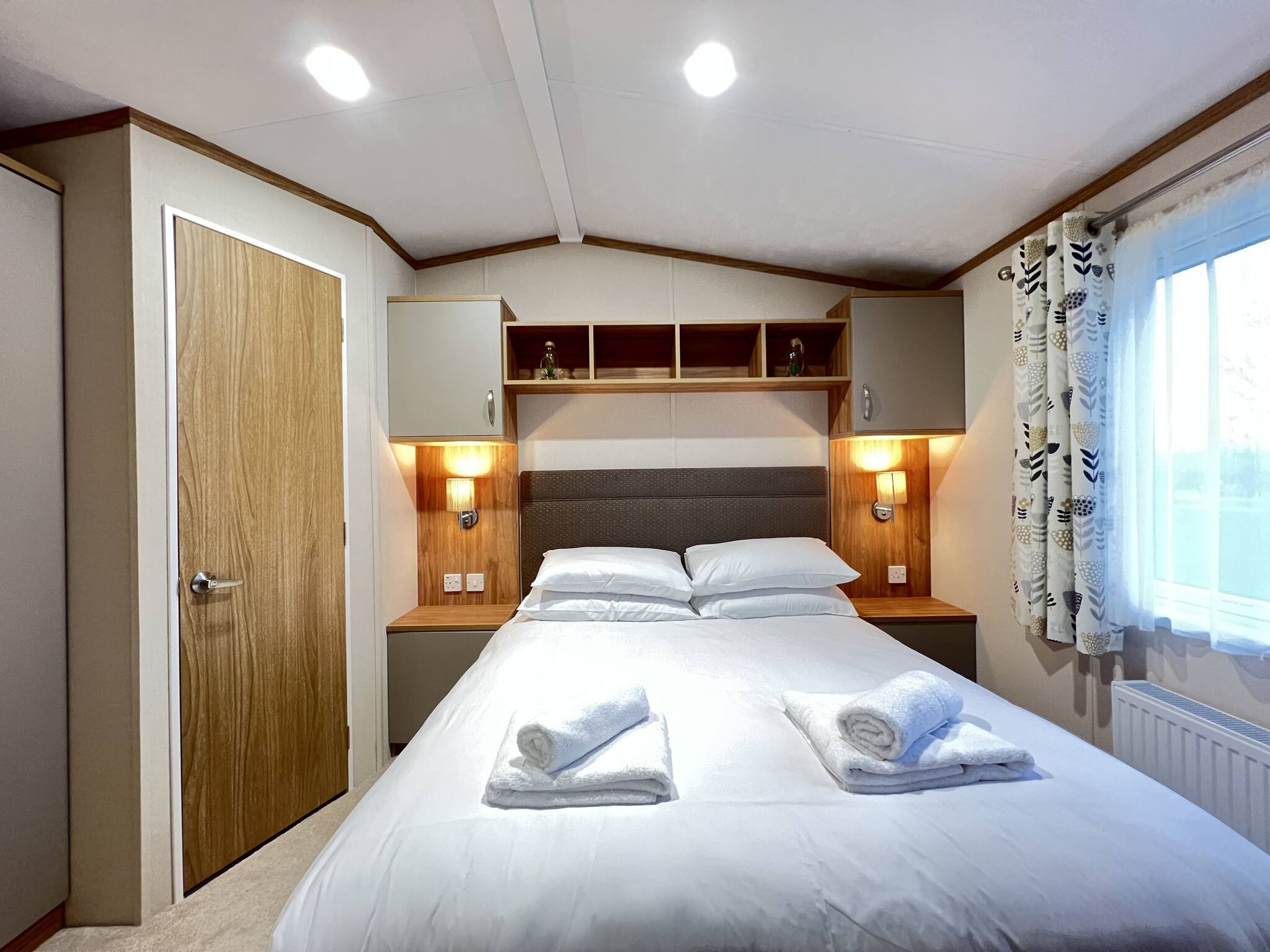 Lodge 19 can comfortably sleep up to six guests. The master bedroom (kingsize bed) includes an en-suite bathroom with a walk-in shower. The second bedroom comprises two single beds that can be arranged into a double bed. There is also a three-piece family bathroom with an overhead shower accessible from the hallway.