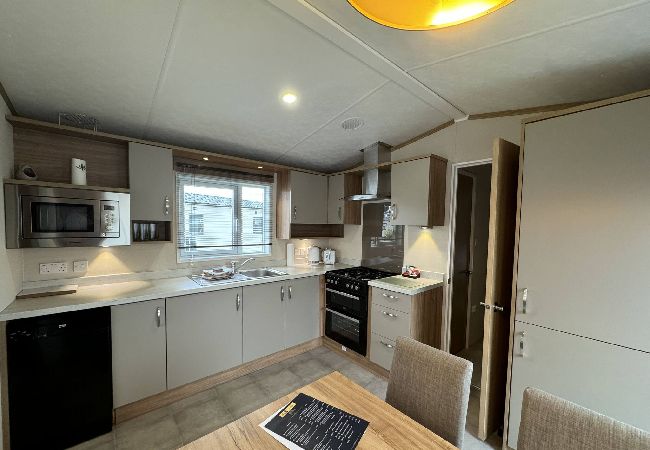 As a self-catering lodge, you'll find everything you need for a perfect stay. The kitchen is very modern and includes an island as well as a freestanding American-style fridge freezer, the perfect home-from-home!