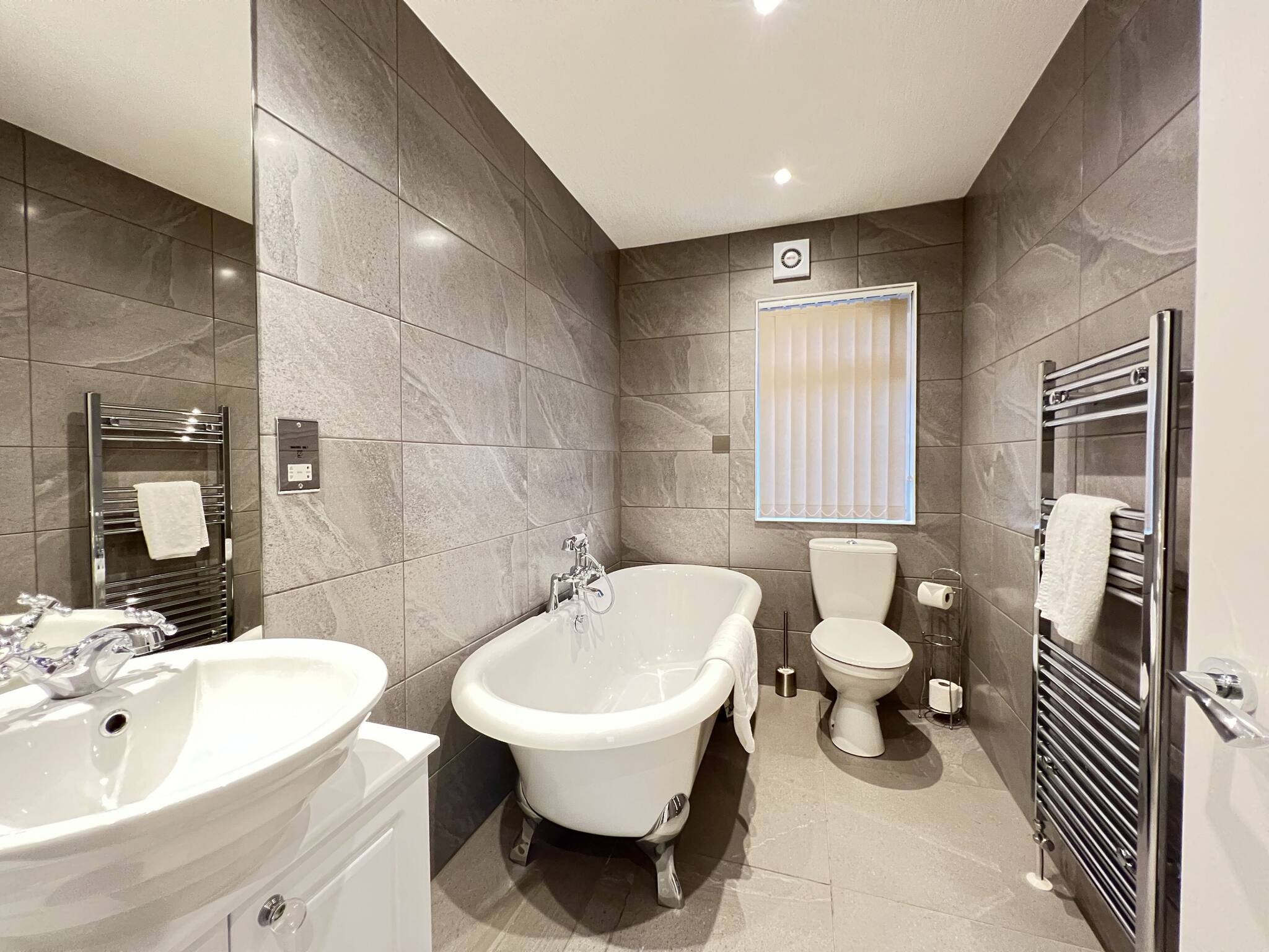 Bathrooms: A separate family bathroom featuring a classic roll-top bath
