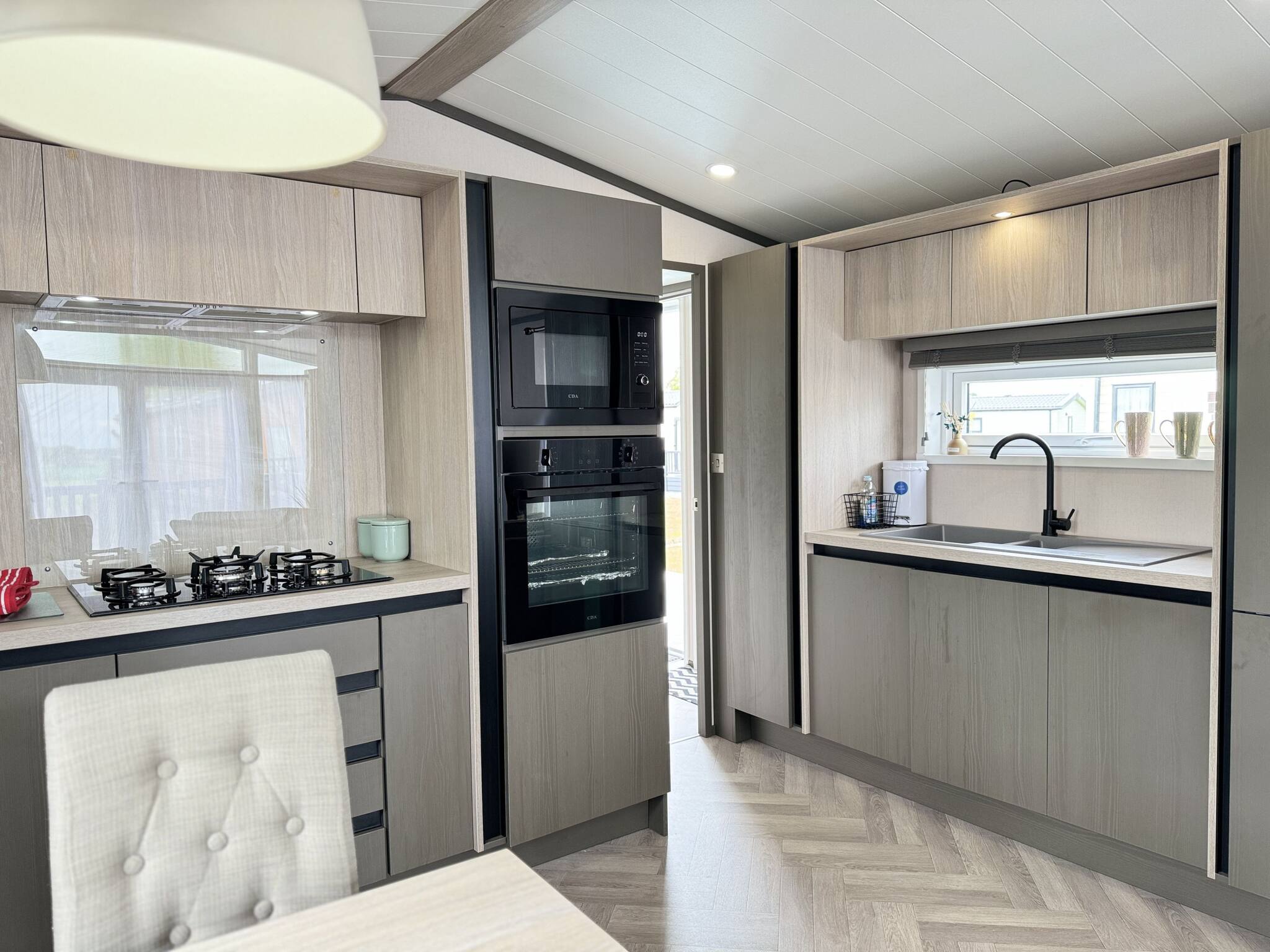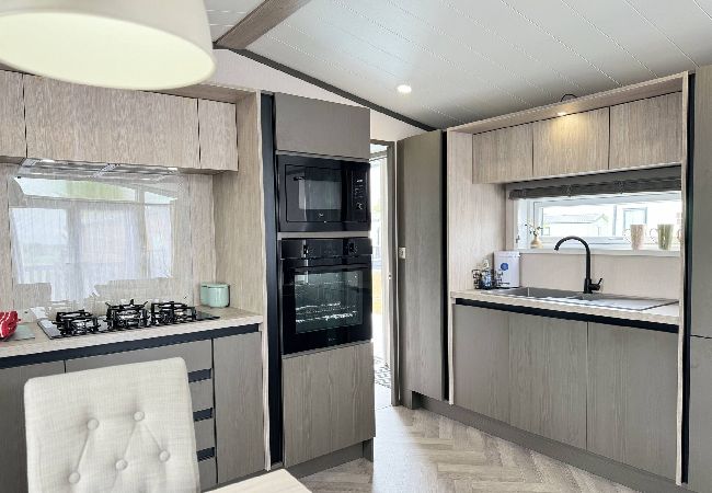 As a self-catering lodge, you'll find everything you need for a perfect stay. The kitchen is very modern and includes an island as well as a freestanding American-style fridge freezer, the perfect home-from-home!