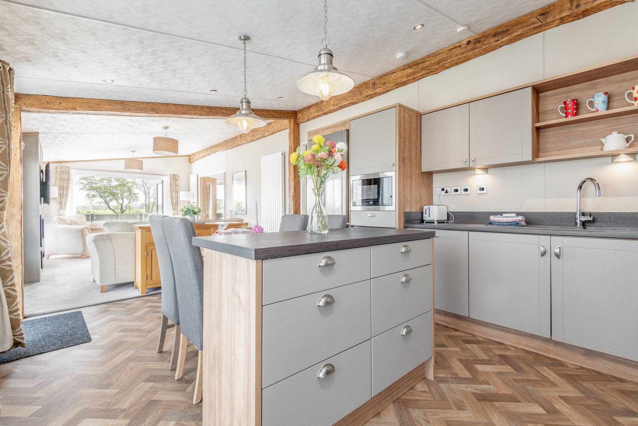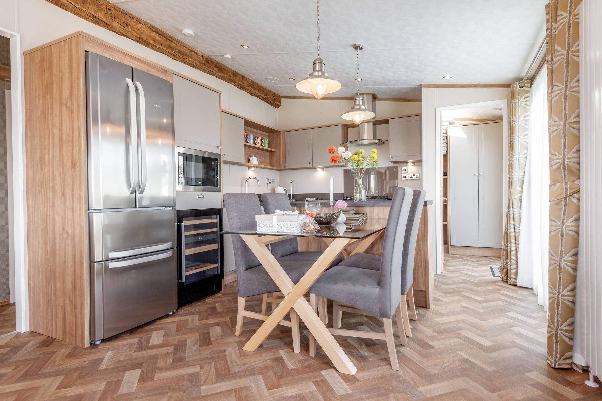 As a self-catering lodge, you'll find everything you need for a perfect stay. The kitchen is very modern and includes an island as well as a freestanding American-style fridge freezer, the perfect home-from-home!