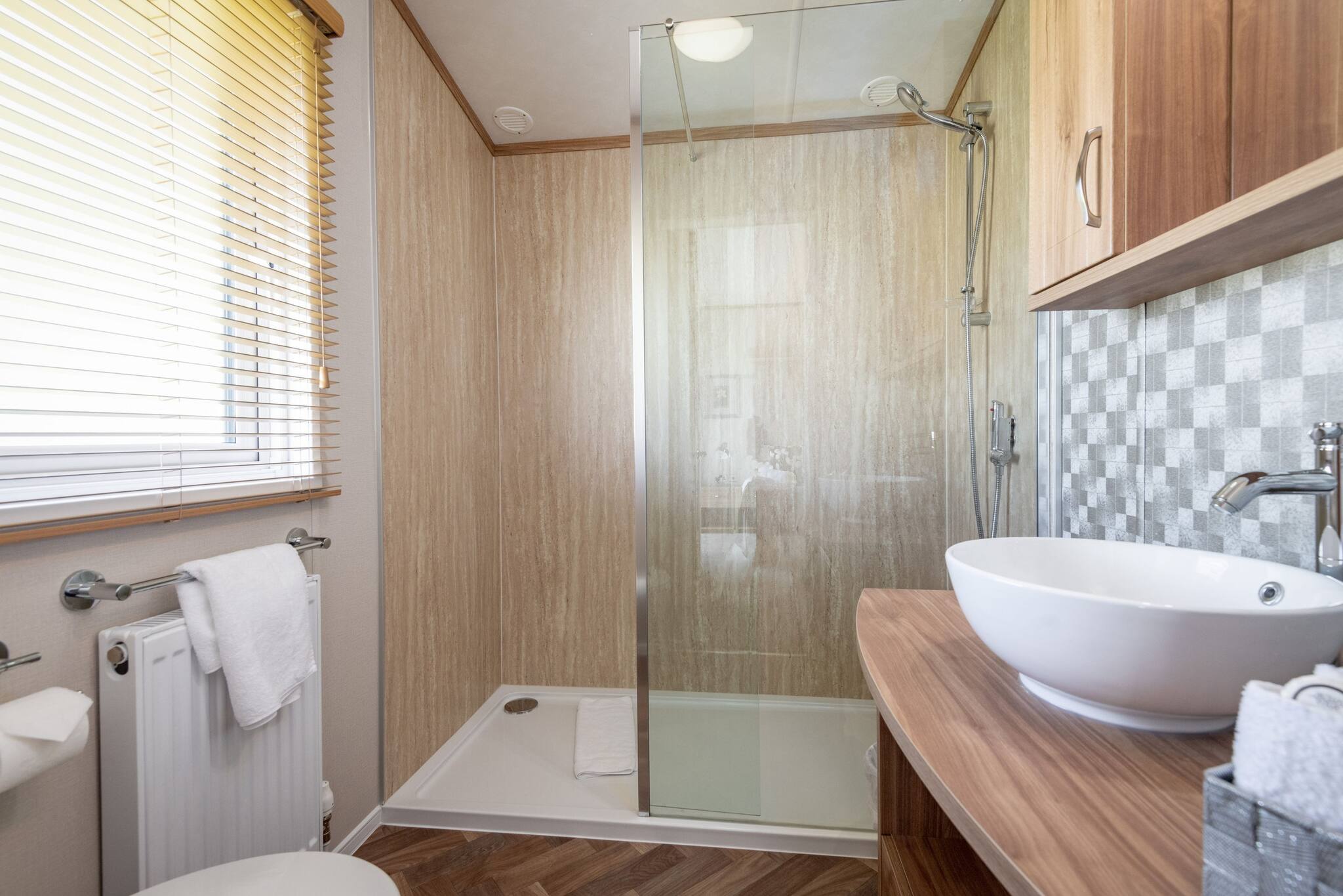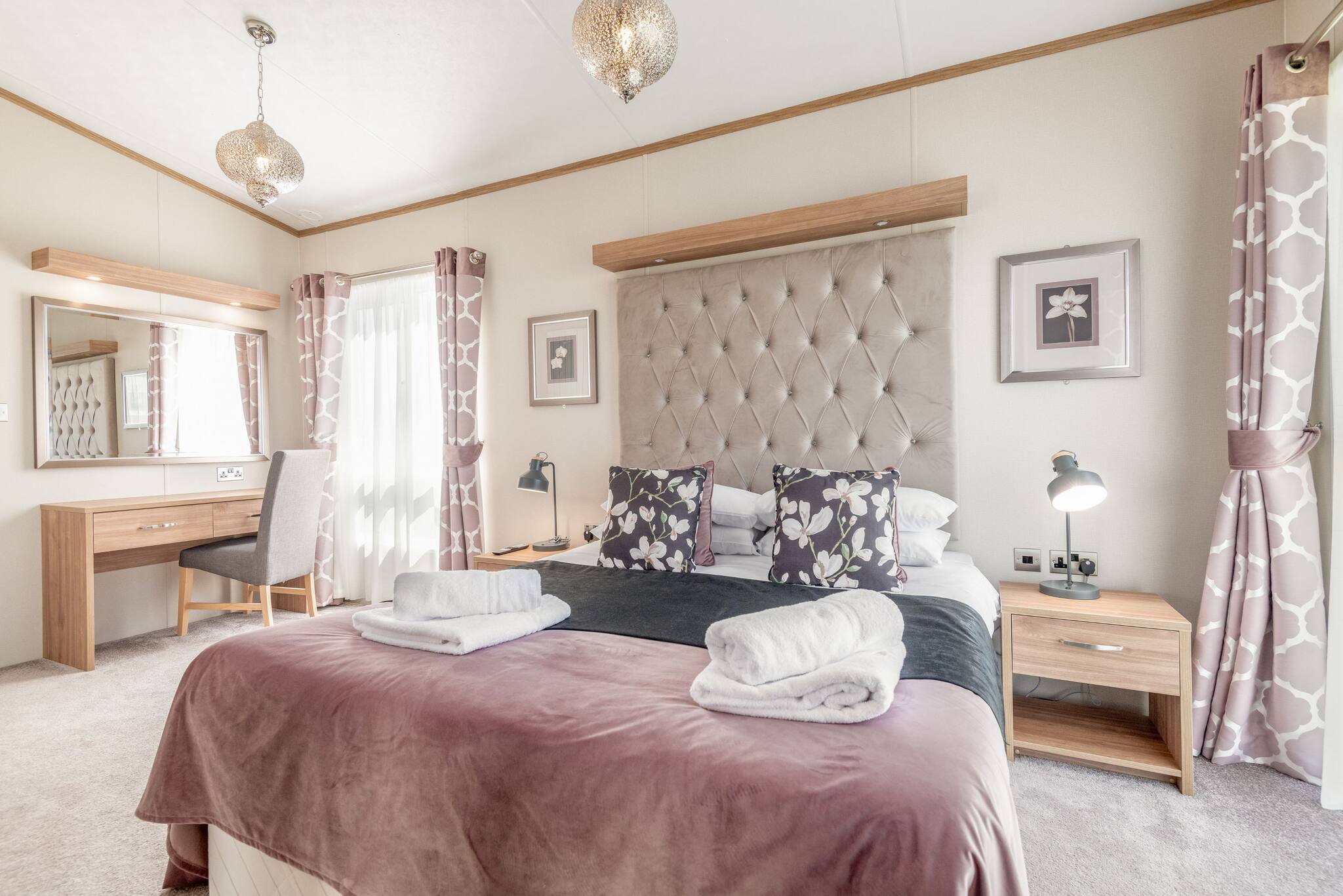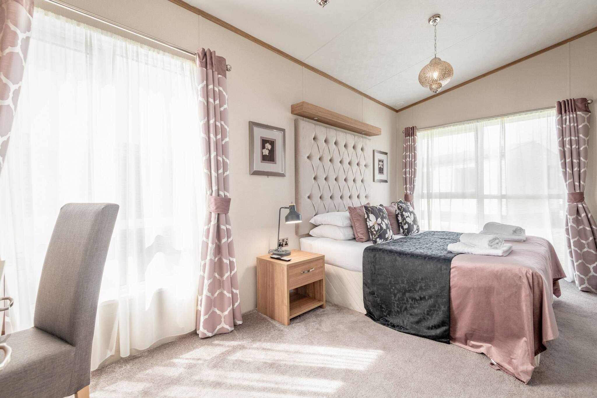 Lodge 19 can comfortably sleep up to six guests. The master bedroom (kingsize bed) includes an en-suite bathroom with a walk-in shower. The second bedroom comprises two single beds that can be arranged into a double bed. There is also a three-piece family bathroom with an overhead shower accessible from the hallway.