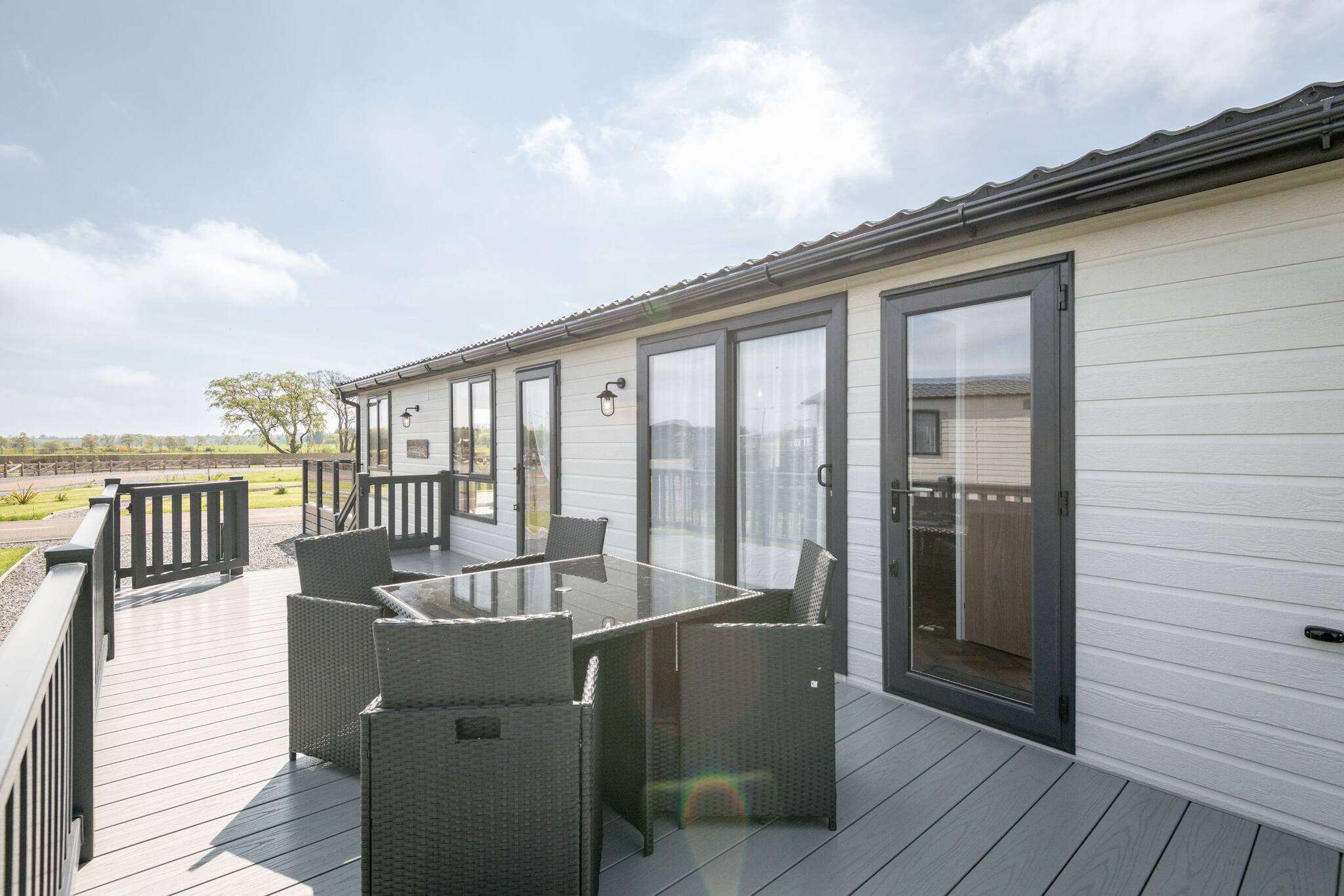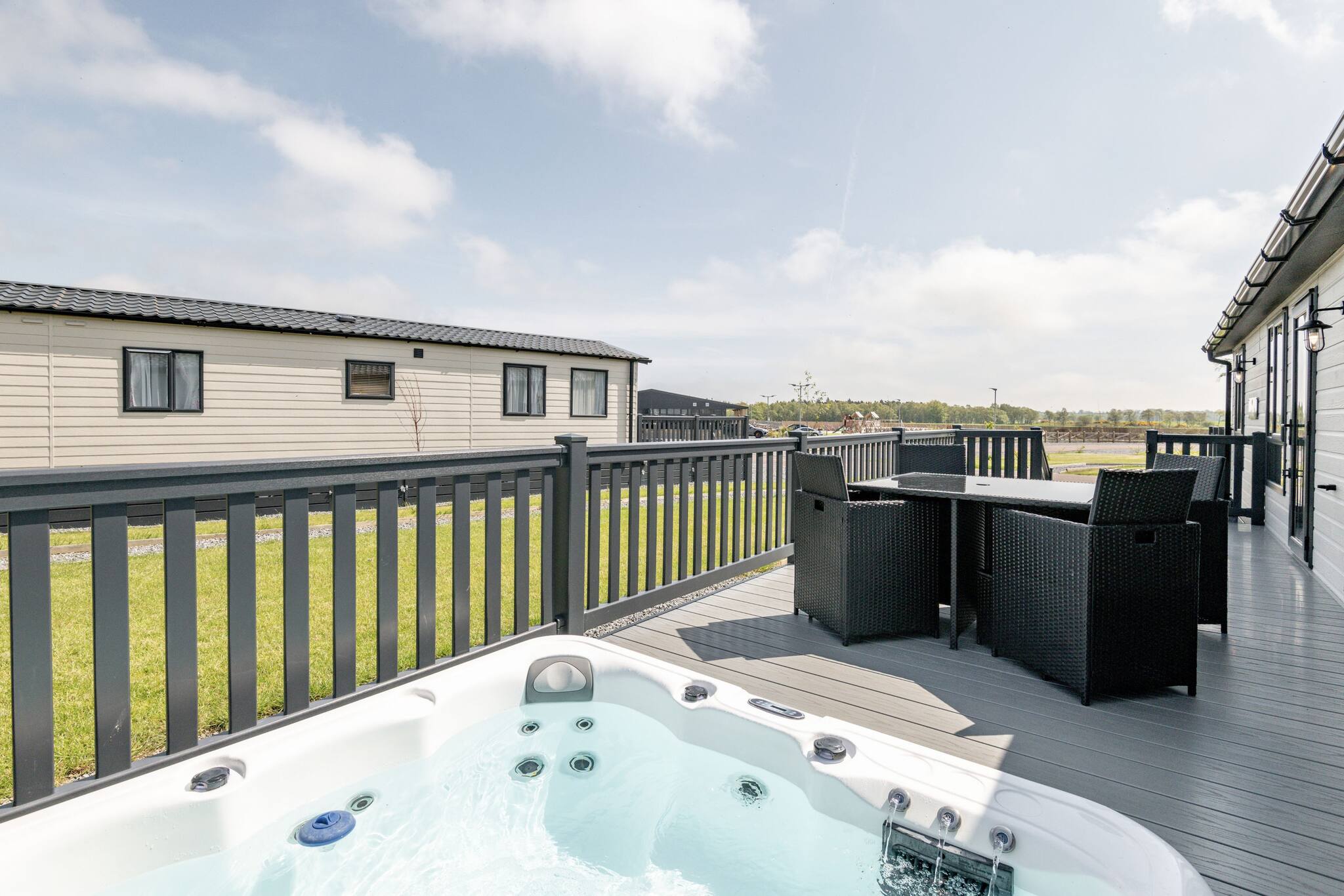 This luxury lodge, with beautiful countryside views, can accommodate up to six people comfortably with two bedrooms and a separate snug room with a sofa bed. The lodge has plenty of living space with its modern open-plan lounge/kitchen/diner and utility room to store any outdoor bikes or scooters the kids want to bring with them. This lodge benefits from a completely enclosed deck, so your fur baby is safe to be left outdoors enjoying the fresh air whilst you take a dip in the hot tub, which is sunk into the deck so ideal for anyone with mobility issues.