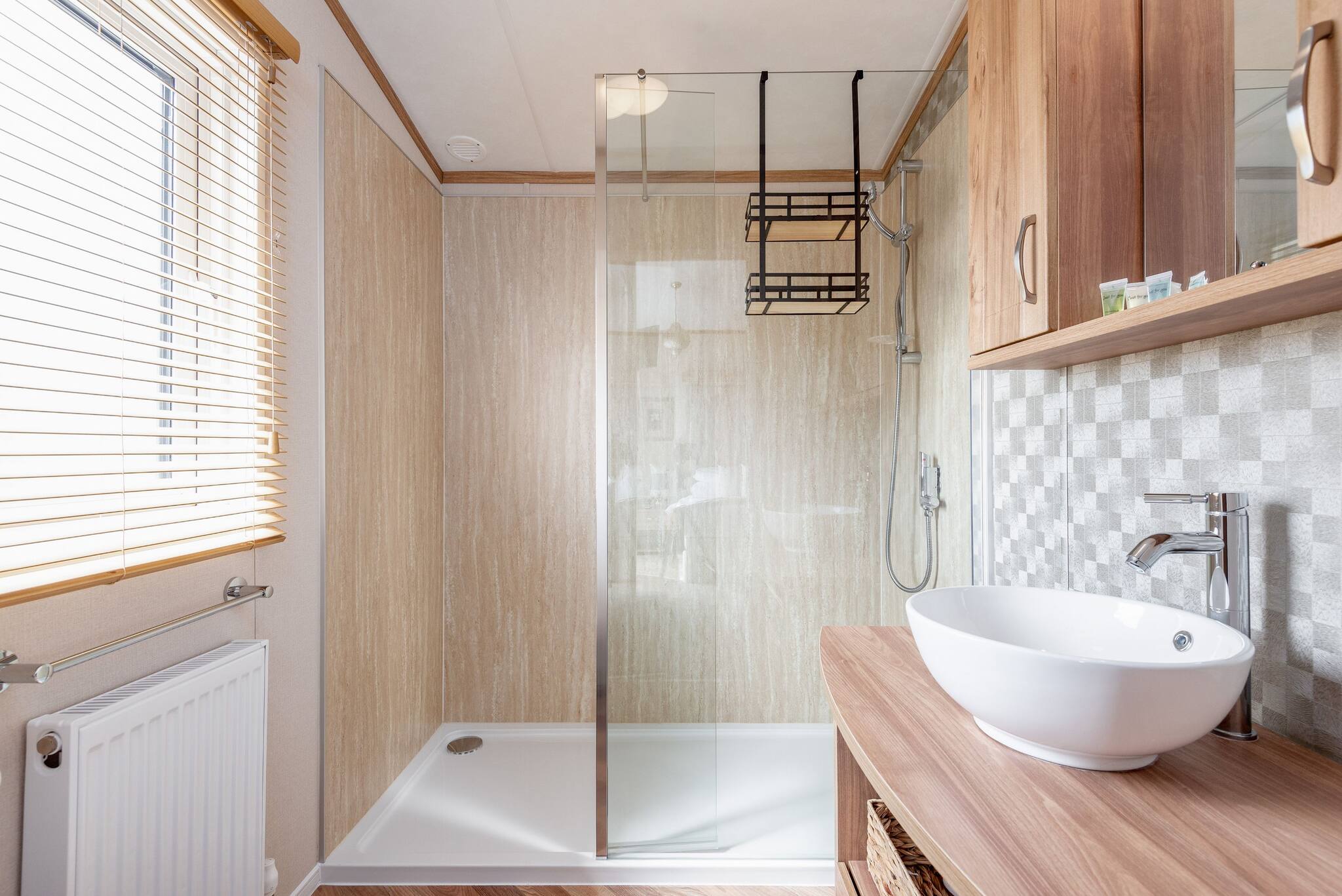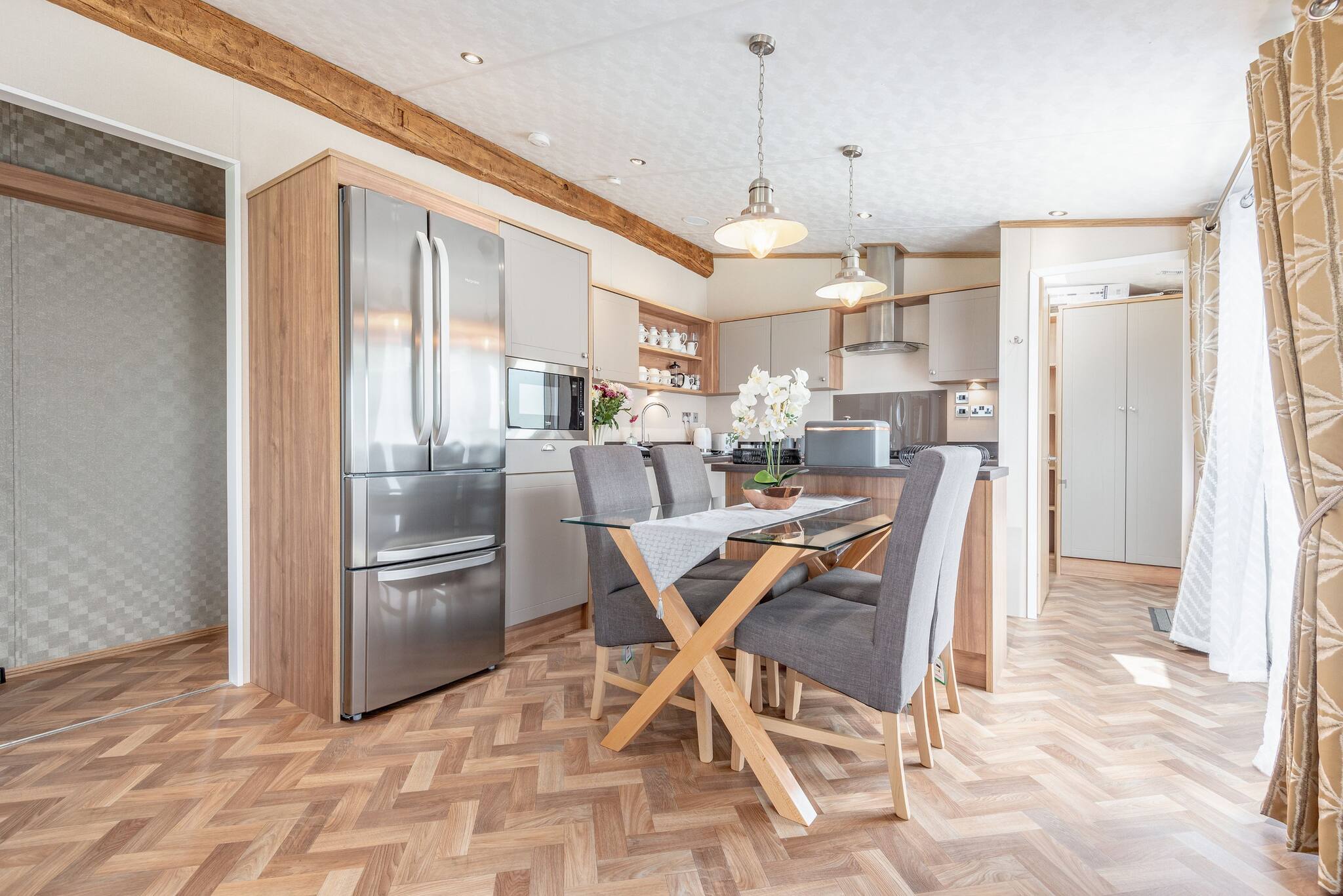 As a self-catering lodge, you'll find everything you need for a perfect stay. The kitchen is very modern and includes an island as well as a freestanding American-style fridge freezer, the perfect home-from-home!