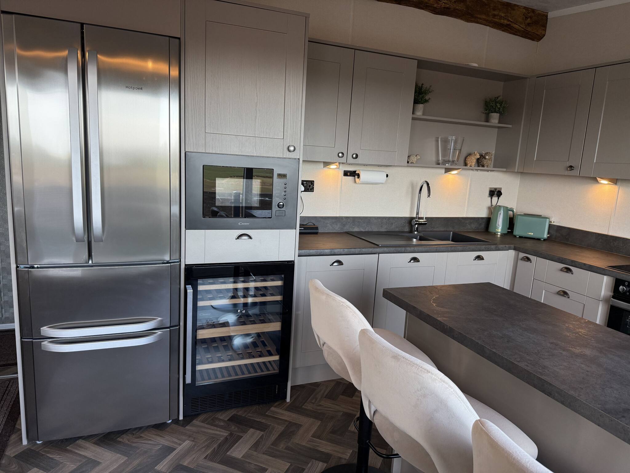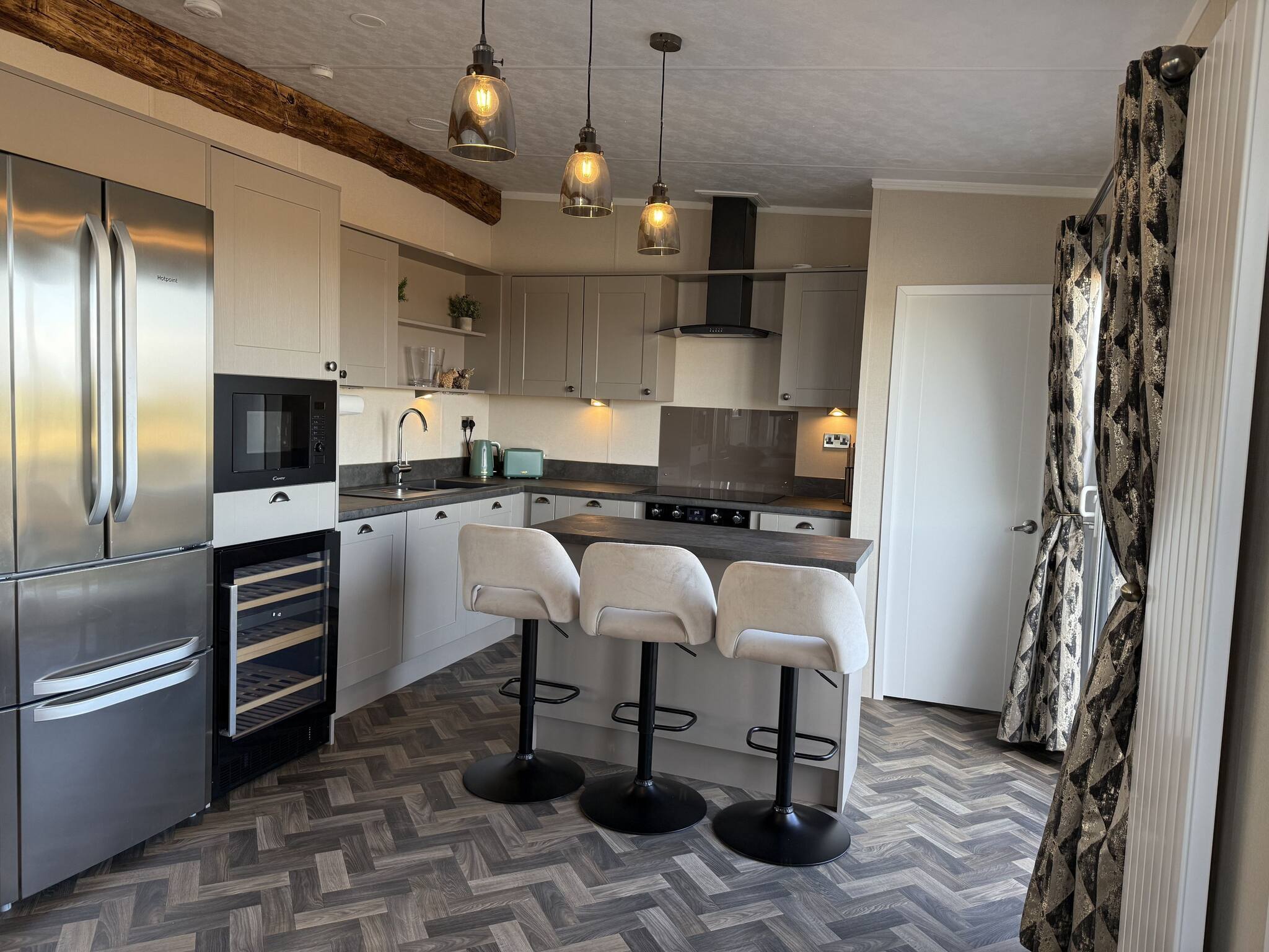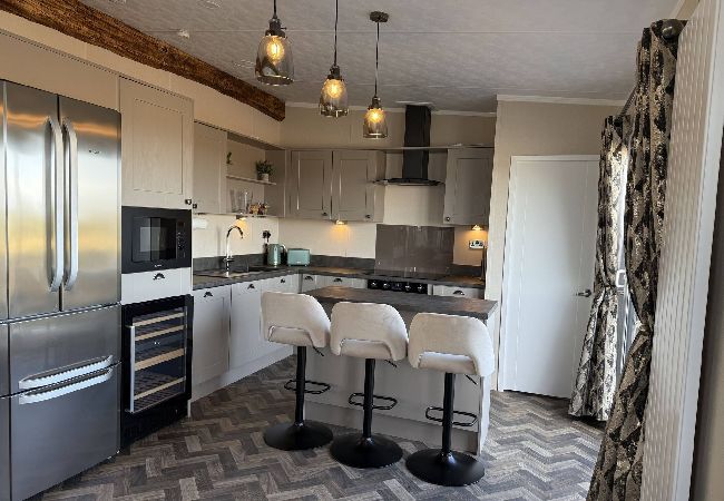 As a self-catering lodge, you will find everything you need for a perfect stay. The modern kitchen is fully equipped, complete with an island and a freestanding American-style fridge freezer, offering all the conveniences of home.
