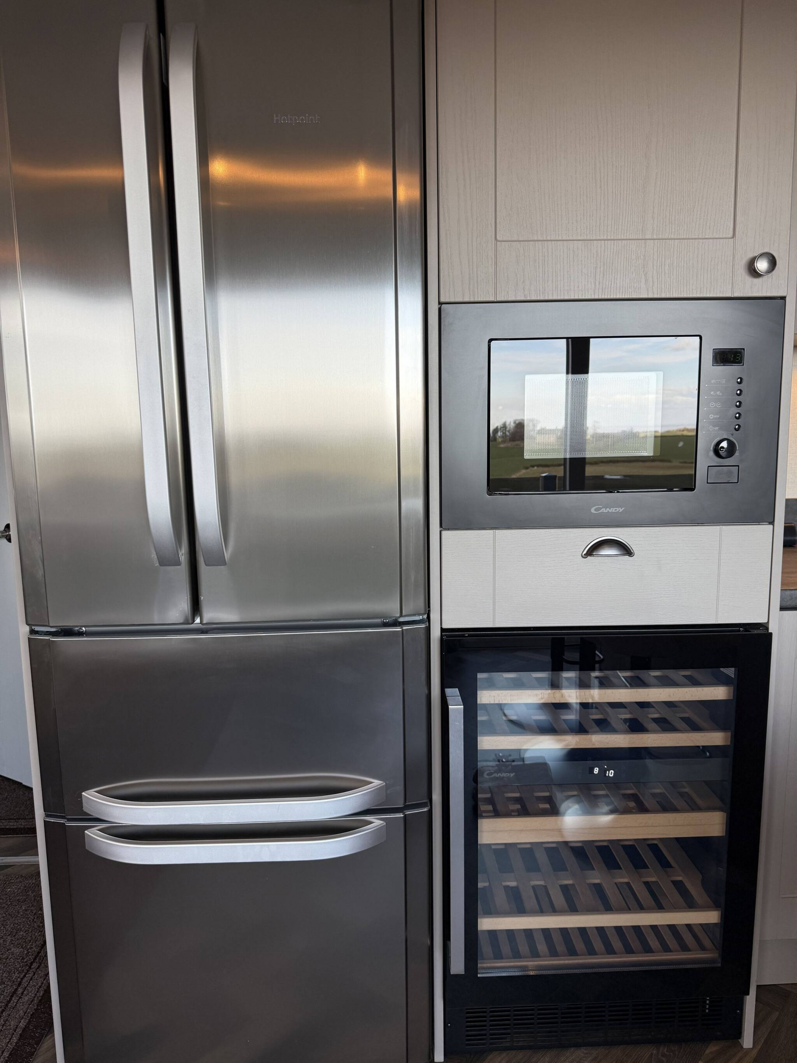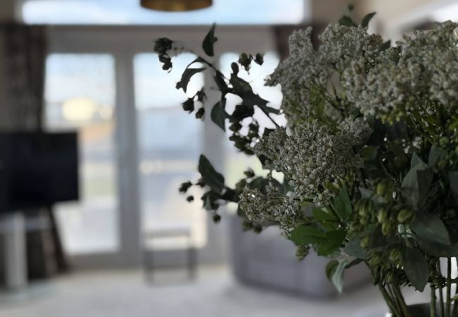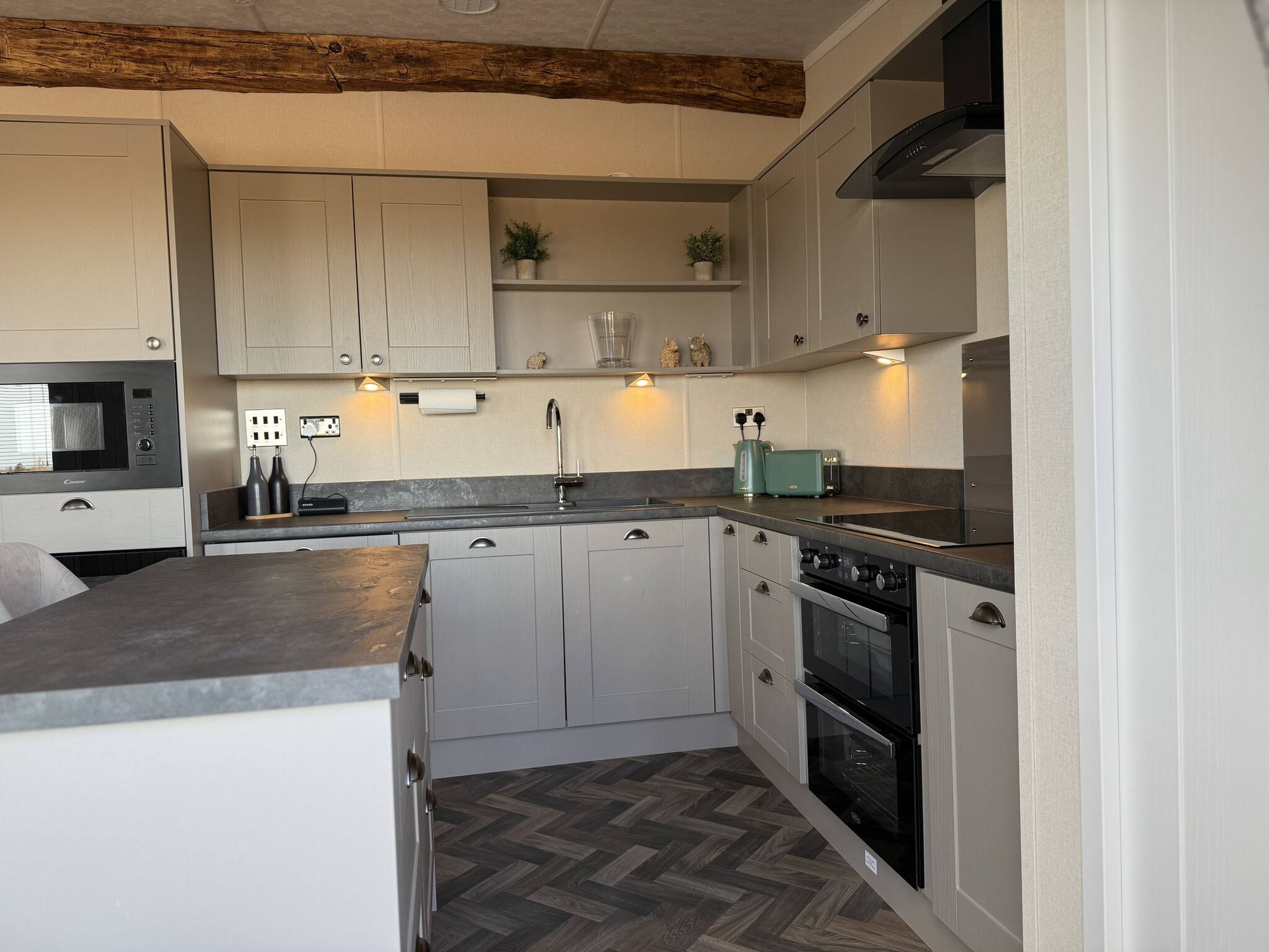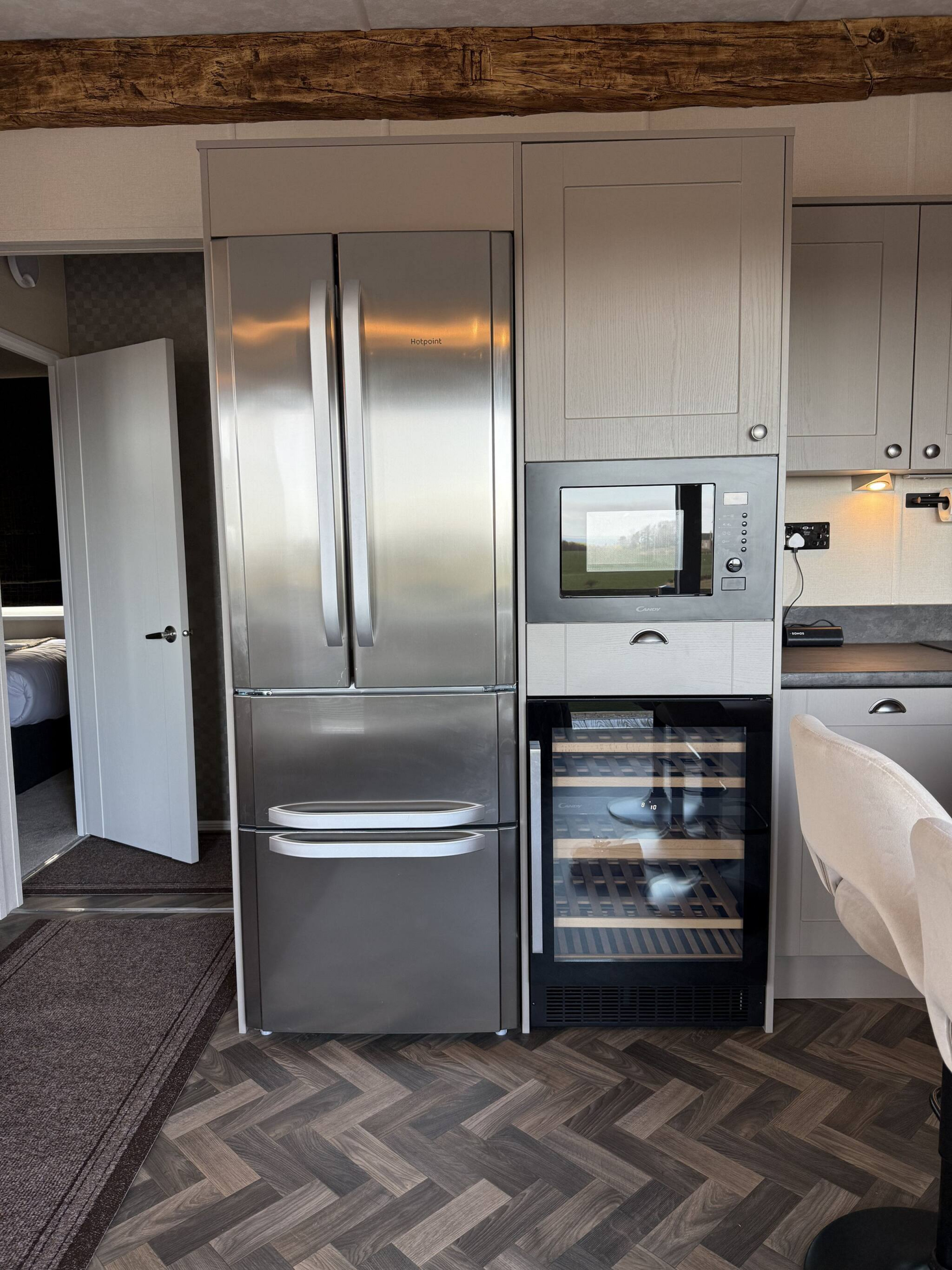 As a self-catering lodge, you will find everything you need for a perfect stay. The modern kitchen is fully equipped, complete with an island and a freestanding American-style fridge freezer, offering all the conveniences of home.