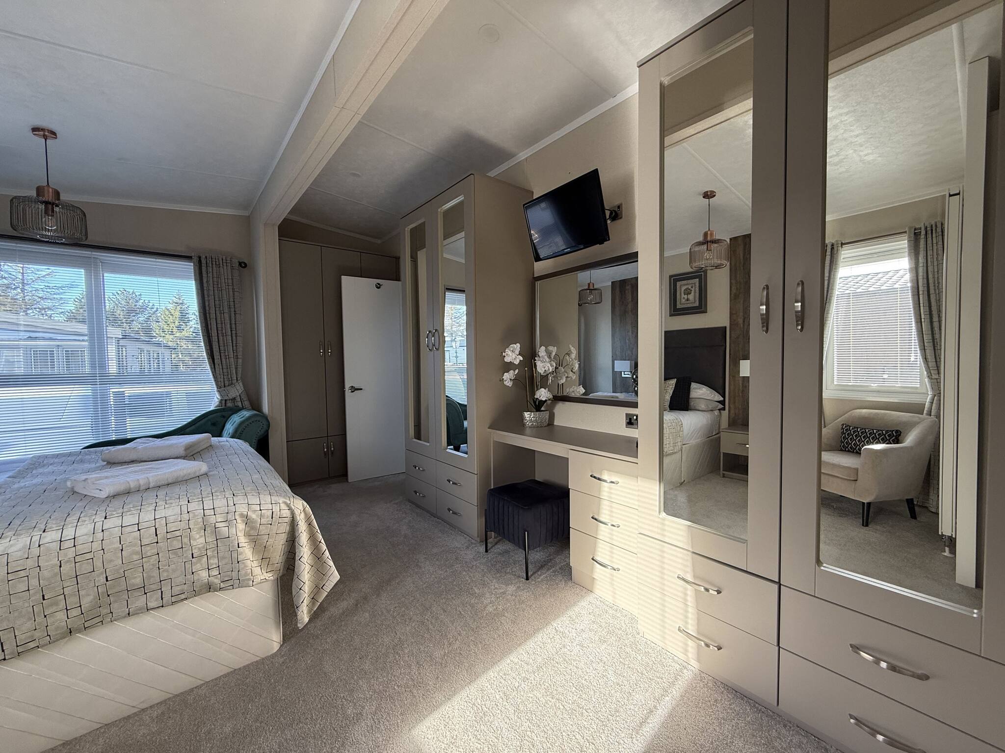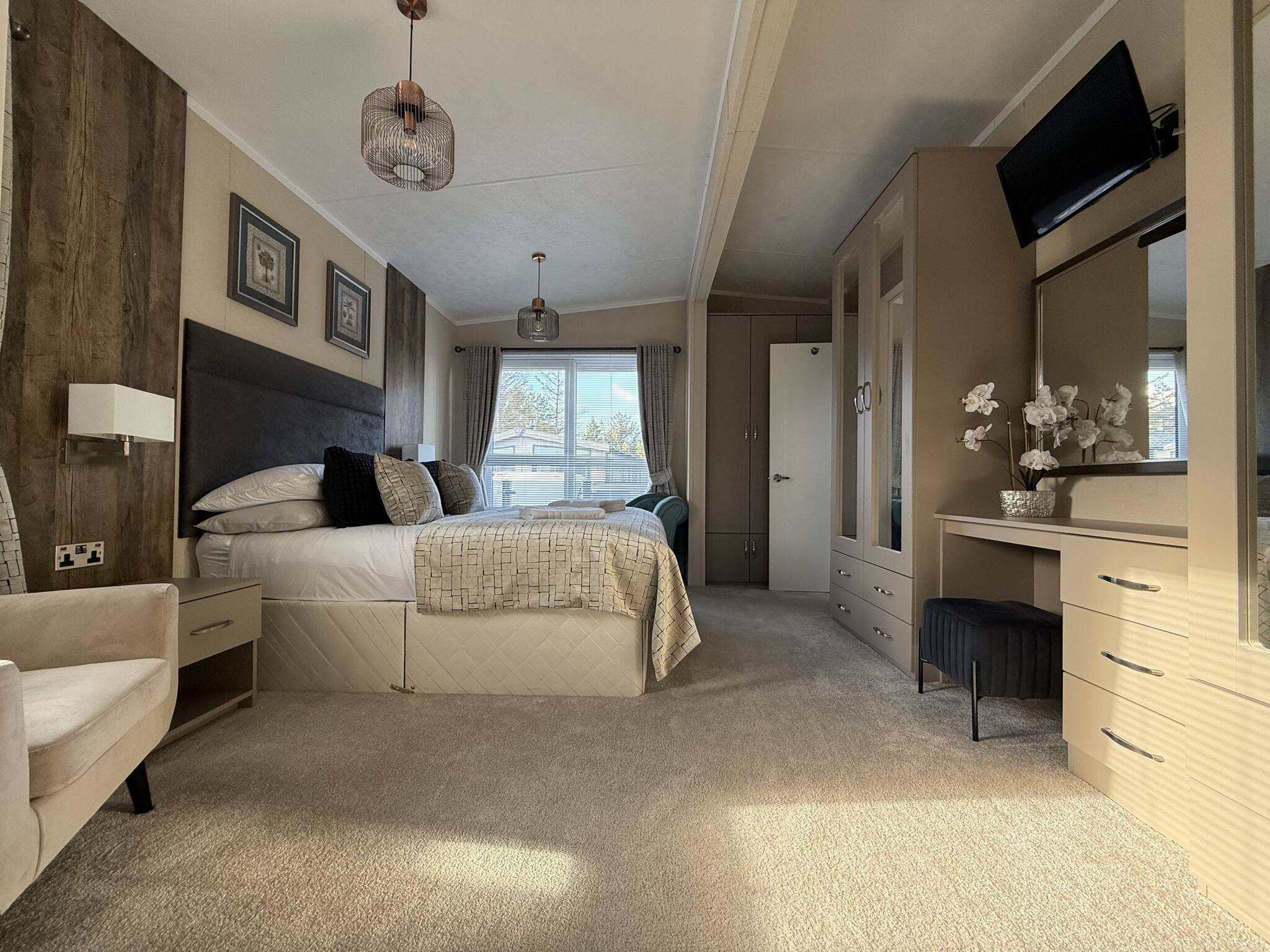 In the first bedroom, you will find a double bed, wardrobe, chest of drawers, dressing table and smart TV with a separate ensuite with toilet and basin.