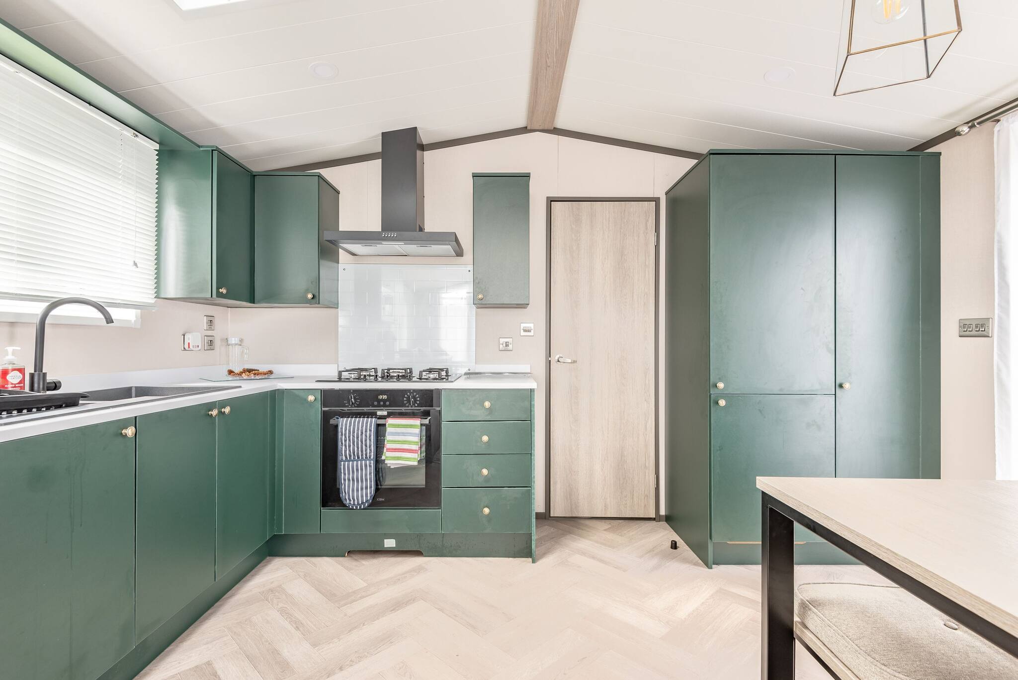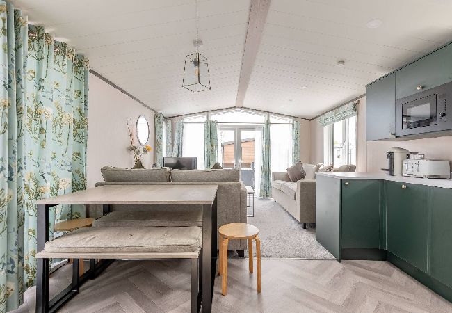 As a self-catering lodge, you will find everything you need for a perfect stay. The modern kitchen is fully equipped, complete with an island and a freestanding American-style fridge freezer, offering all the conveniences of home.