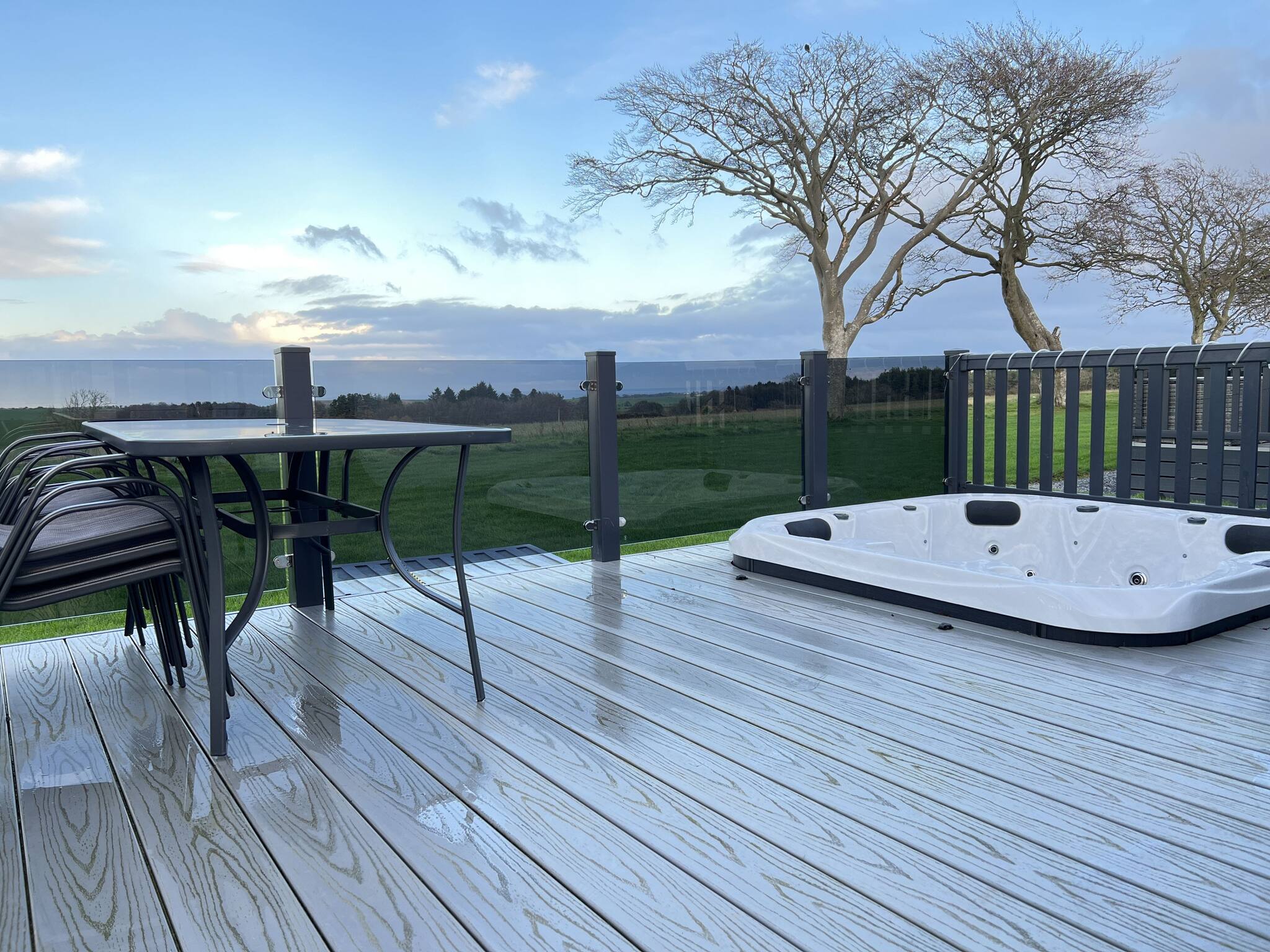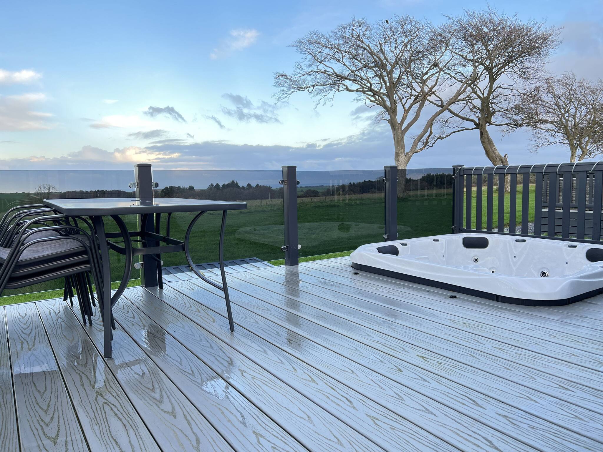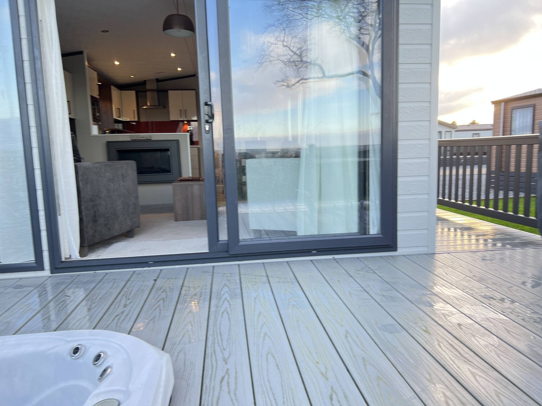 The open-plan layout includes a large kitchen/dining area and a spacious lounge. The decking area is enclosed, which is ideal for pets and the safety of young kids. The hot tub is sunken into the decking, which is great for privacy and easy access.
