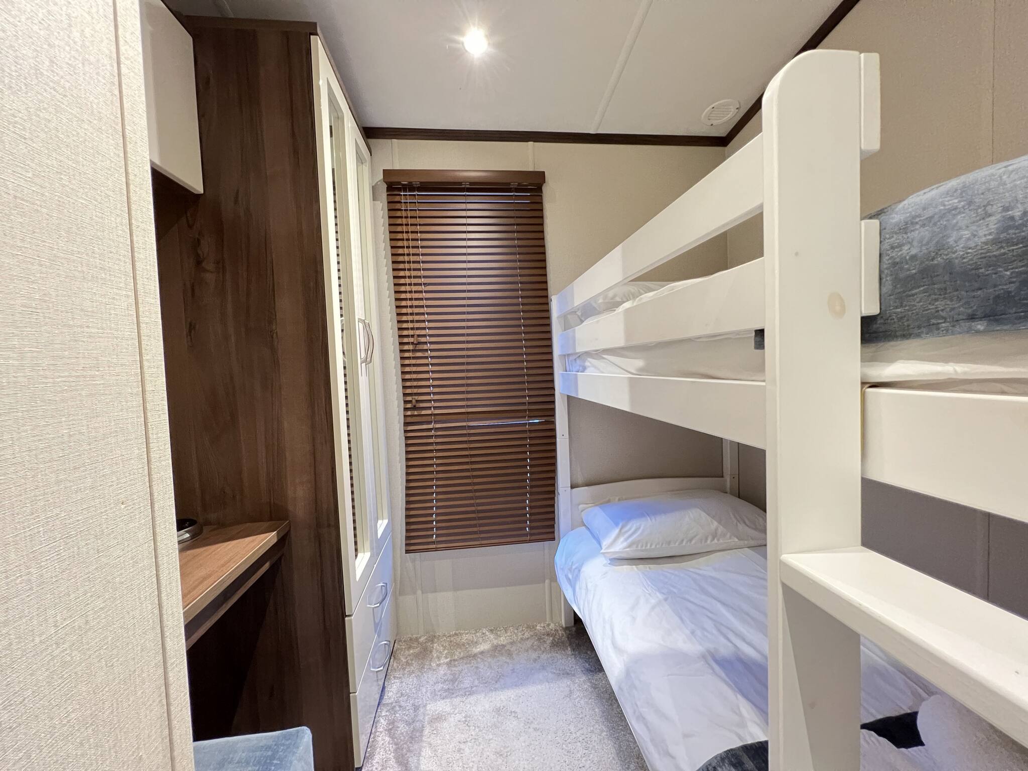 The second bedroom contains two single beds and a wardrobe with drawers below.