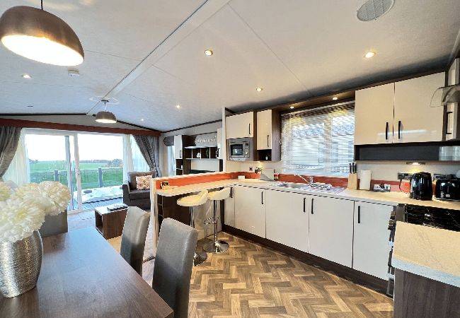As a self-catering lodge, you will find everything you need for a perfect stay. The modern kitchen is fully equipped, complete with an island and a freestanding American-style fridge freezer, offering all the conveniences of home.