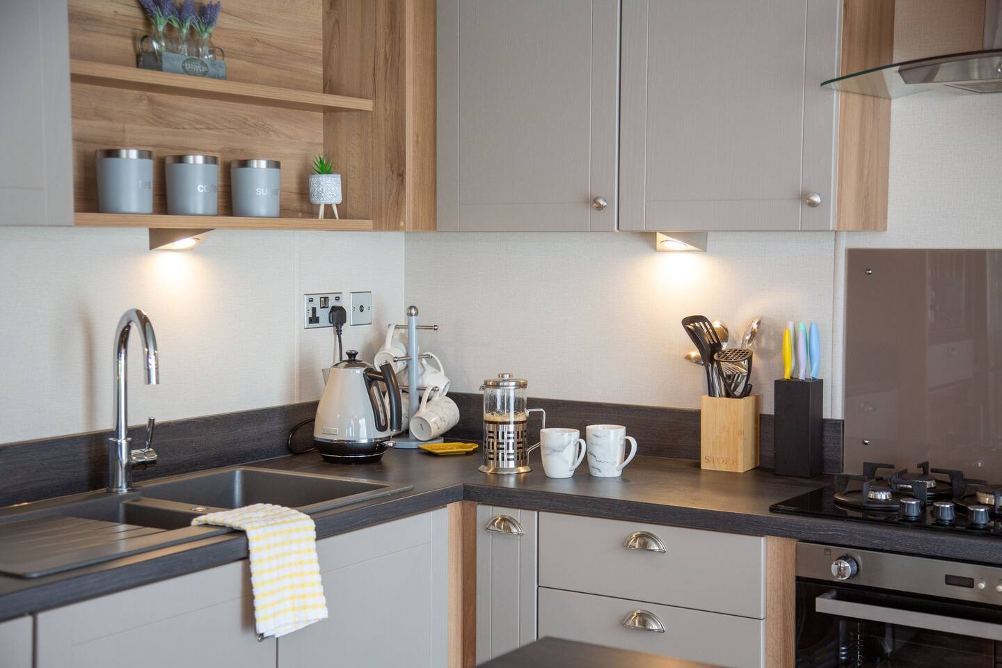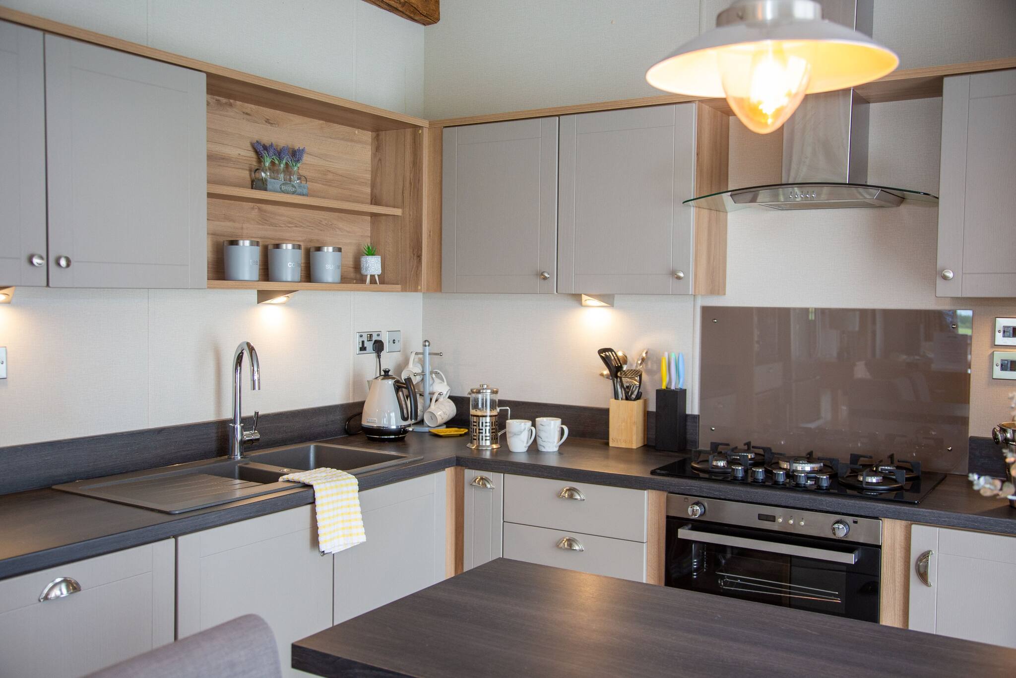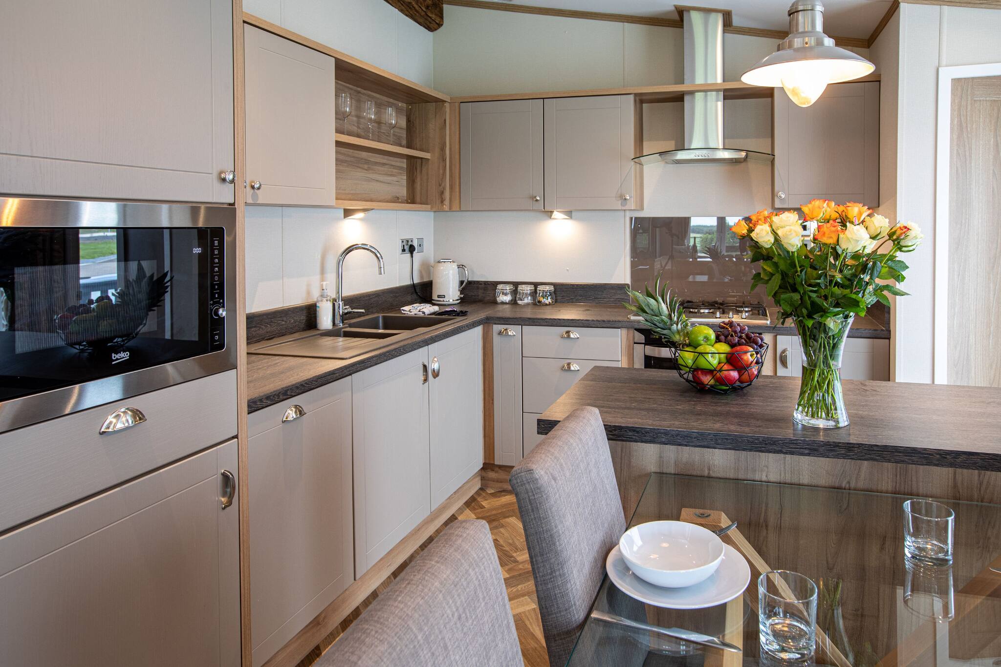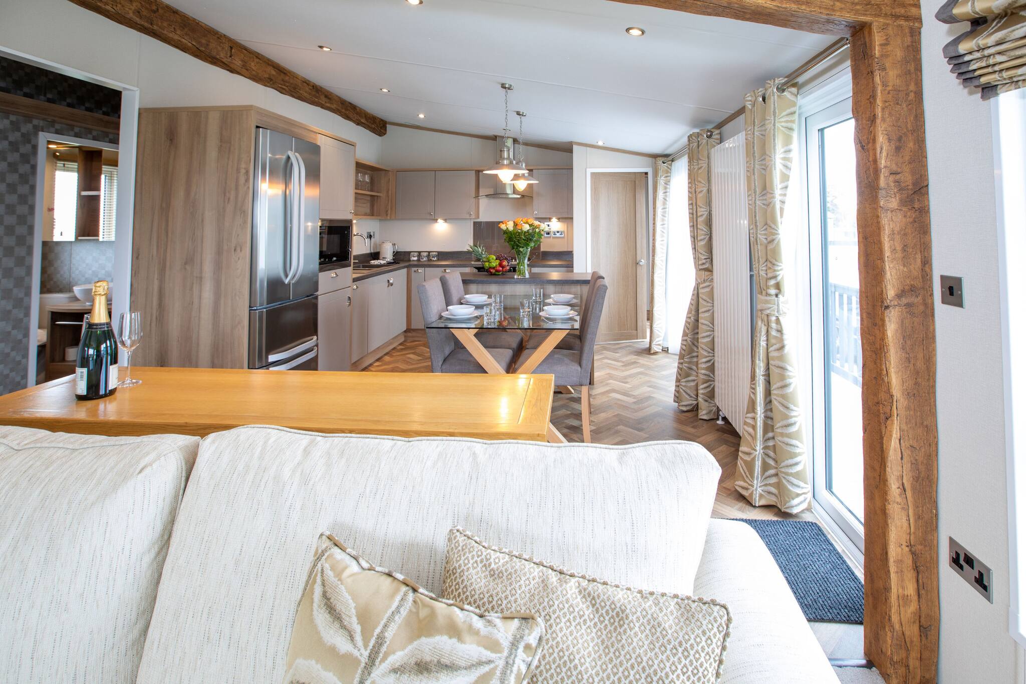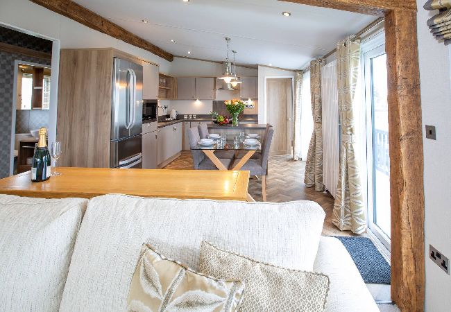 As a self-catering lodge, you'll find everything you need for a perfect stay. The kitchen is very modern and includes an island as well as a freestanding American-style fridge freezer, the perfect home-from-home!