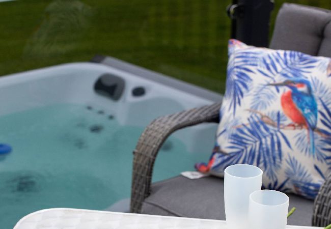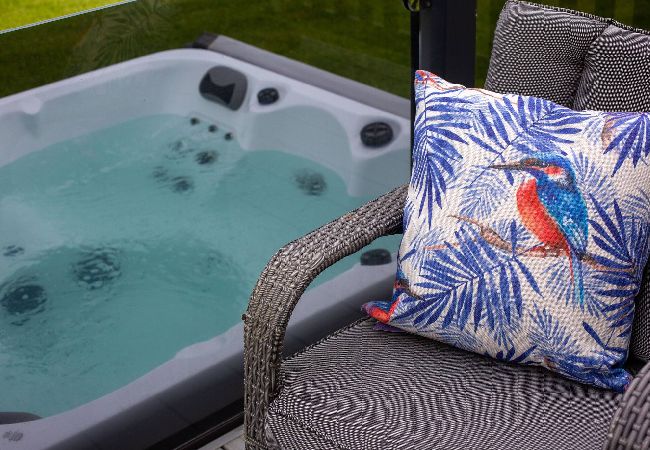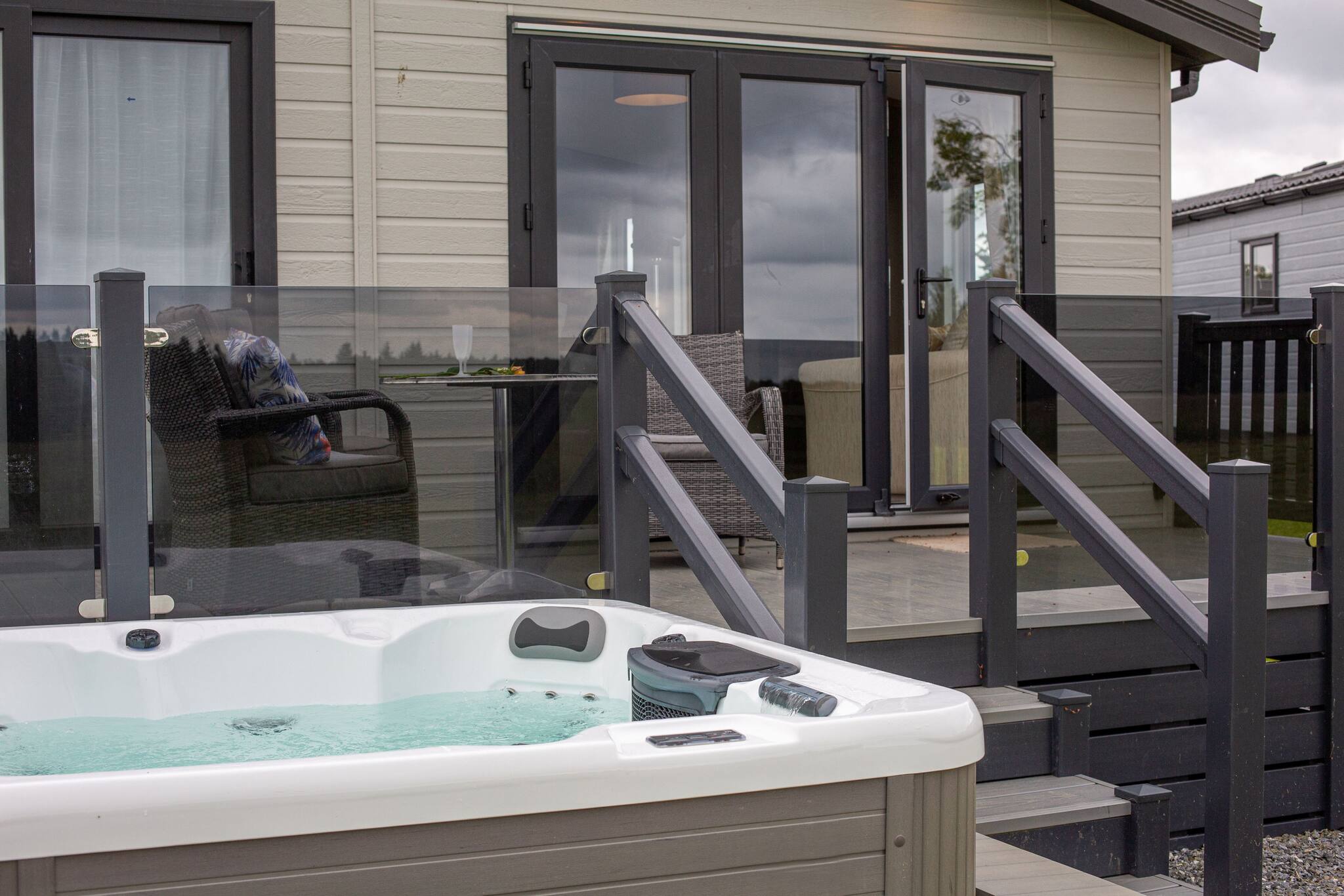 Luxury two-bedroom lodge with hot tub and beautiful uninterrupted views for complete privacy. This spacious lodge has two bedrooms and a snug room. Please request extra linen for the sofa bed if necessary (an additional fee applies ). The open-plan lounge/kitchen/dining area has doors leading to decking (not enclosed) with garden furniture and a hot tub next to the lodge. High-quality fixtures and fittings and modern, contemporary decor throughout.