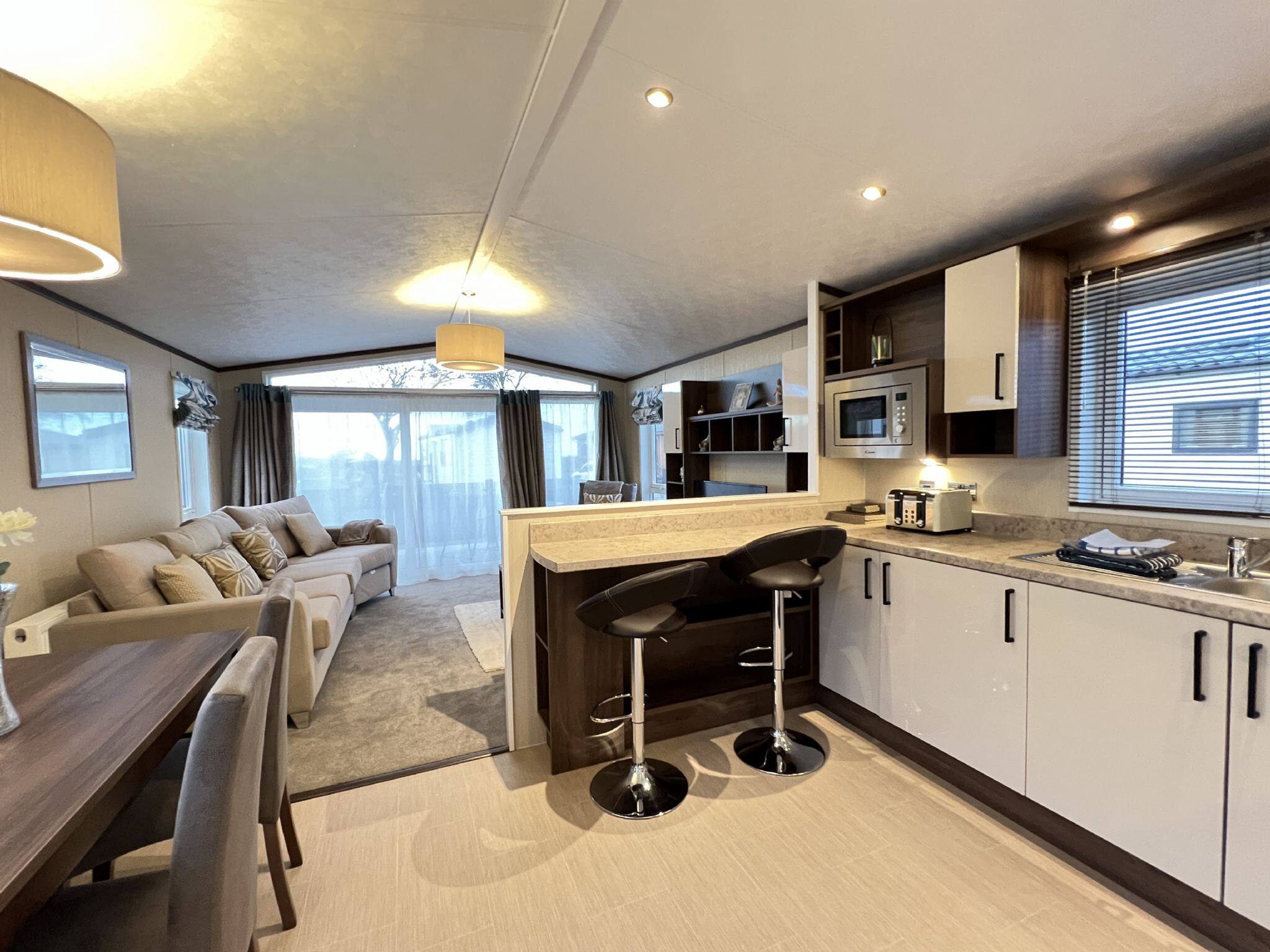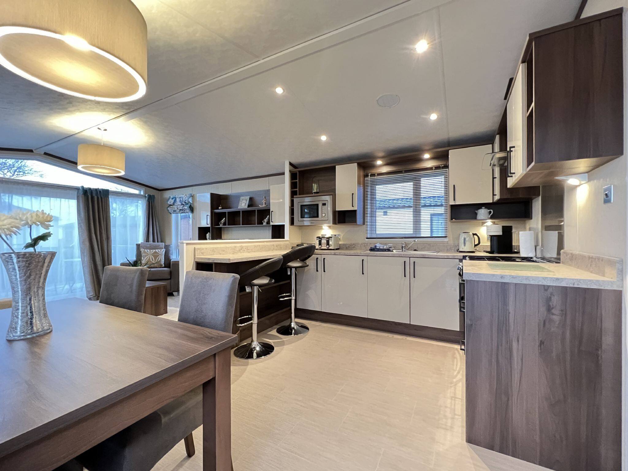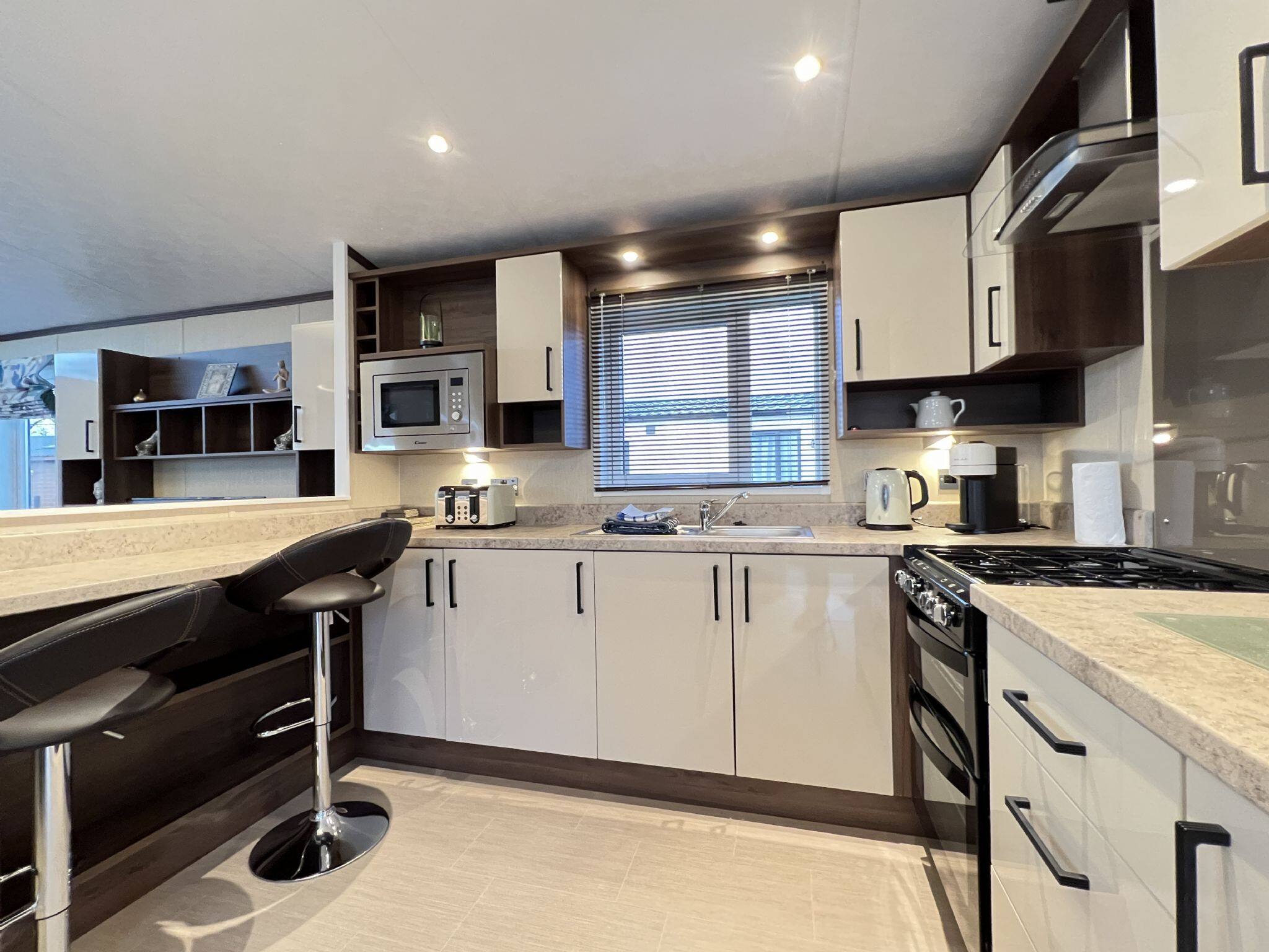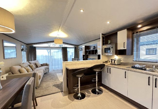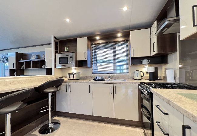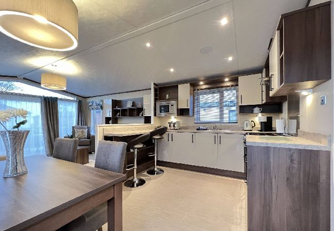 As a self-catering lodge, you'll find everything you need for a perfect stay. The kitchen is very modern and includes an island as well as a freestanding American-style fridge freezer, the perfect home-from-home!