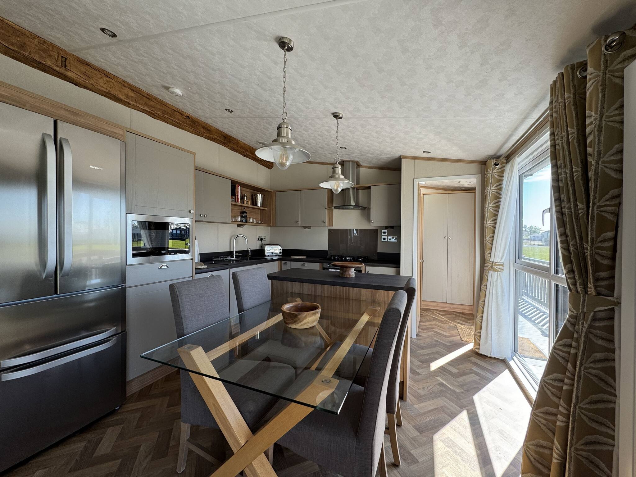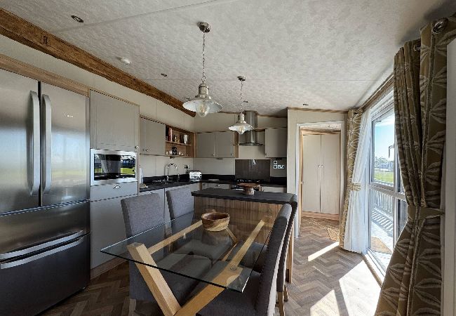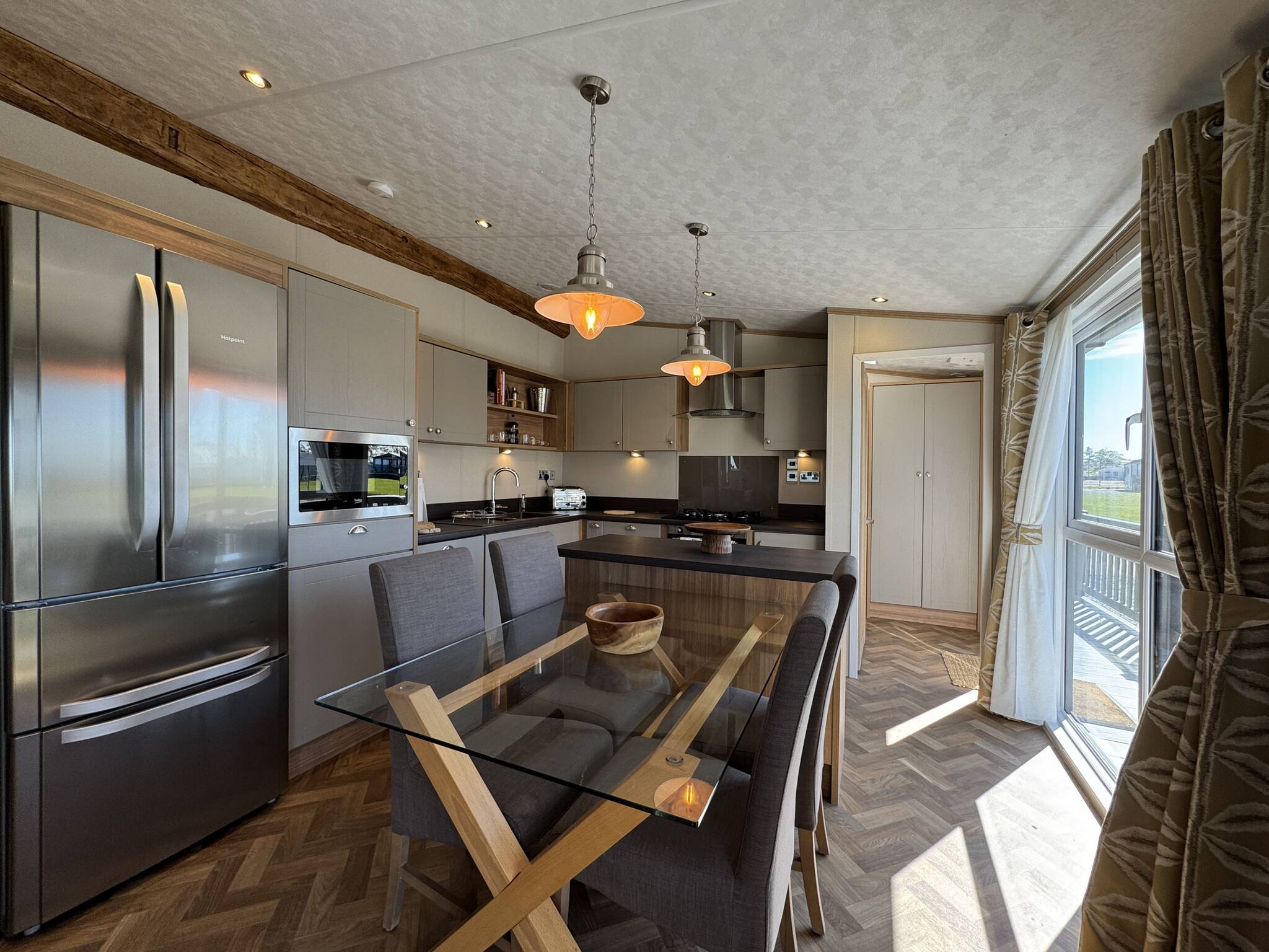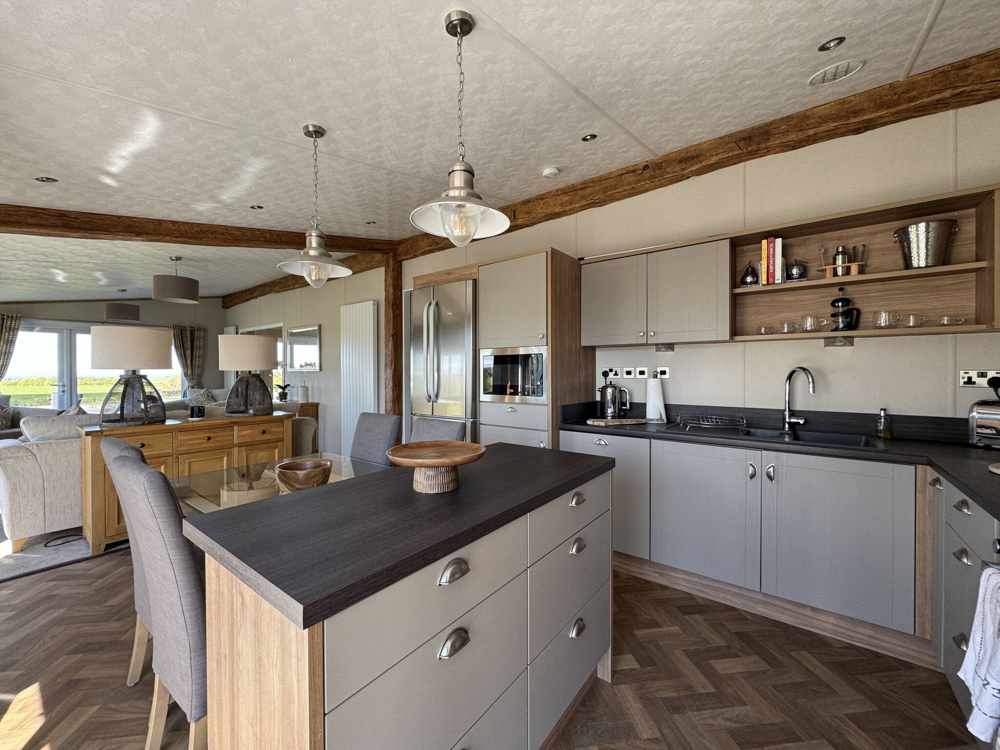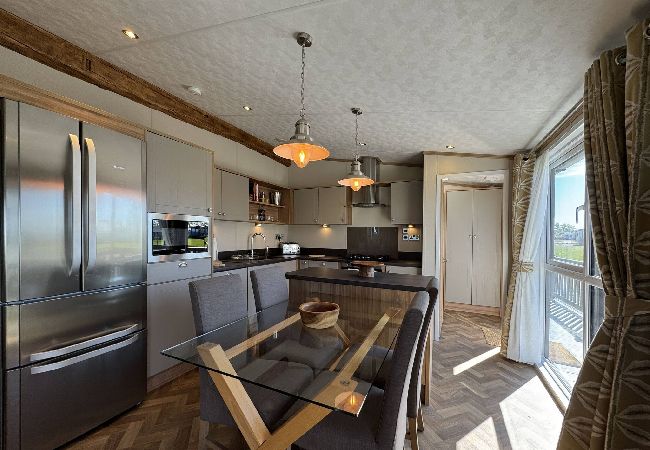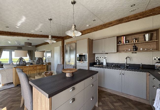 As a self-catering lodge, you'll find everything you need for a perfect stay. The kitchen is very modern and includes an island as well as a freestanding American-style fridge freezer, the perfect home-from-home!
