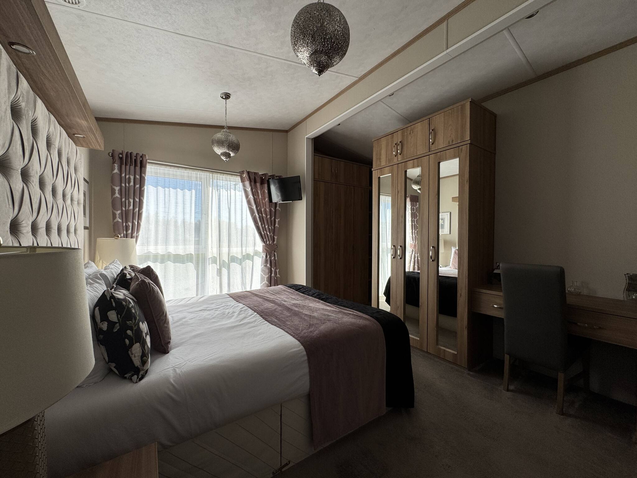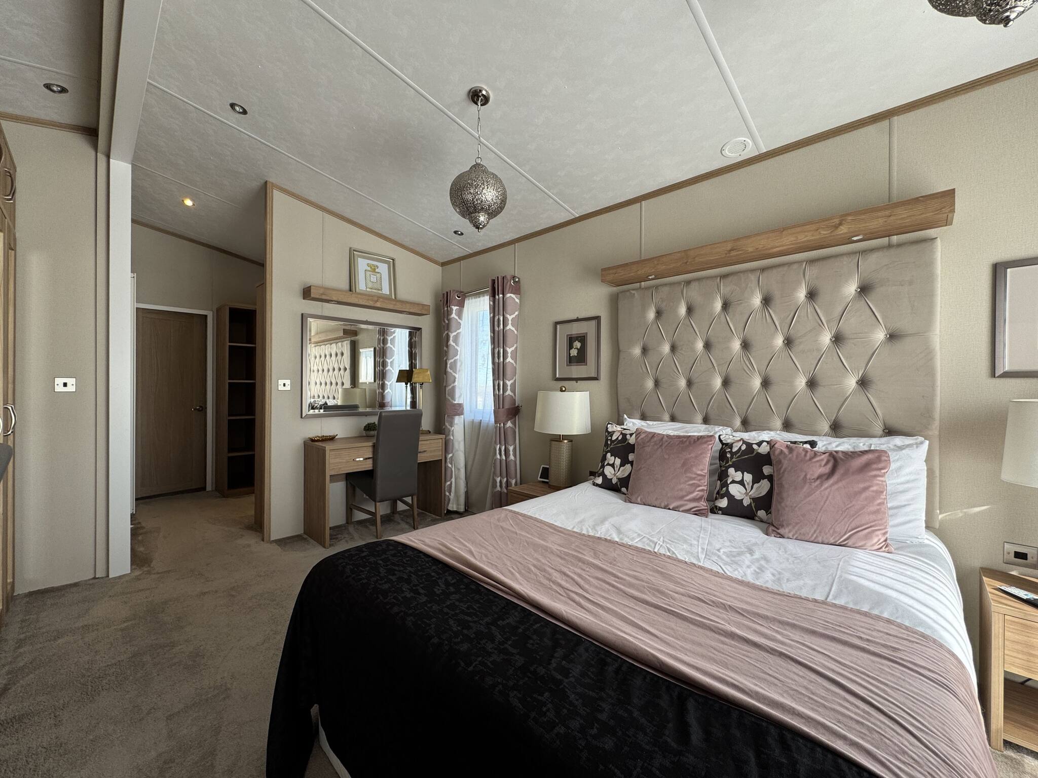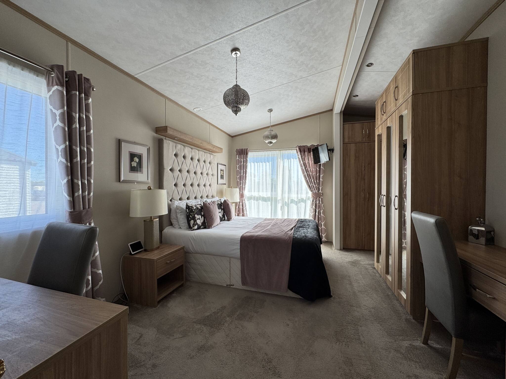 Lodge 59 can comfortably sleep up to six. The master bedroom (king-size bed) includes an en-suite bathroom with a walk-in shower. The second bedroom comprises two single beds that can be arranged into a double bed. There is also a three-piece family bathroom with an overhead shower accessible from the hallway.