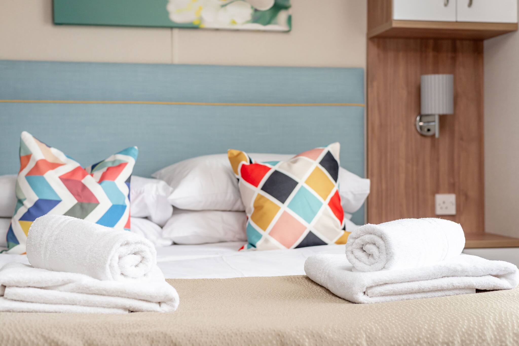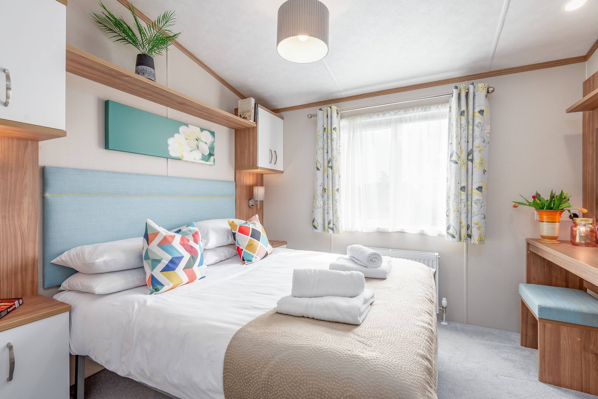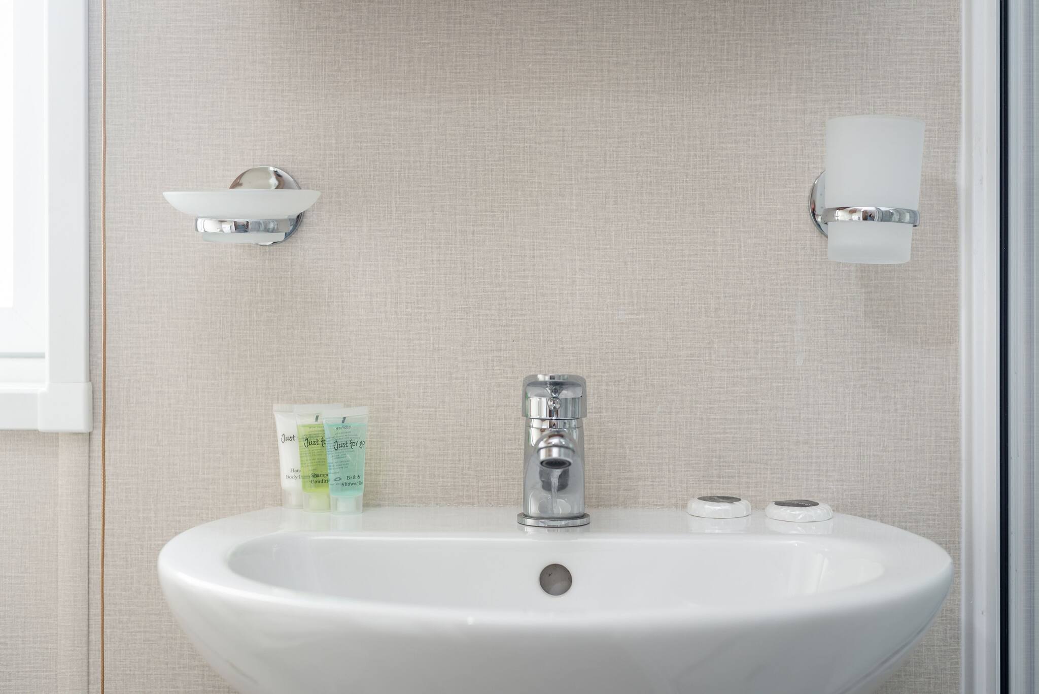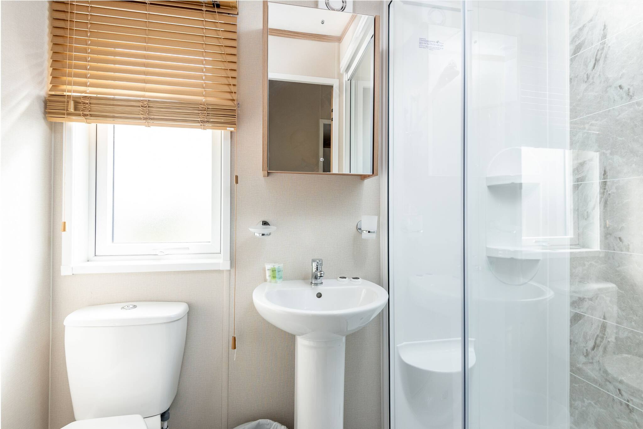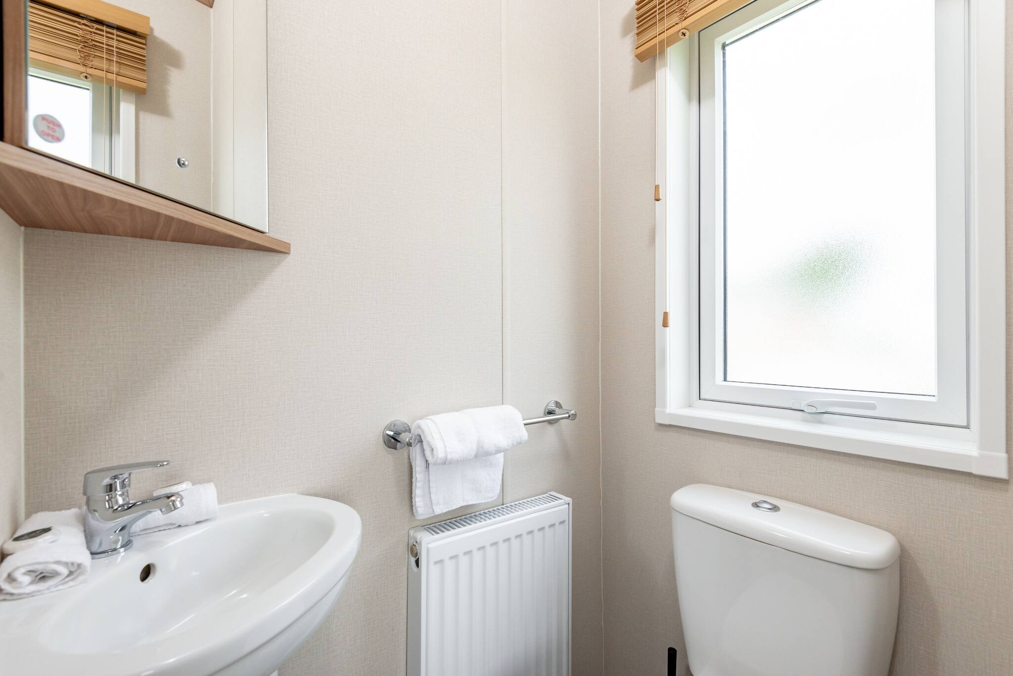 Lodge 19 can comfortably sleep up to six guests. The master bedroom (kingsize bed) includes an en-suite bathroom with a walk-in shower. The second bedroom comprises two single beds that can be arranged into a double bed. There is also a three-piece family bathroom with an overhead shower accessible from the hallway.