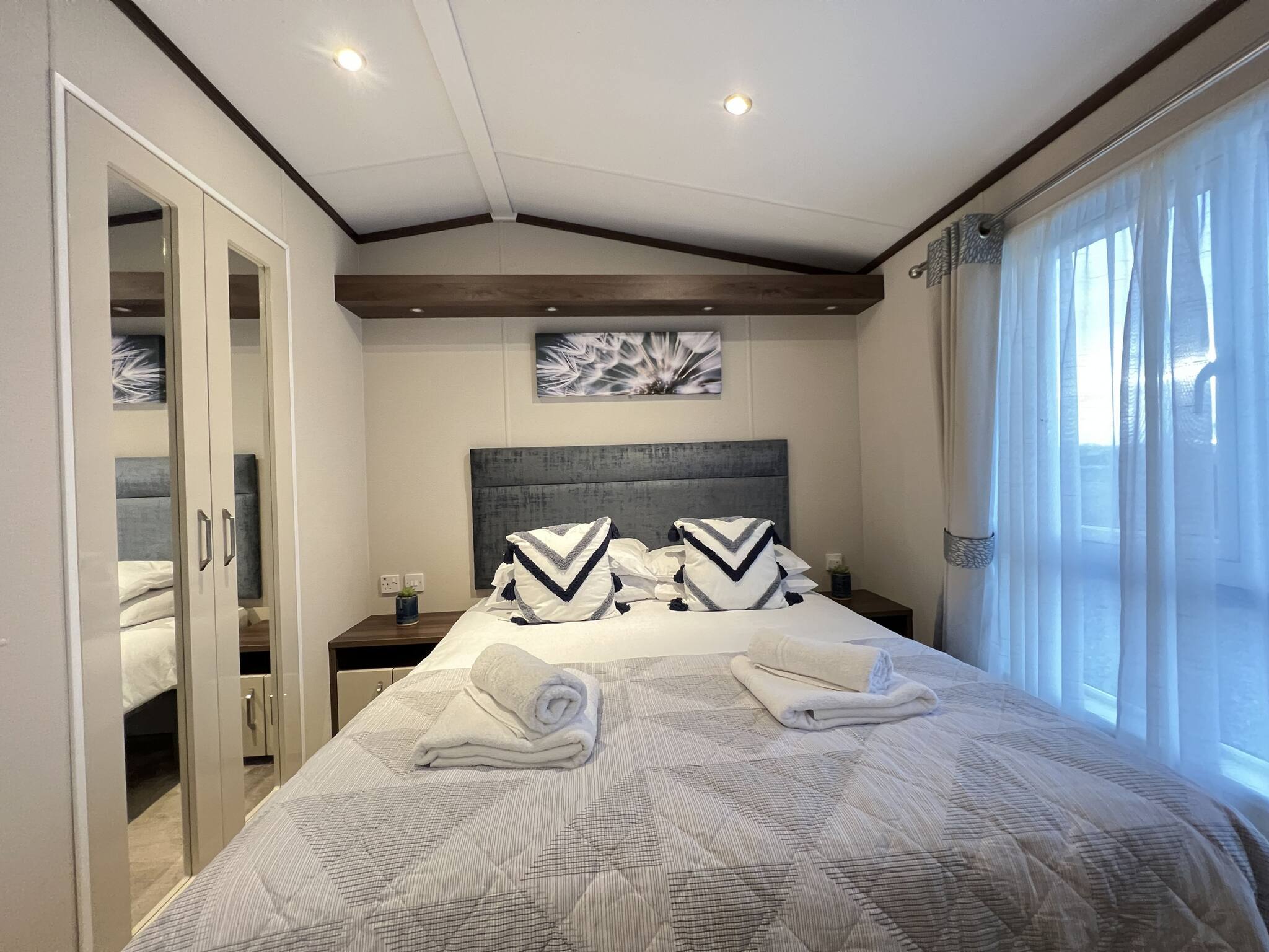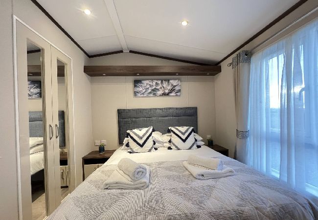 Discover a perfect haven of relaxation as you step into the lodge, offering stunning views across the countryside and beyond. With two bedrooms, this lodge comfortably accommodates four adults. The first bedroom boasts a comfort