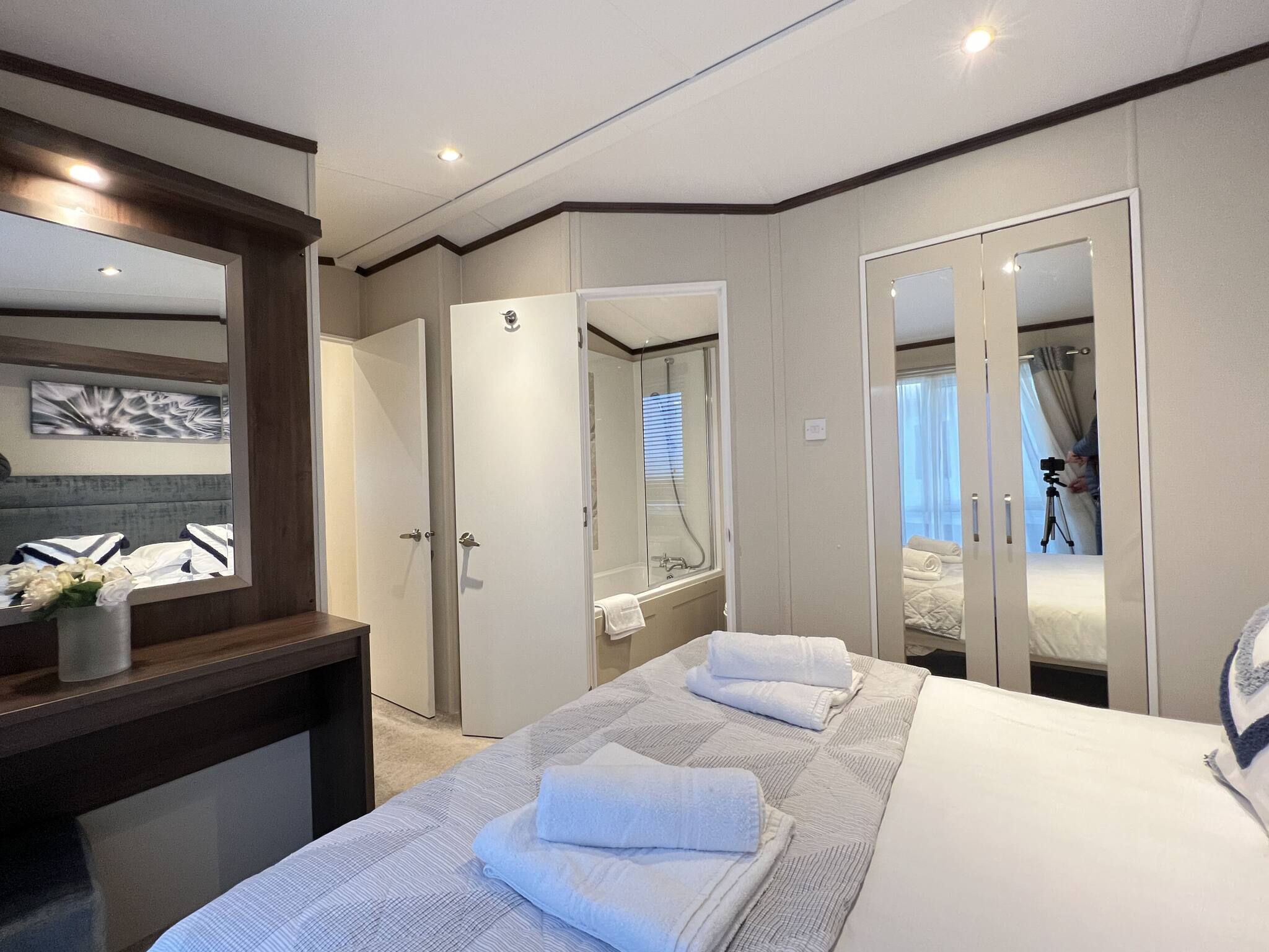 Lodge 19 can comfortably sleep up to six guests. The master bedroom (kingsize bed) includes an en-suite bathroom with a walk-in shower. The second bedroom comprises two single beds that can be arranged into a double bed. There is also a three-piece family bathroom with an overhead shower accessible from the hallway.