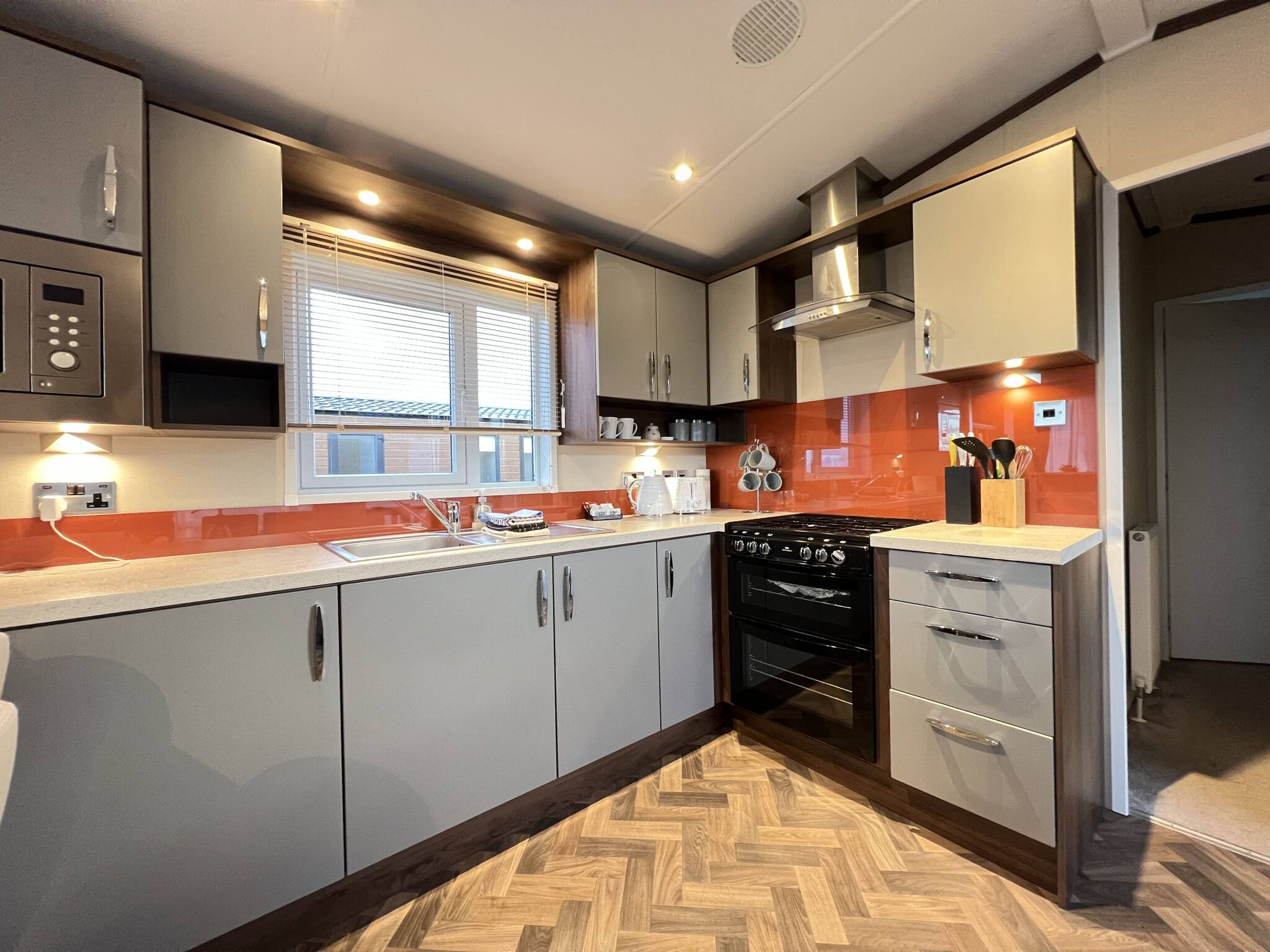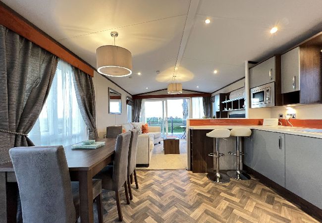 As a self-catering lodge, you'll find everything you need for a perfect stay. The kitchen is very modern and includes an island as well as a freestanding American-style fridge freezer, the perfect home-from-home!