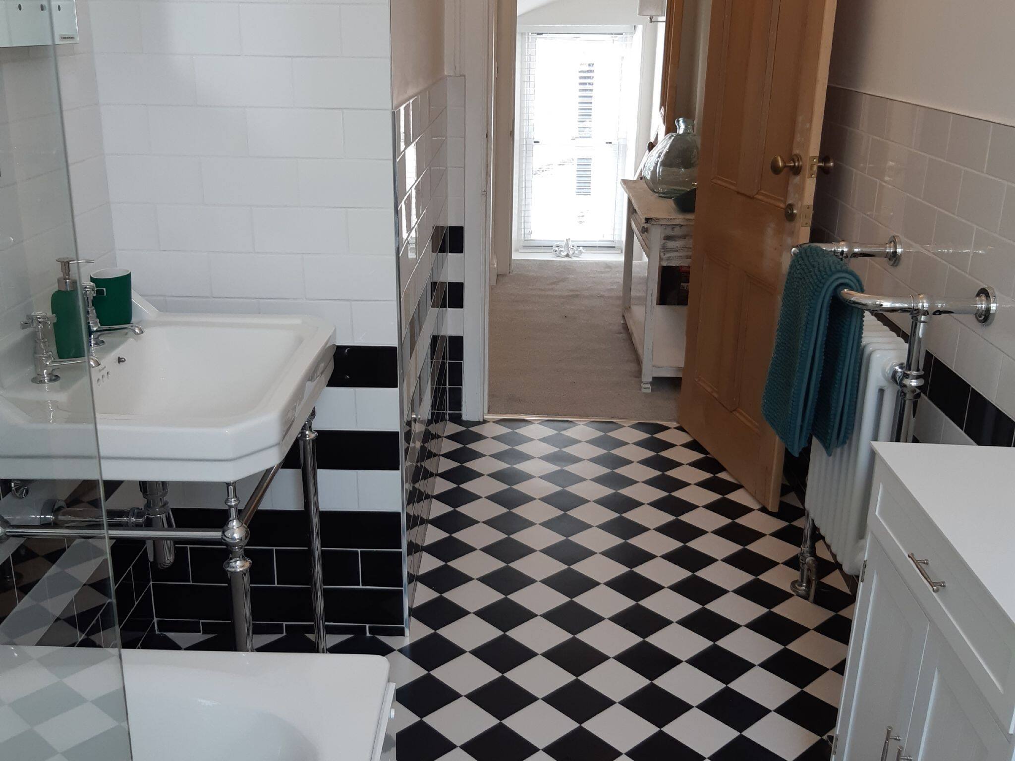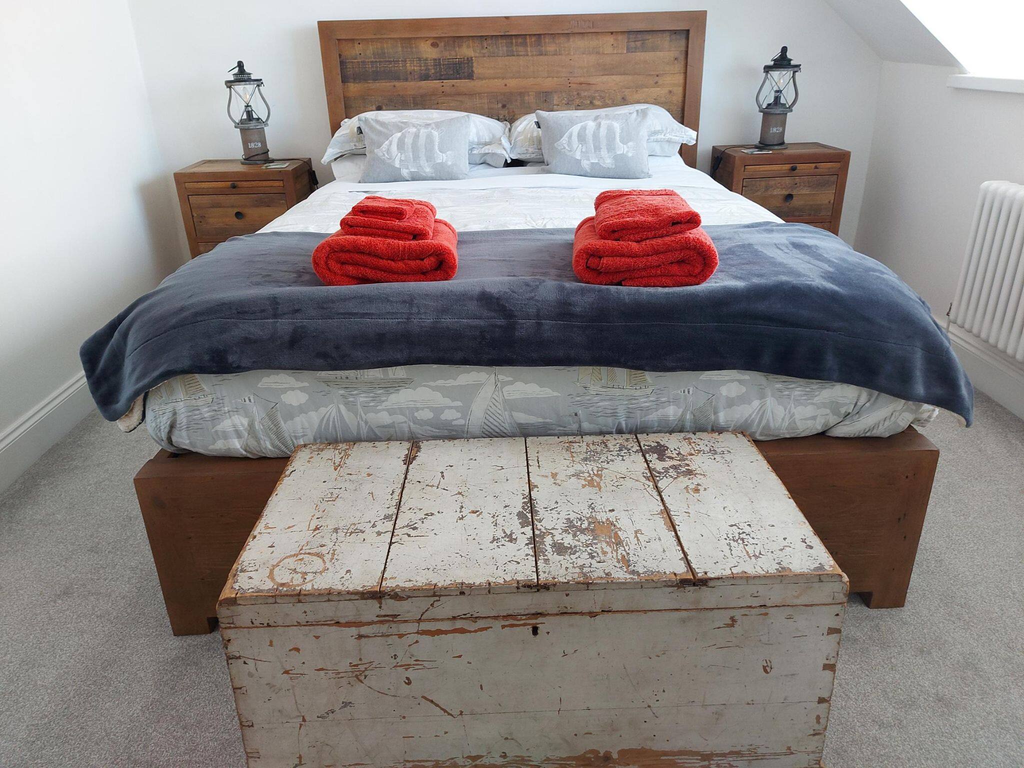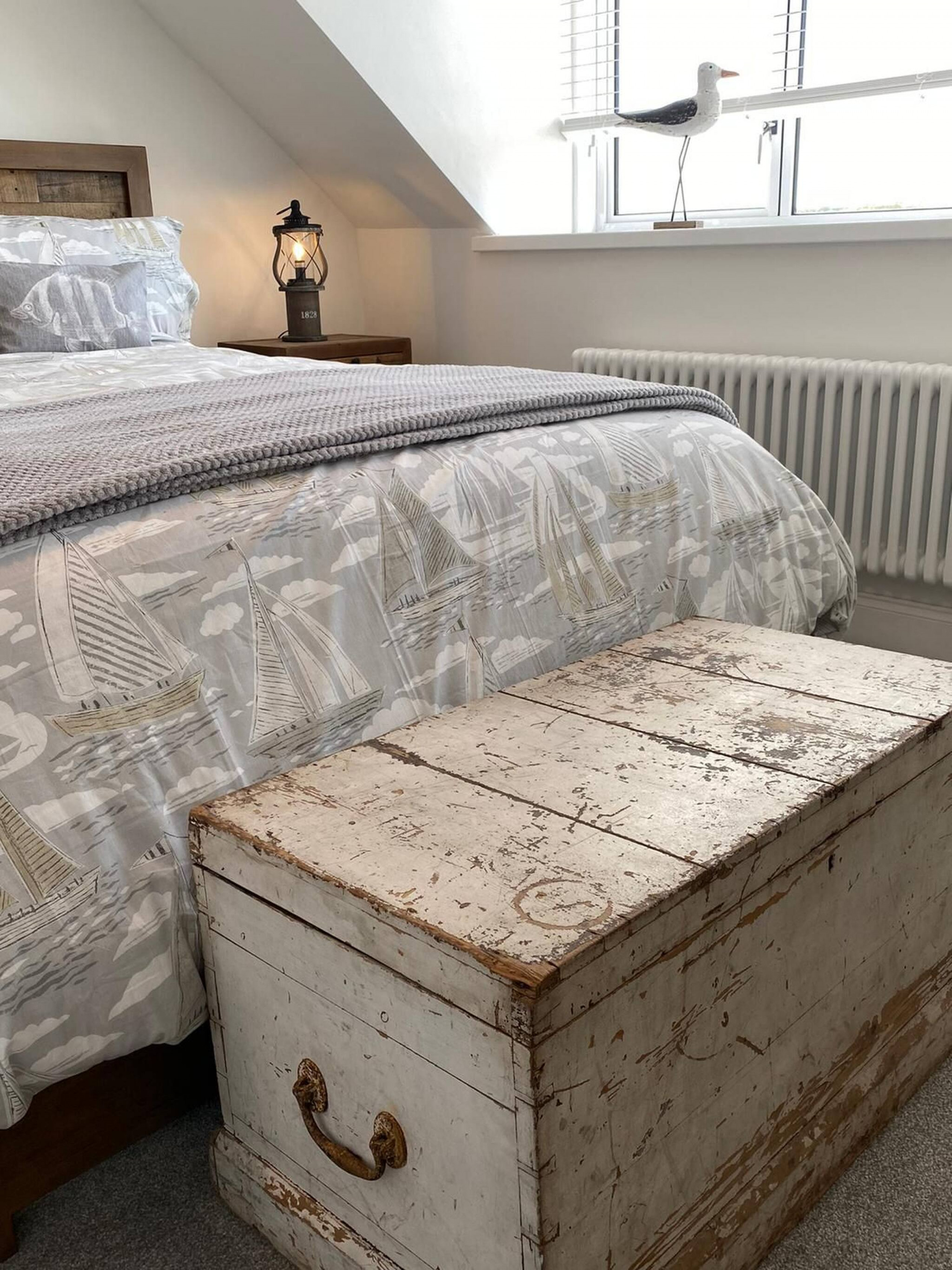 On the upper floor there are a further two double bedrooms and a second spacious bathroom where a beautiful freestanding copper bath is the star of the show! The front bedroom and bathroom both enjoy a sea view.