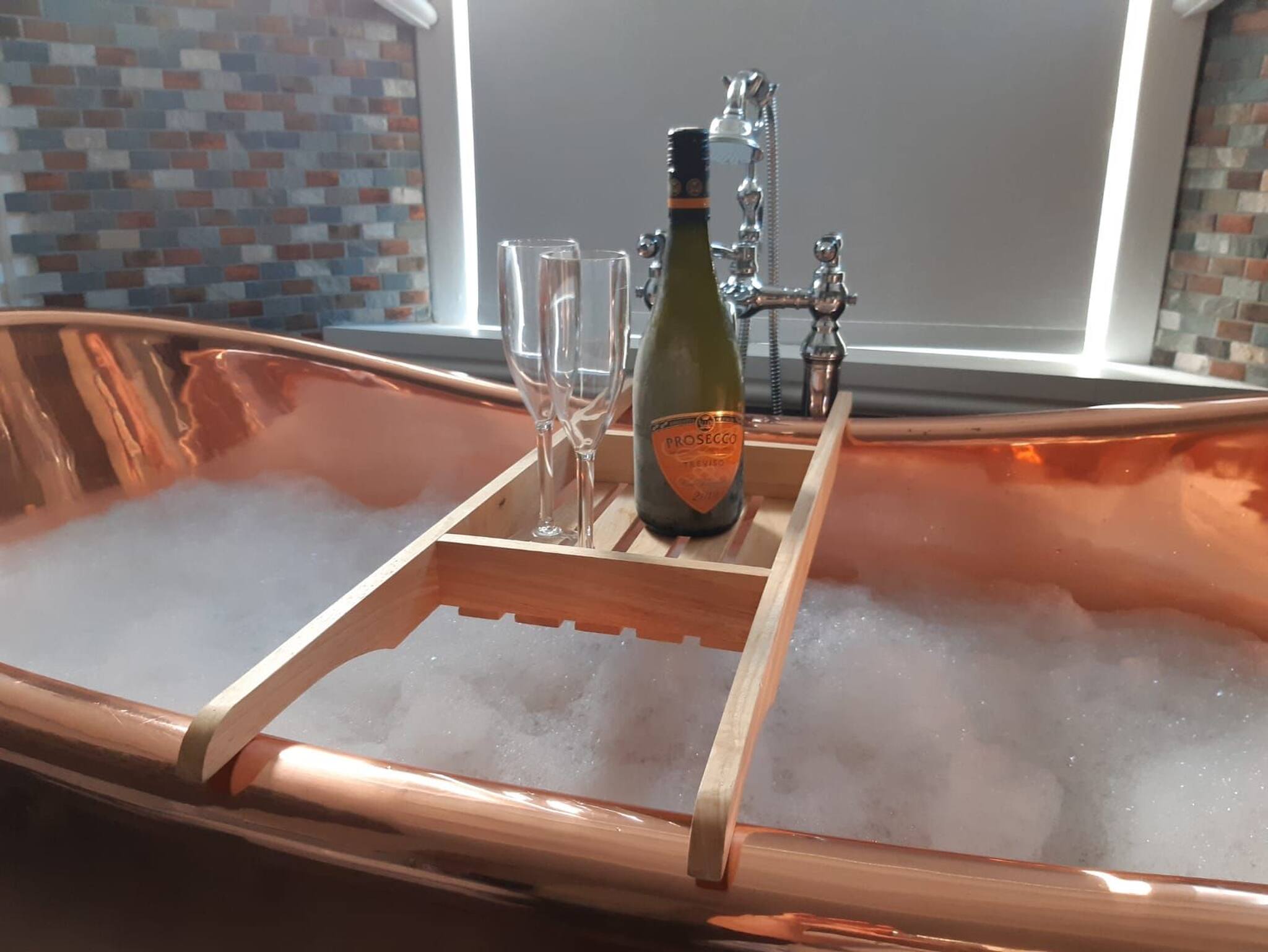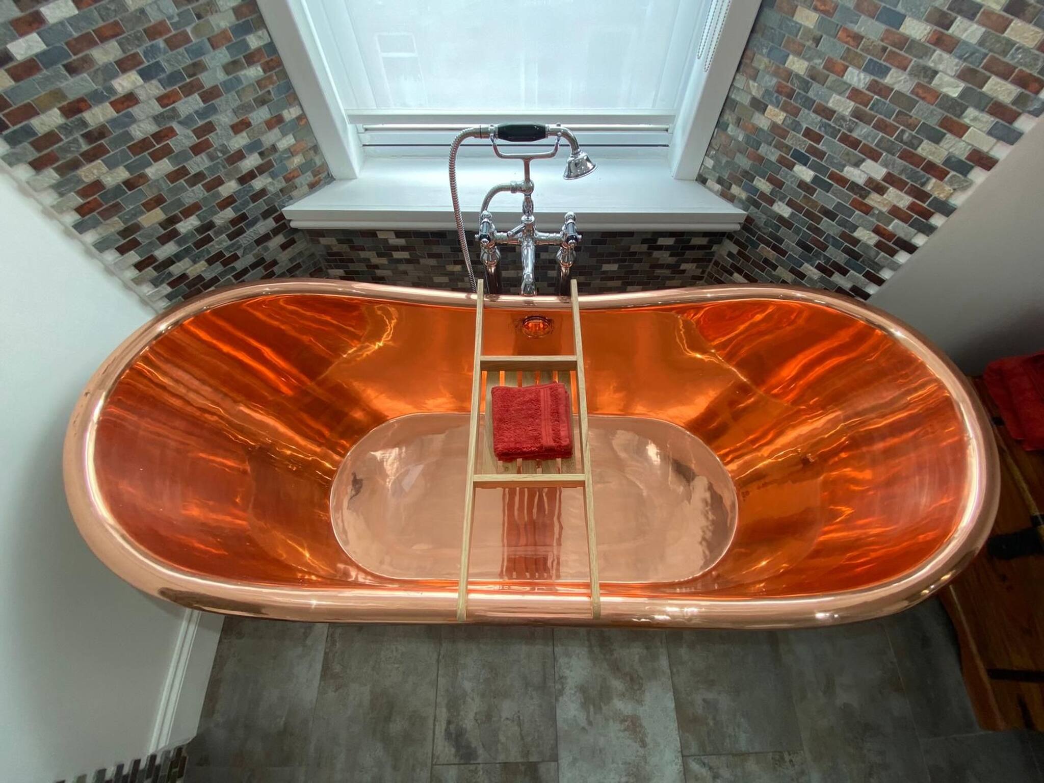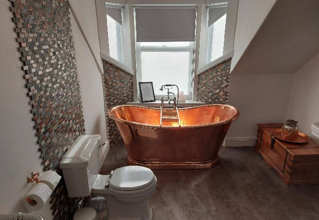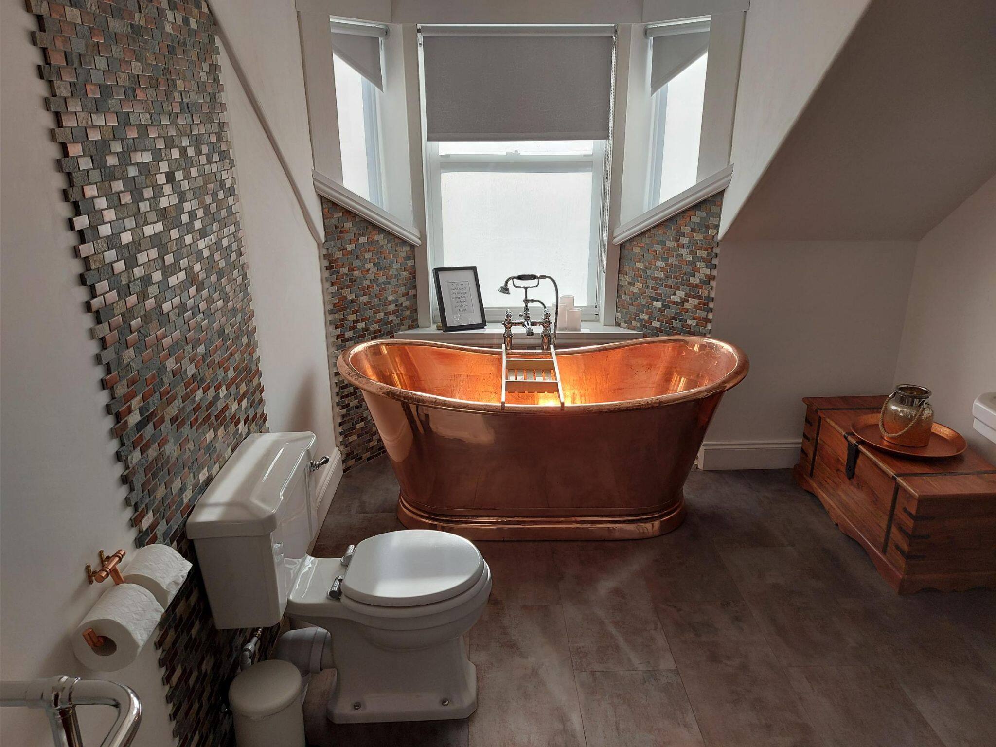 Luxurious, spacious bathroom with stunning freestanding copper bath