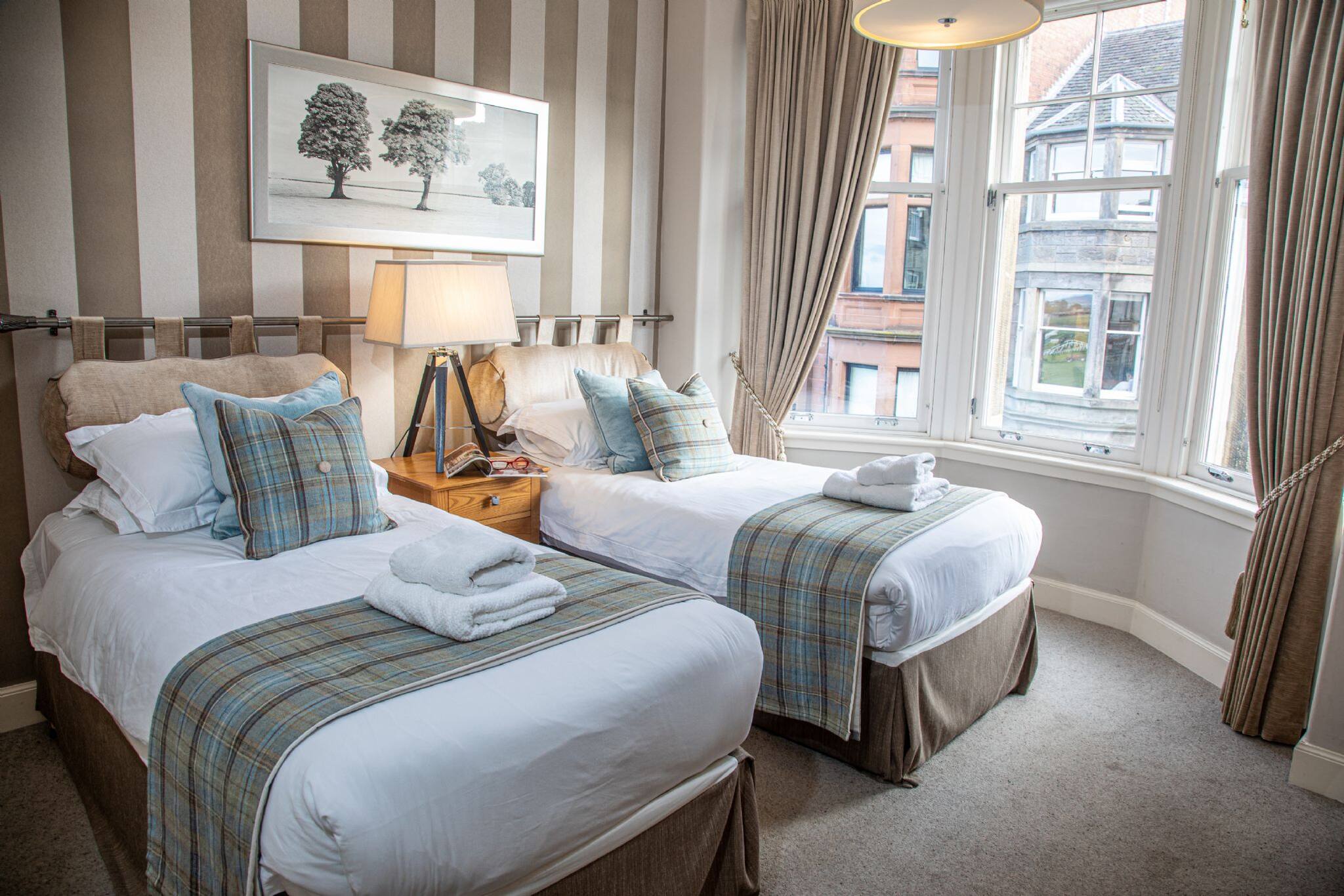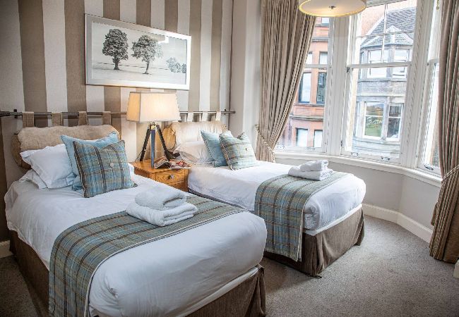 1 x twin bedroom with bay window, flat screen tv and built in wardrobes