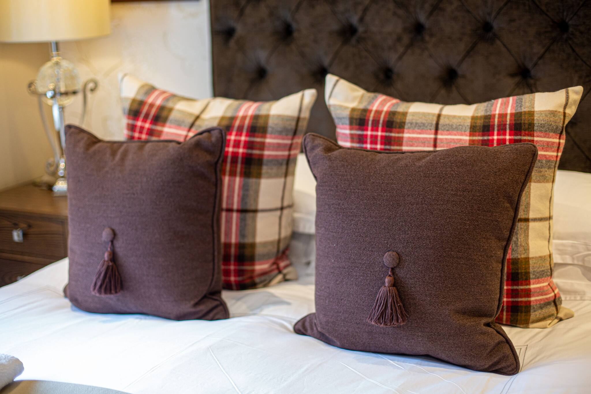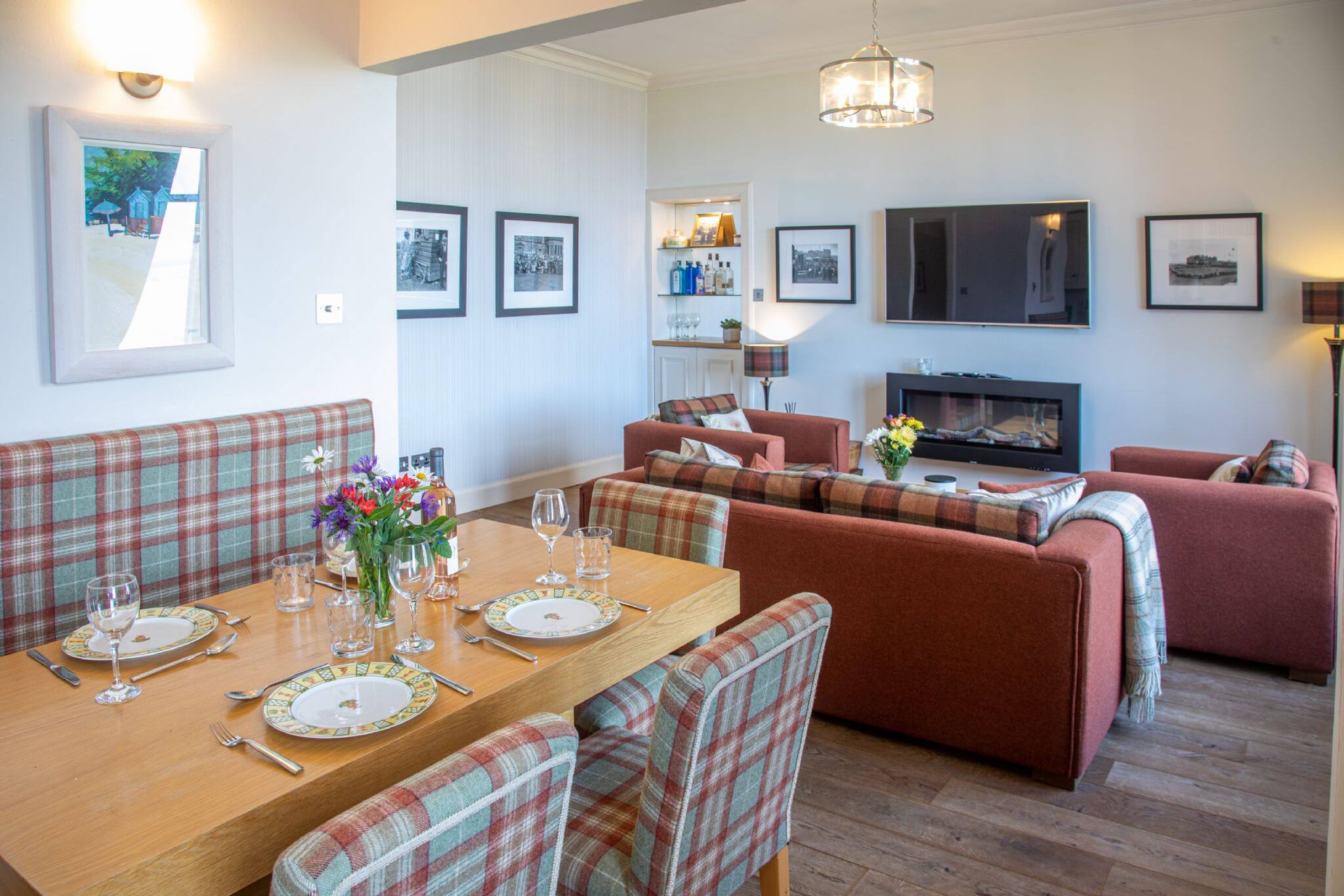 The hallway leads to the left towards the centrepiece of the home - a spacious and beautifully furnished open-plan living, kitchen and dining room. There is a delightful kitchen table with seating for 6, comfortable sofas and armchairs, as well as cushioned window seats to enable you to make the most of the view. There is a large wall-mounted flat screen tv and modern electric fireplace, to add warmth to this relaxing and multi-functional space. It is ideal for both entertaining and relaxing.