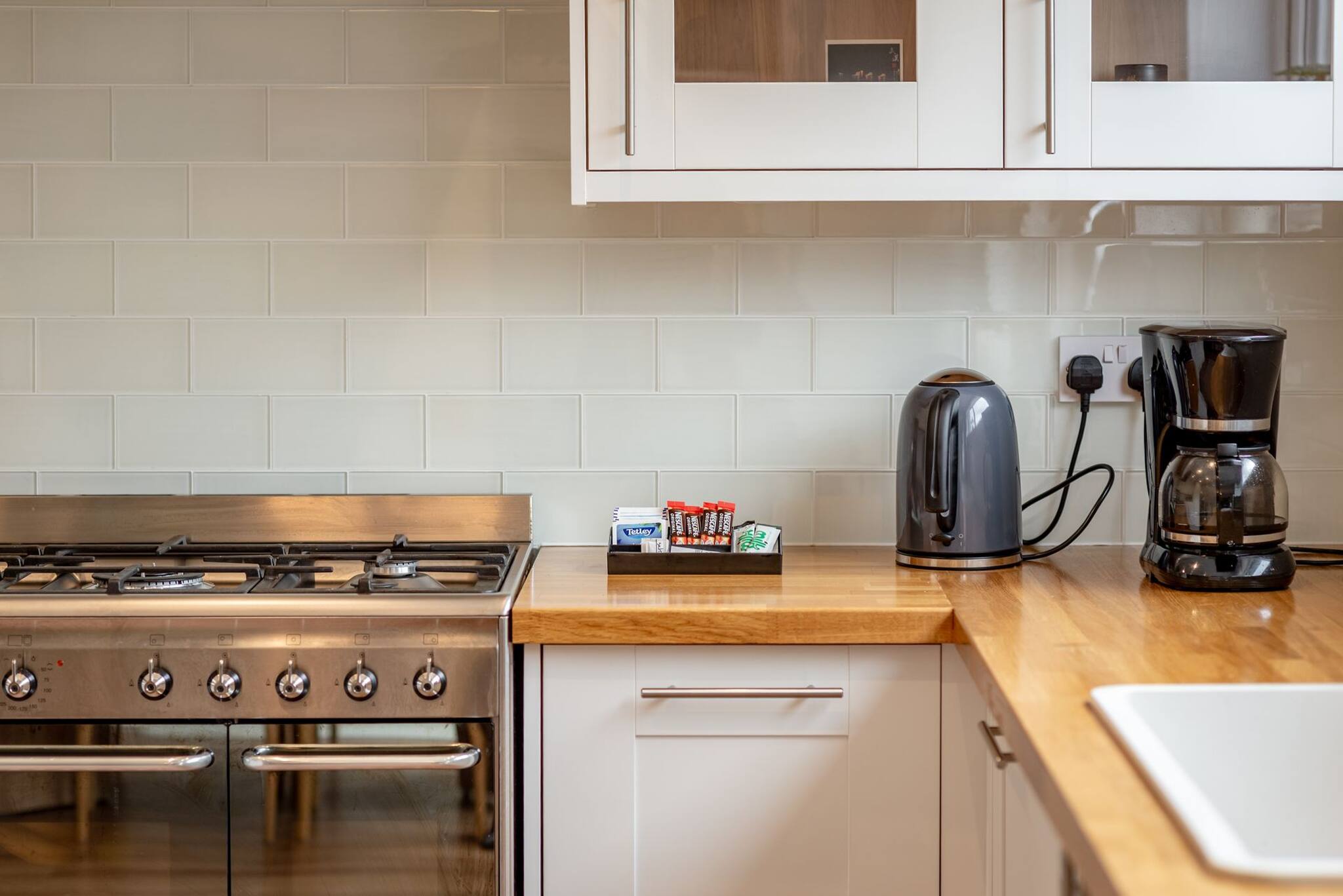 Fully Equipped Kitchen: Gas hob, oven, fridge, microwave, coffee machine, kettle, and all essential cookware