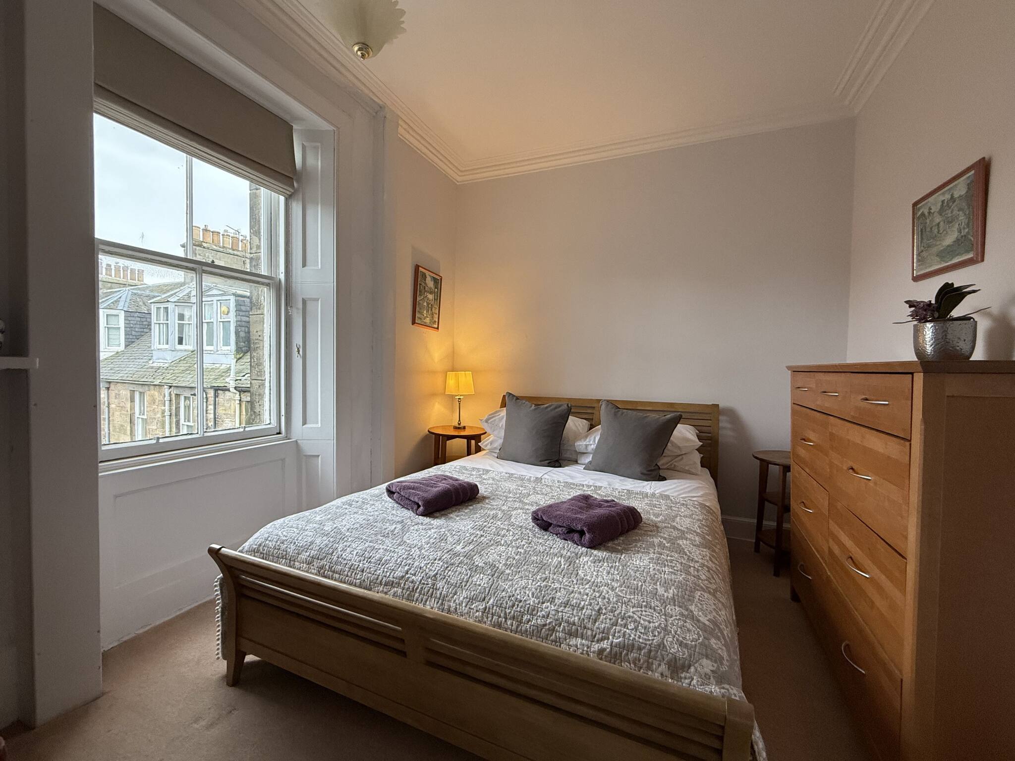 With abundant natural light, the spacious lounge, open-space kitchen and dining with access to the back garden, is an ideal base to explore St Andrews. This quiet 4 bed sanctuary includes one king sized bedroom with a modern en-suite shower, a further king-size bedroom, plus two single bedrooms. A pull-out bed is available for one of the single bedrooms, which can make it into a twin bed. The family bathroom has been upgraded with tasteful modern white vanity units and an overhead shower in the bath. Step into the serene private garden out back, where you can unwind and enjoy the lush green lawn. The property is a five minute car ride into Town and the golf courses, or a leisurely 25 minute quiet and picturesque walk through the Lade Braes into Town.